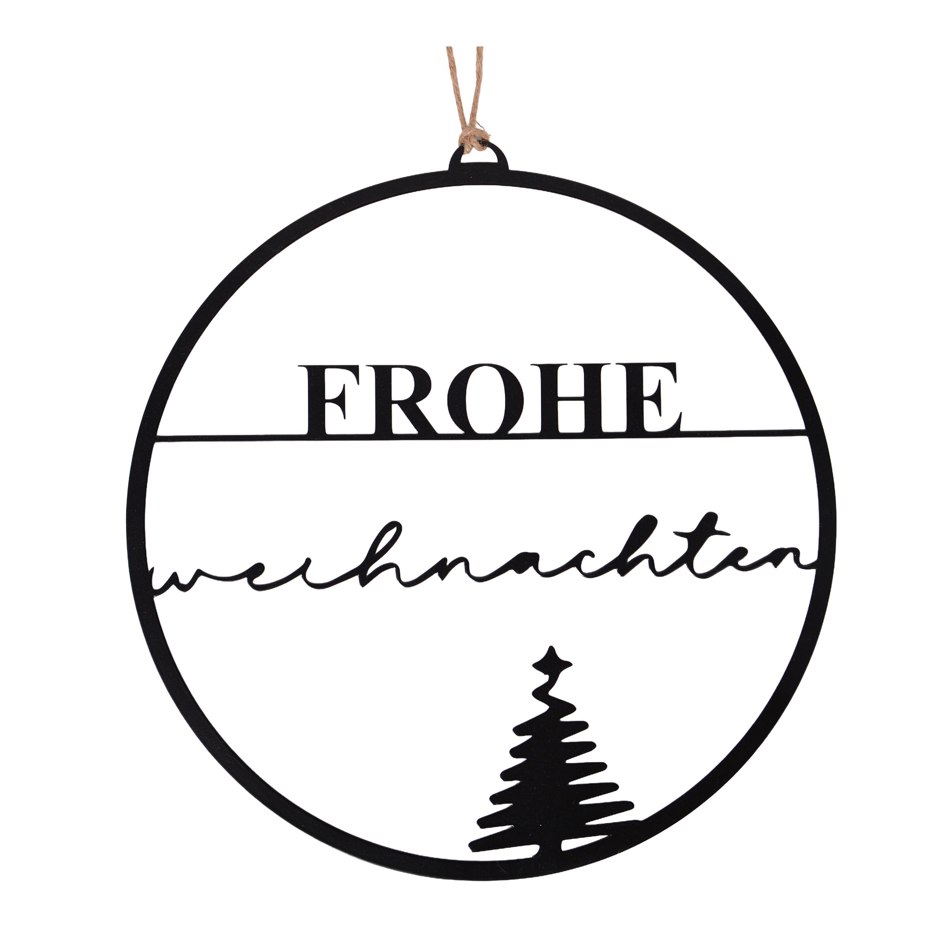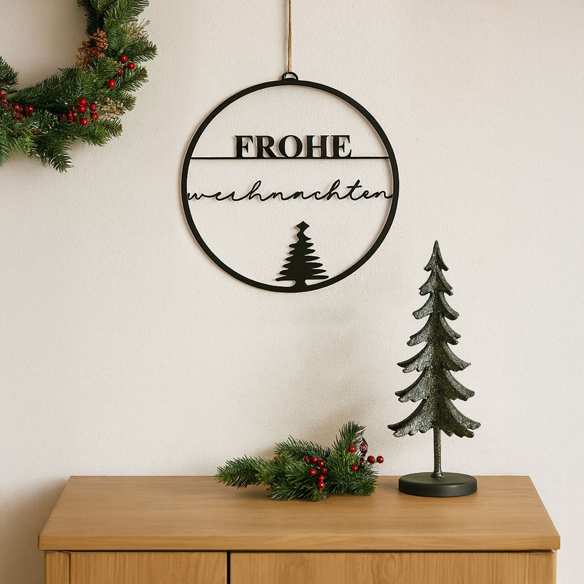 Mit dem runden UNUS® Aufhänger „Frohe Weihnachten“ holen Sie sich die festliche Stimmung der Adventszeit direkt ins Haus. Der elegante Schriftzug „Frohe Weihnachten“ und das stilisierte Tannenbaum-Motiv wirken modern und gleichzeitig klassisch – ideal für eine stilvolle Weihnachtsdeko.