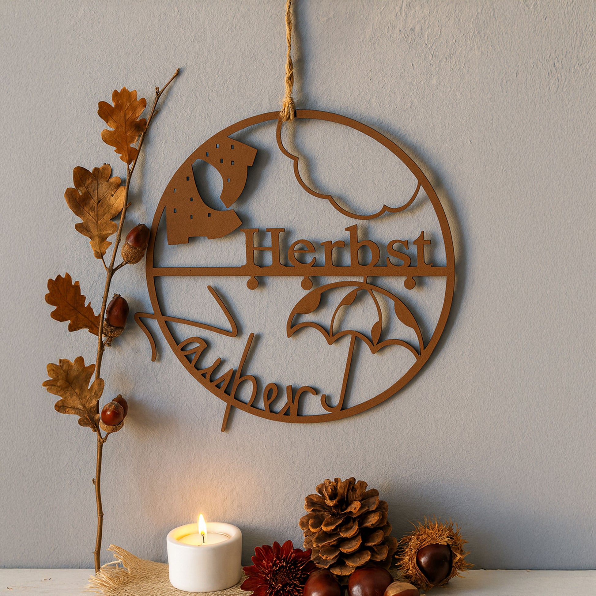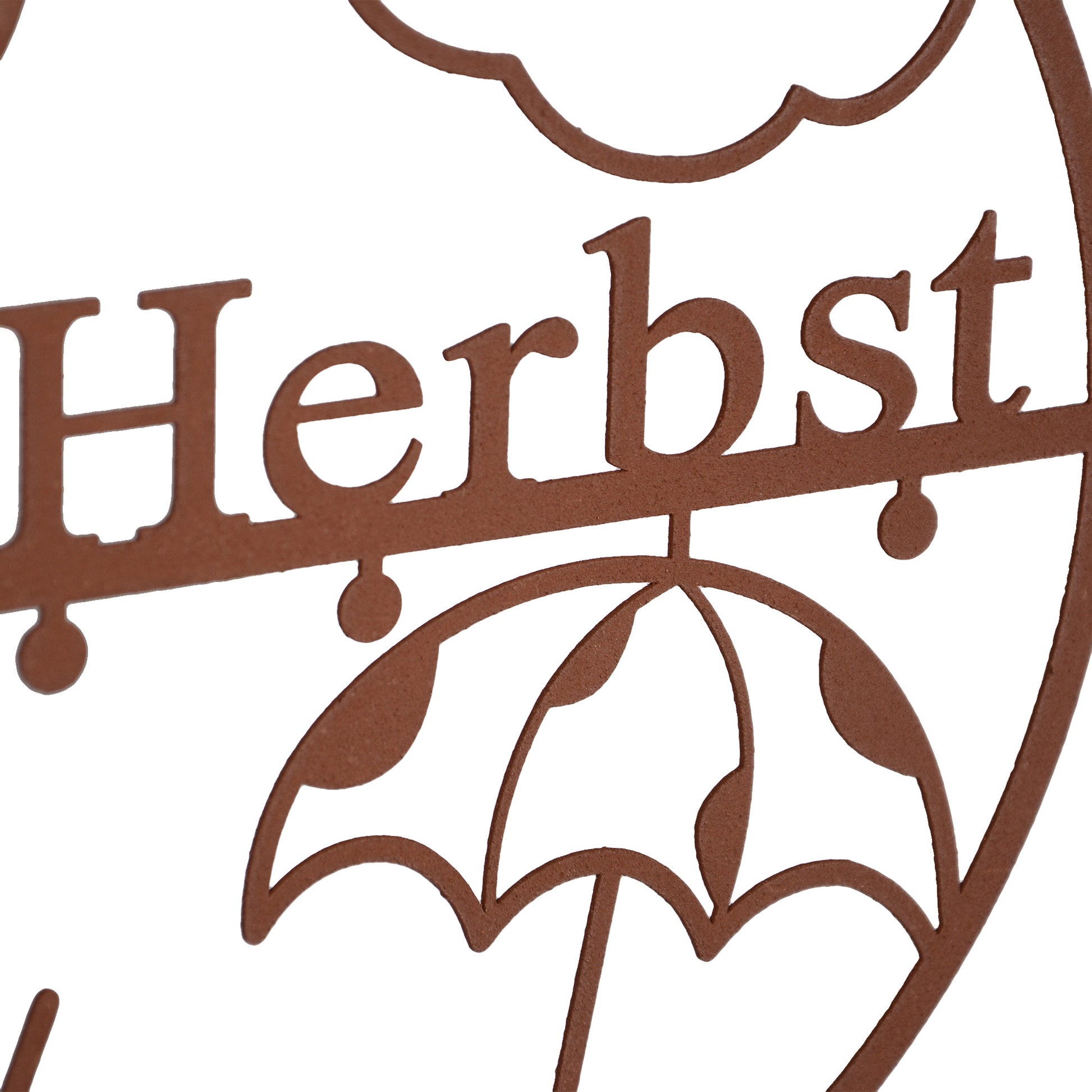 Mit ausgestanztem Schriftzug Herbst Zauber, Blättern, Wolke, Regentropfen und Schirm wird er zum stimmungsvollen Hingucker an Tür, Wand oder Fenster.