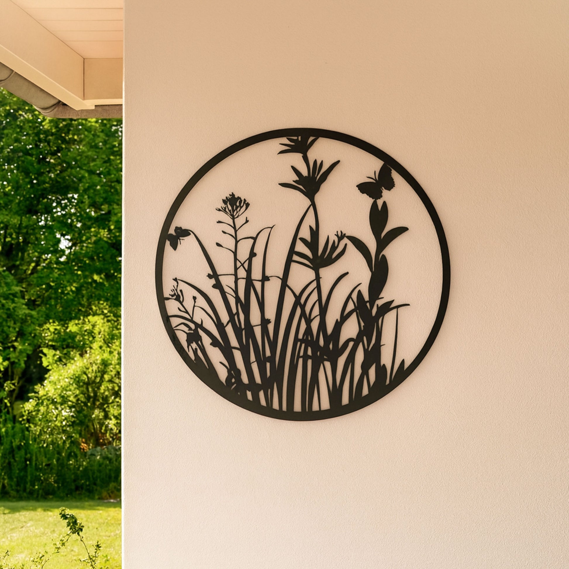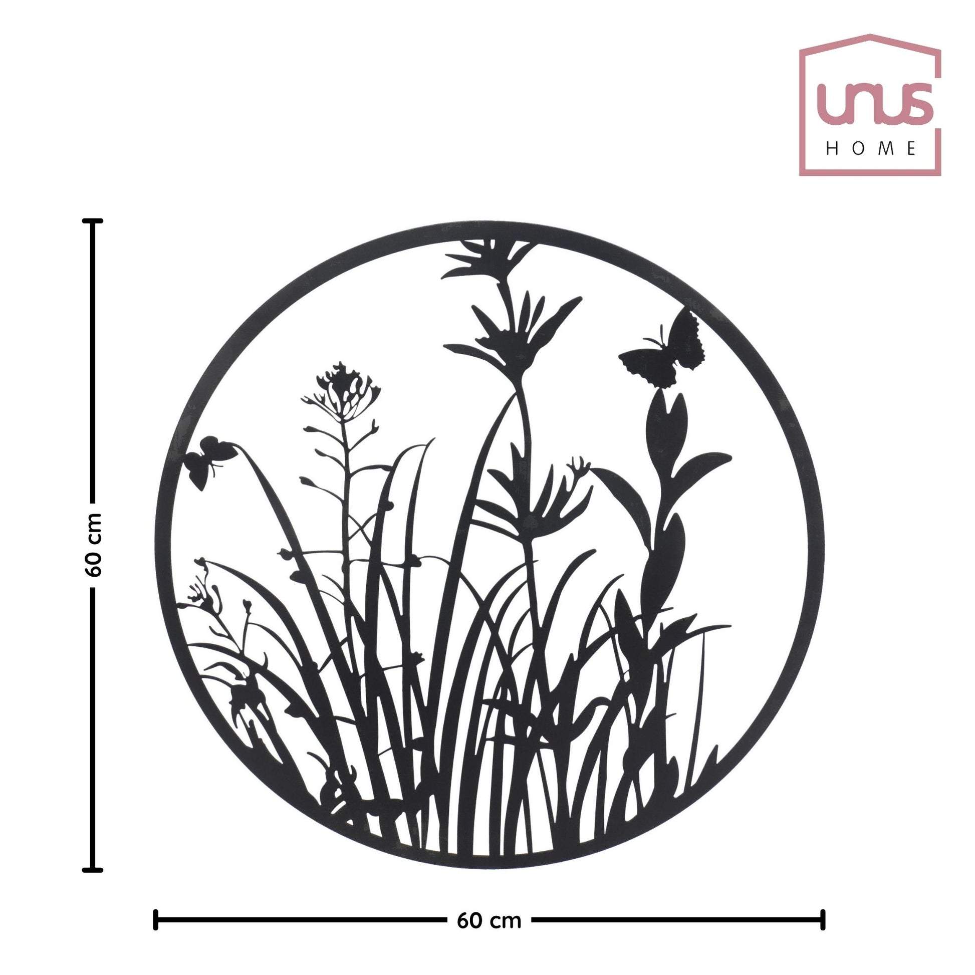 Bringen Sie Natürlichkeit und stilvolles Design an Ihre Wand: Der UNUS® Metall-Aufhänger überzeugt mit einem filigranen Pflanzenmotiv, das zeitlose Eleganz ausstrahlt. Mit einem Durchmesser von 60 cm ist er ein eindrucksvoller Blickfang, der sowohl im Innen- als auch im Außenbereich für dekorative Akzente sorgt.