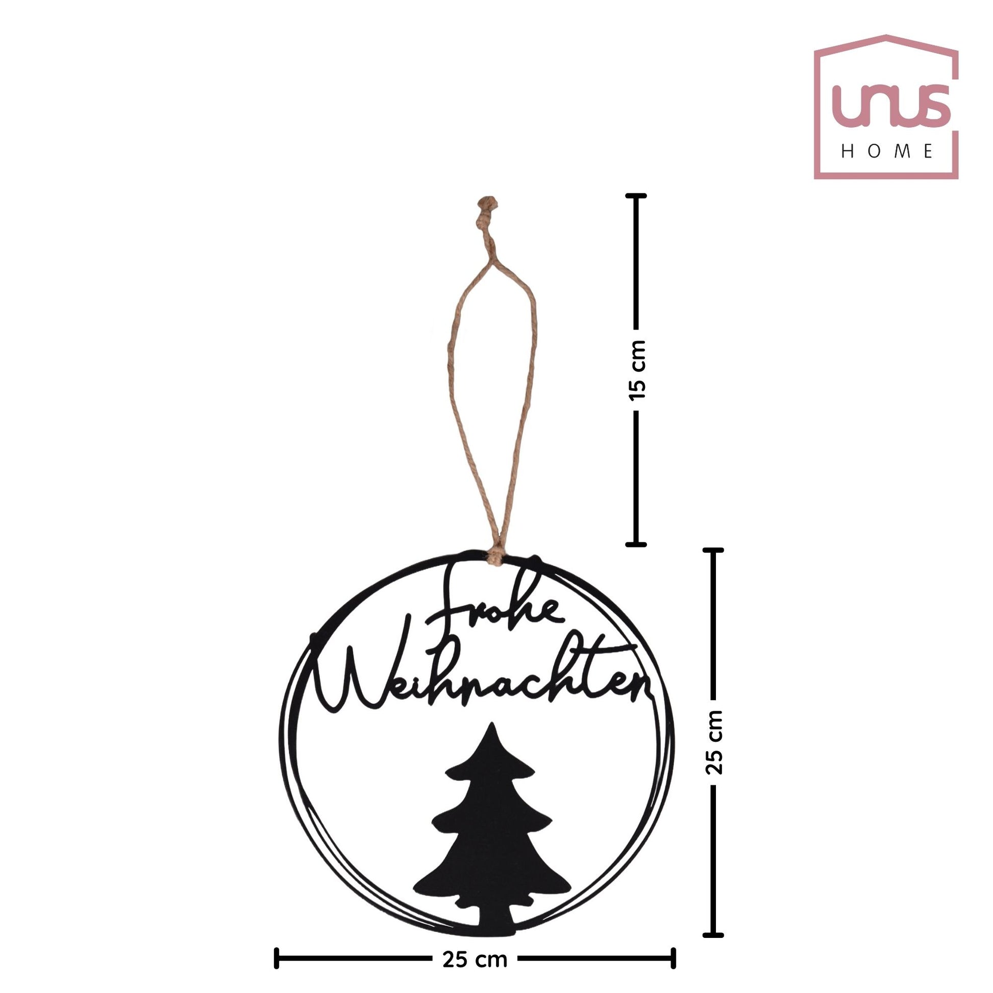 Diese stilvolle Weihnachtsdeko bringt festlichen Glanz in Ihr Zuhause: Der UNUS® Metall-Aufhänger mit dem Schriftzug „Frohe Weihnachten“ und einem dekorativen Tannenbaum vereint modernes Design mit weihnachtlicher Wärme. Mit seinem Durchmesser von 25 cm eignet sich der Aufhänger perfekt für Türen, Wände oder Fenster.
