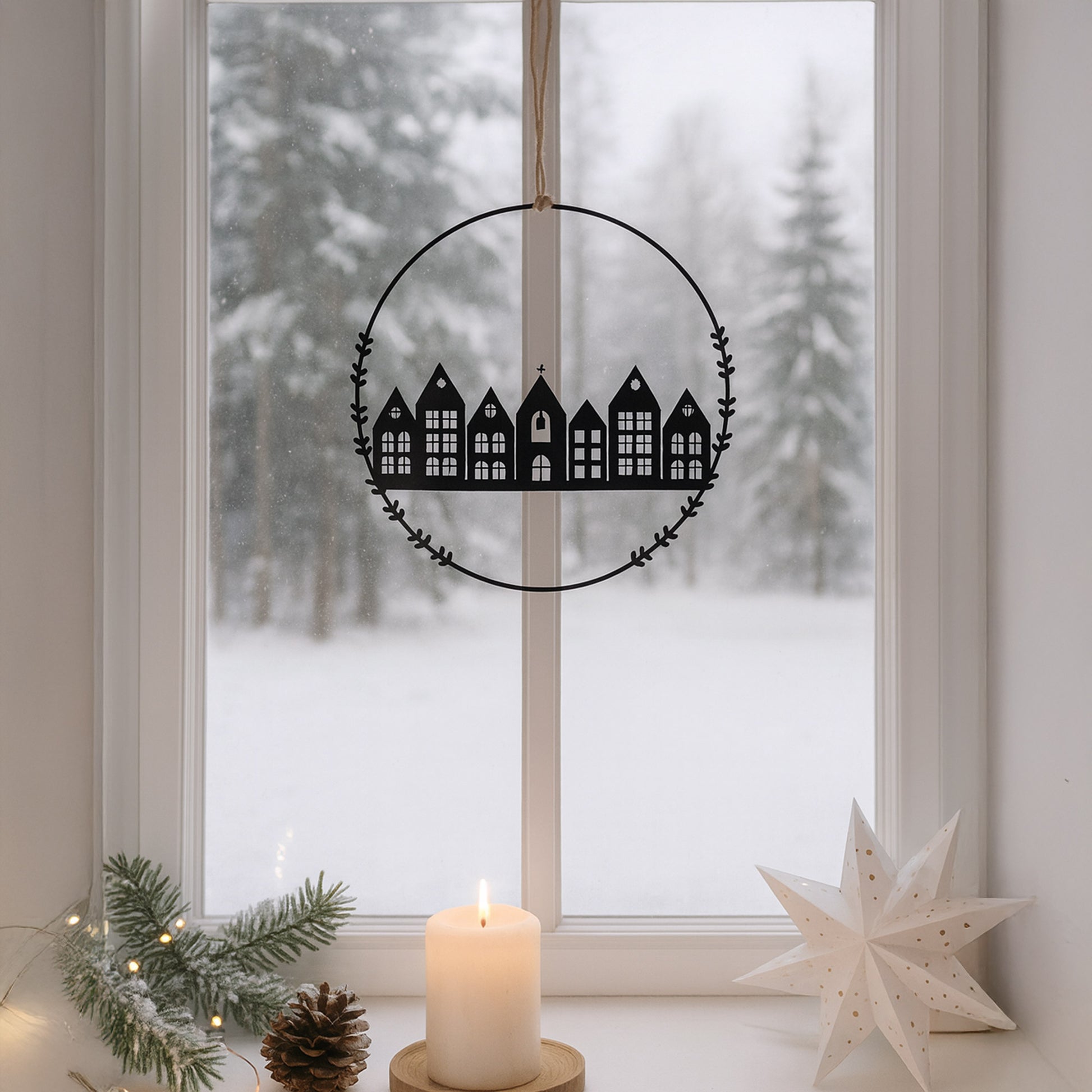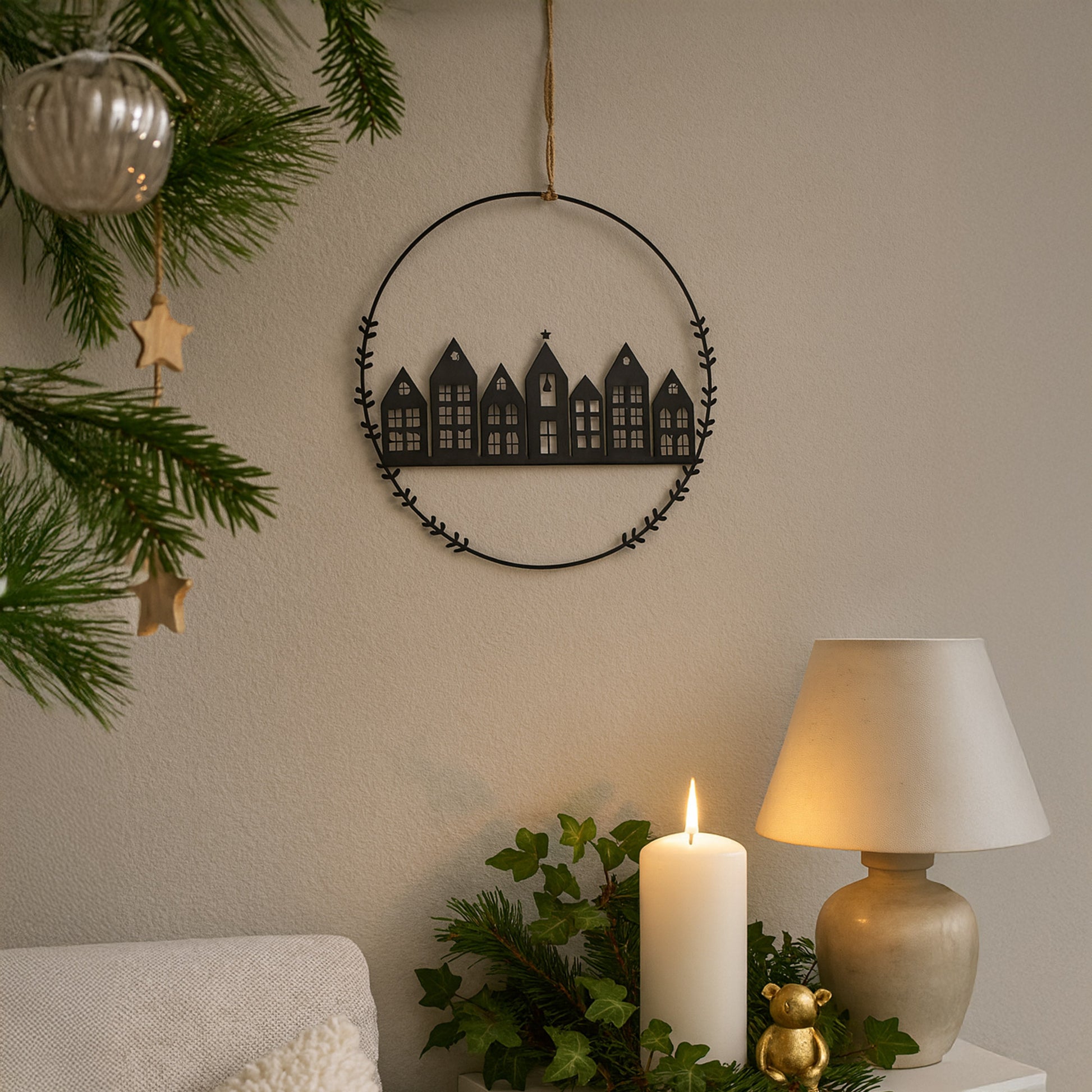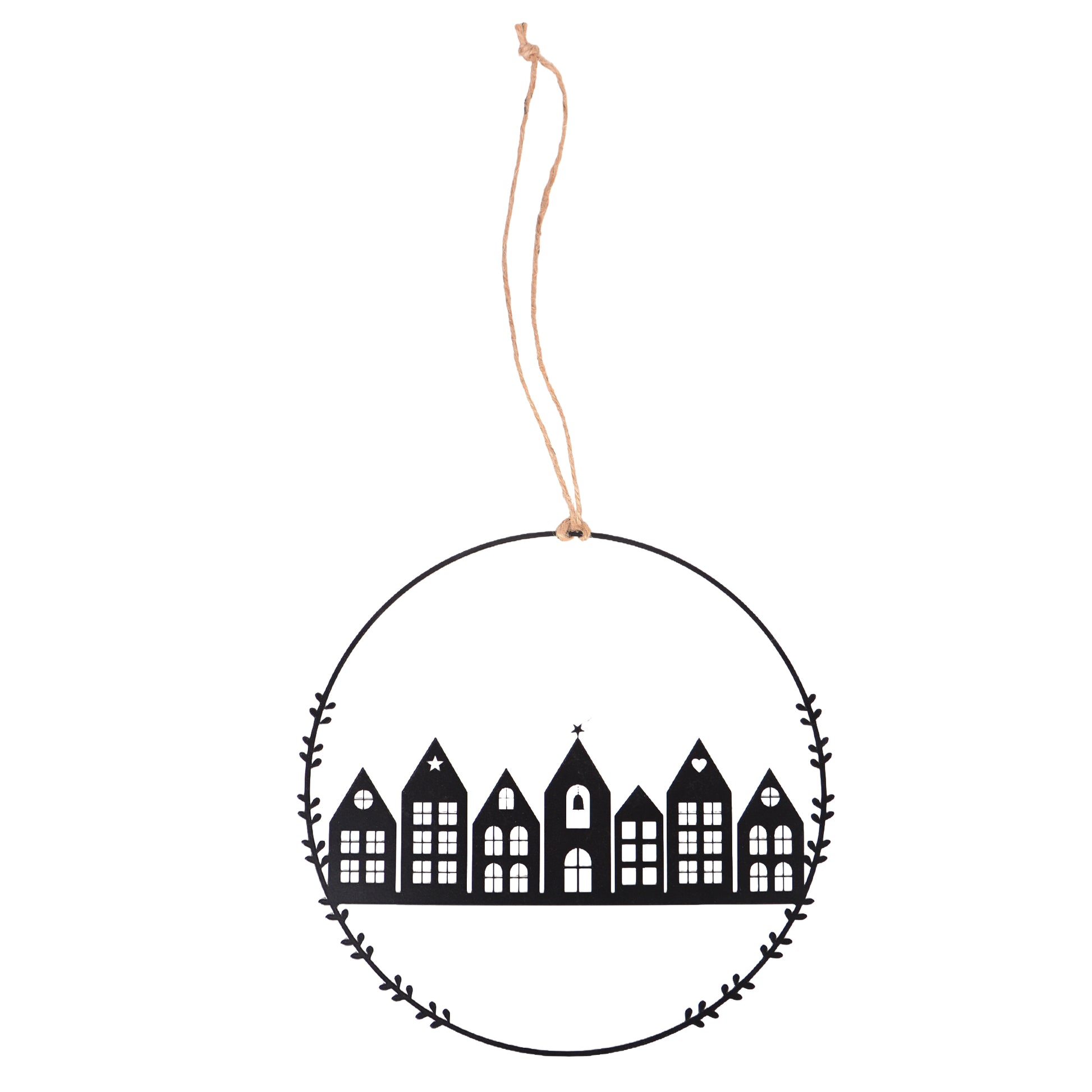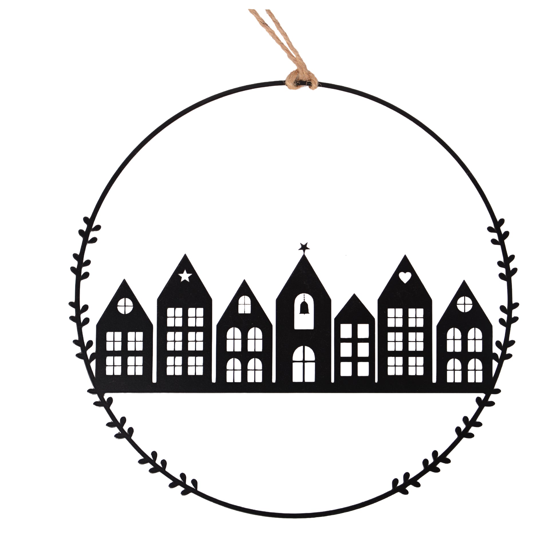 Verleihe deinem Zuhause einen Hauch von Eleganz mit diesem dekorativen Metallring im runden Design. Die detailreiche Silhouette einer kleinen Häuserreihe wird von einem schlichten Ring eingefasst und erhält durch das schwarze Metall eine zeitlos stilvolle Ausstrahlung.