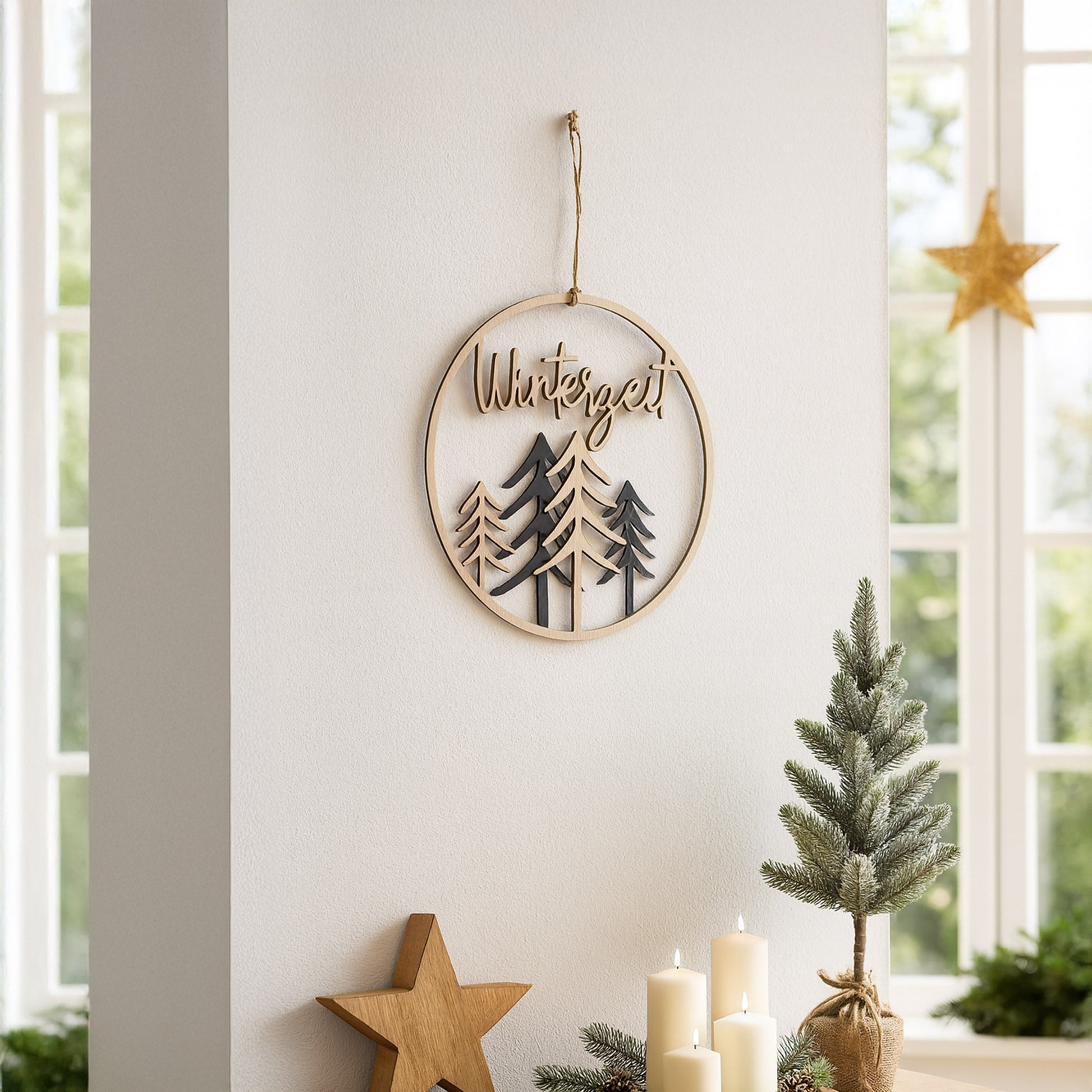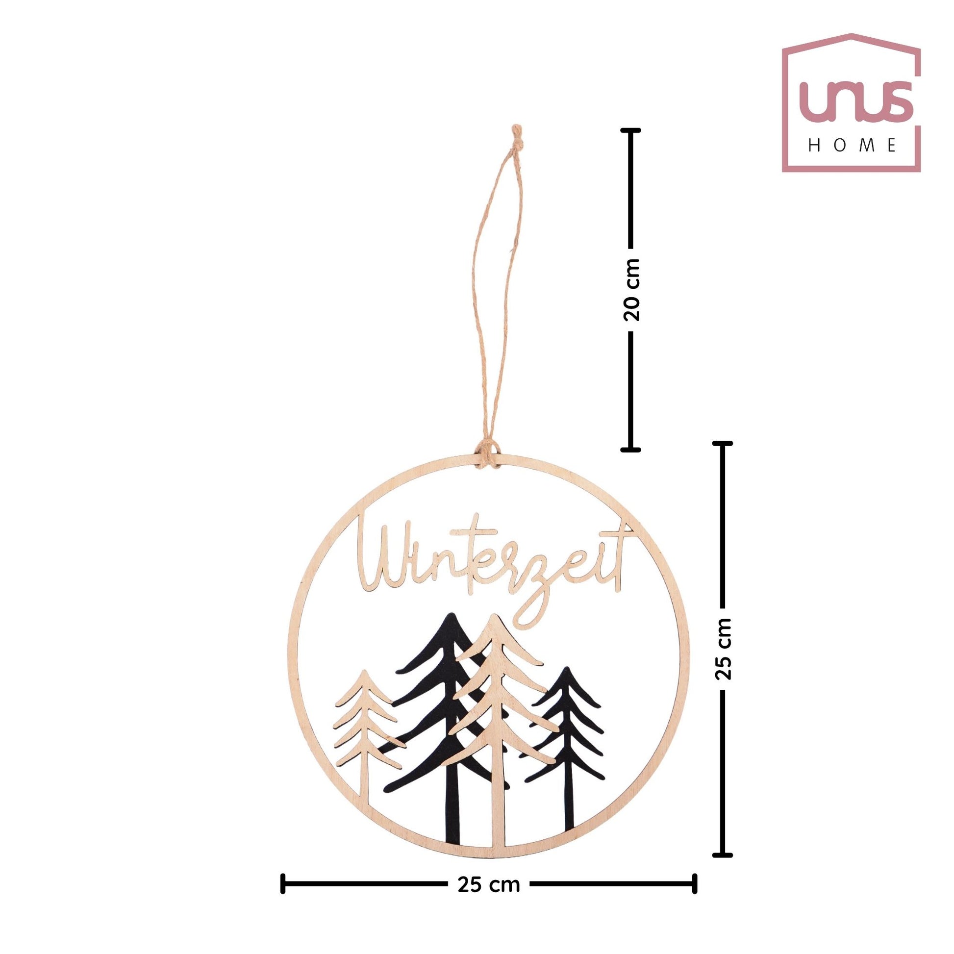 Mit dem runden UNUS® Winterzeit-Aufhänger holen Sie sich die ruhige Schönheit der kalten Jahreszeit direkt ins Haus. Der elegante Schriftzug „Winterzeit“ und die stilisierten Tannenbäume im skandinavischen Design wirken modern und gleichzeitig natürlich – ideal für eine ruhige, stilvolle Winterdeko.