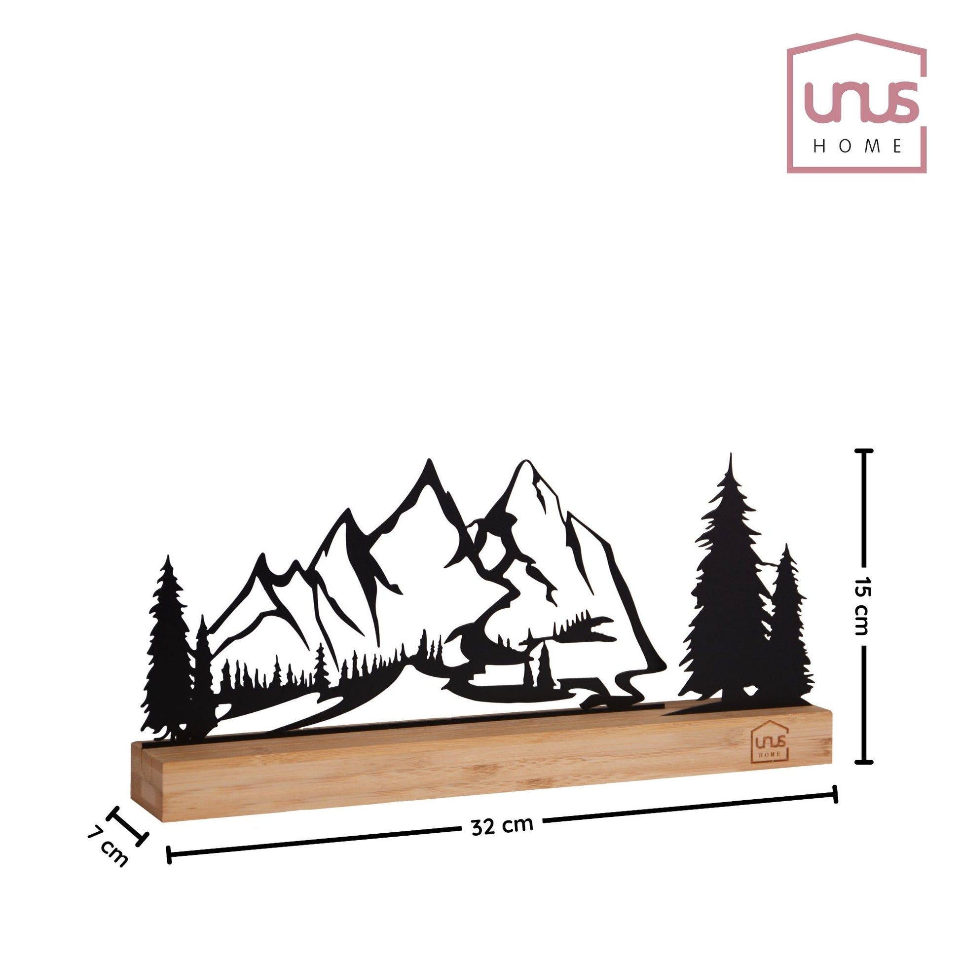 Bringen Sie mit diesem dekorativen Aufsteller eine atemberaubende Berglandschaft in Ihre vier Wände. Die kunstvoll gestalteten Silhouetten aus Metall zeigen majestätische Berge, Bäume und einen Flusslauf, die auf einem stabilen Bambus-Sockel stehen. Die Kombination aus natürlichem Bambus und elegantem Metall macht diesen Aufsteller zu einem stilvollen Hingucker in jedem Raum.