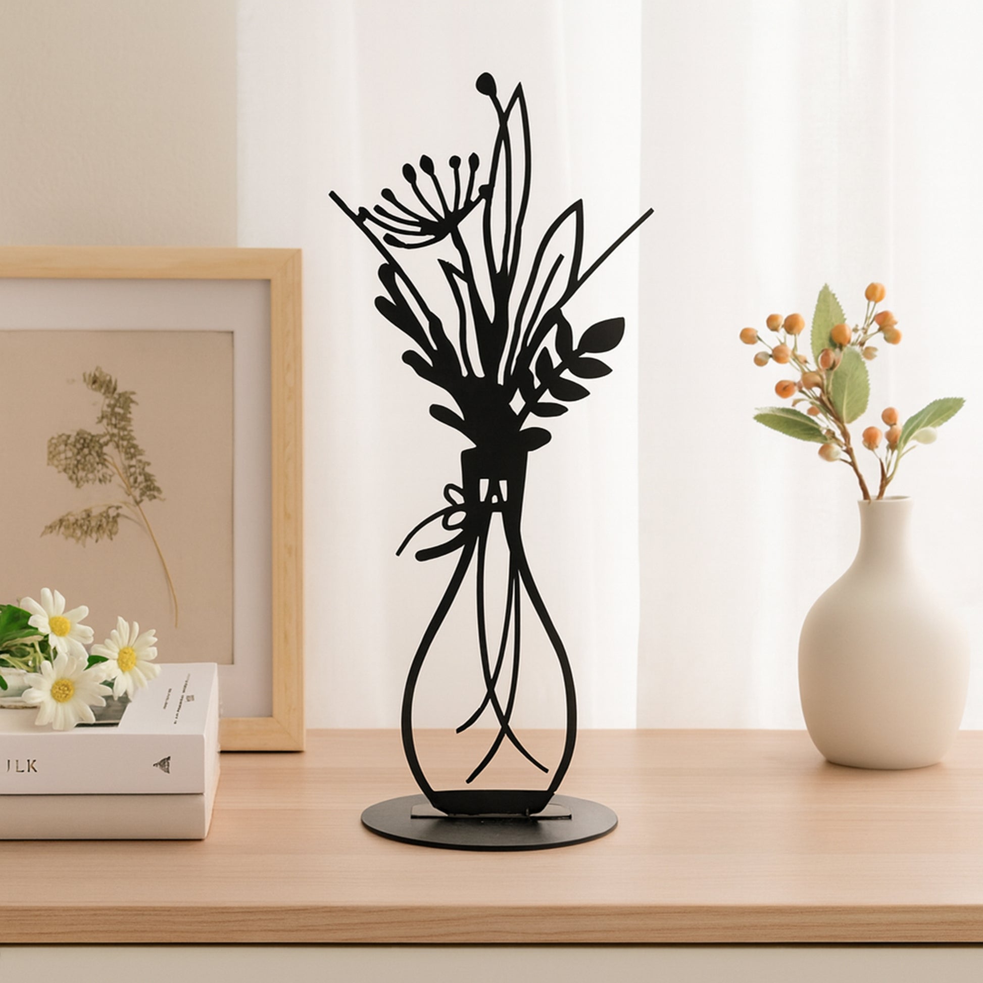 Der Metallaufsteller setzt dezente, stilvolle Akzente und bringt ein modernes, ruhiges Flair in Ihr Zuhause – ganz ohne Aufwand.