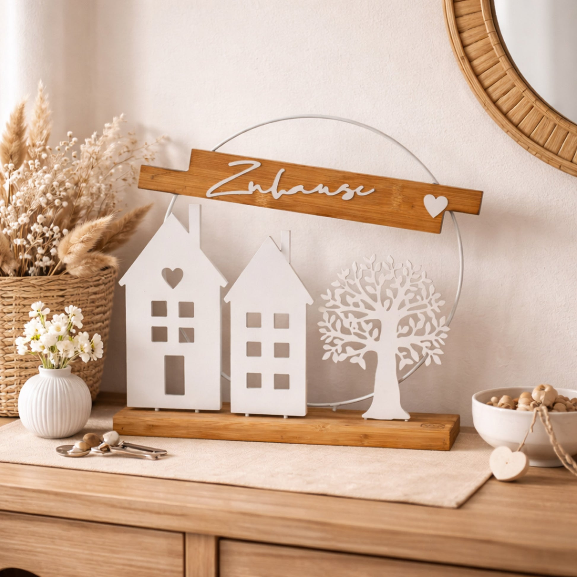 - DESIGN: Filigrane Häuser, Baum und "Zuhause"-Schriftzug für ein warmes Ambiente