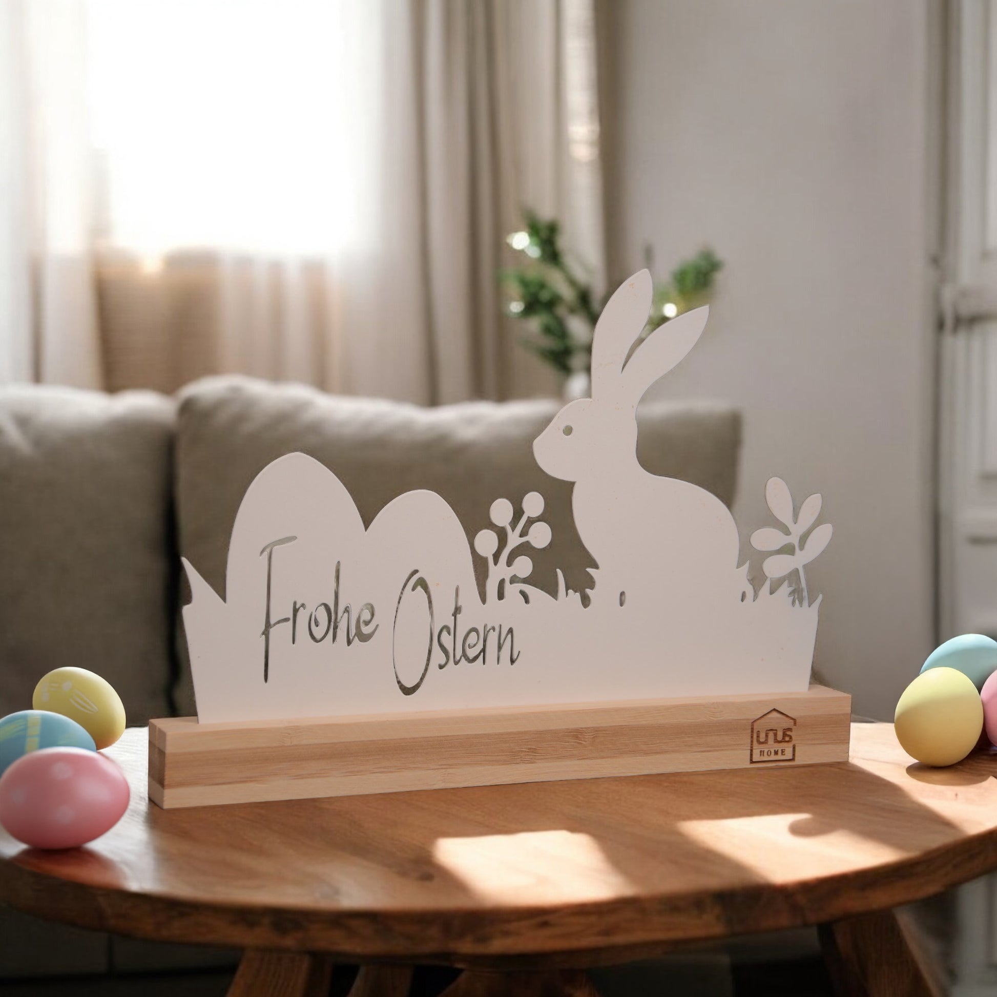 Ob auf der Fensterbank, dem Tisch oder dem Sideboard, dieser liebevoll gestaltete Aufsteller setzt überall frische Osterakzente. Der niedliche Hase, umgeben von Ostereiern und zarten Pflanzen, bringt eine fröhliche Atmosphäre in Ihr Zuhause.