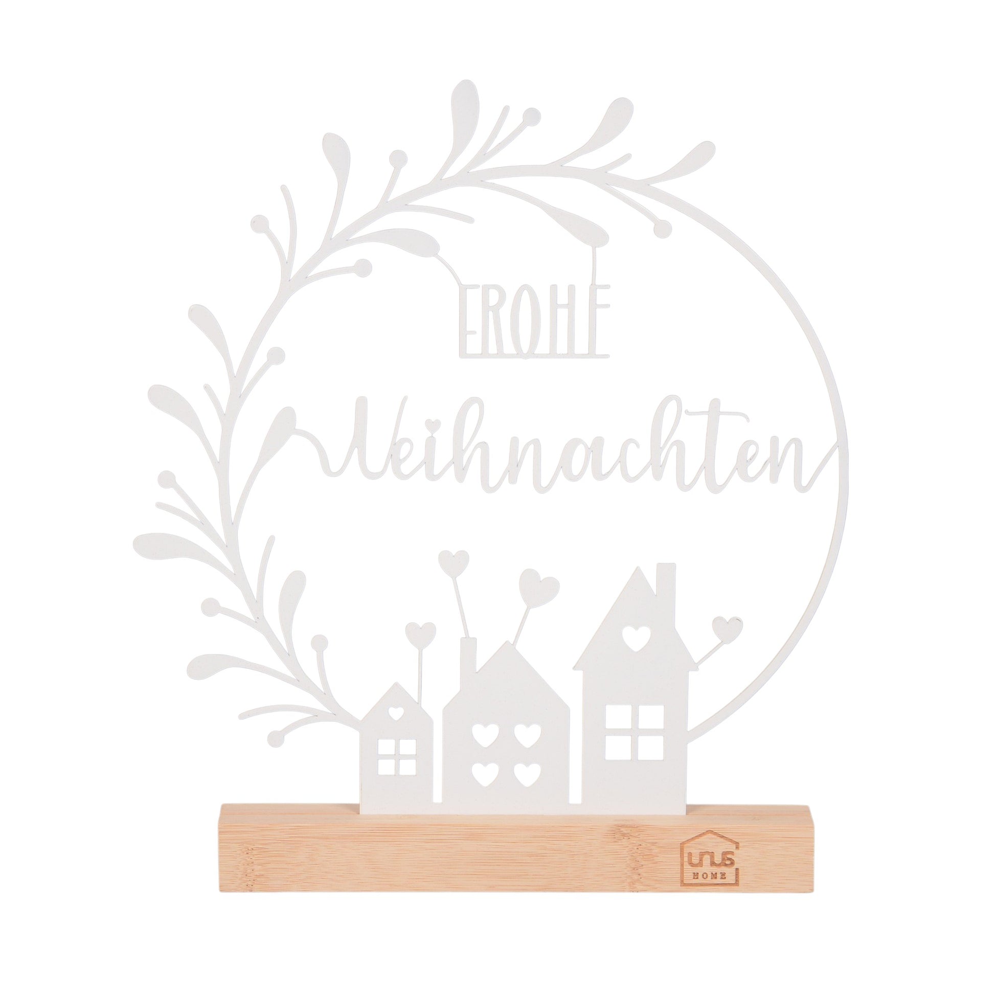 Der UNUS® Aufsteller Frohe Weihnachten ist eine liebevoll gestaltete Dekoration, die Herz und Auge gleichermaßen erfreut. Der detailreiche Schriftzug wird von einem floralen Bogen und drei kleinen Häusern begleitet – ein winterliches Deko-Highlight mit viel Charme.