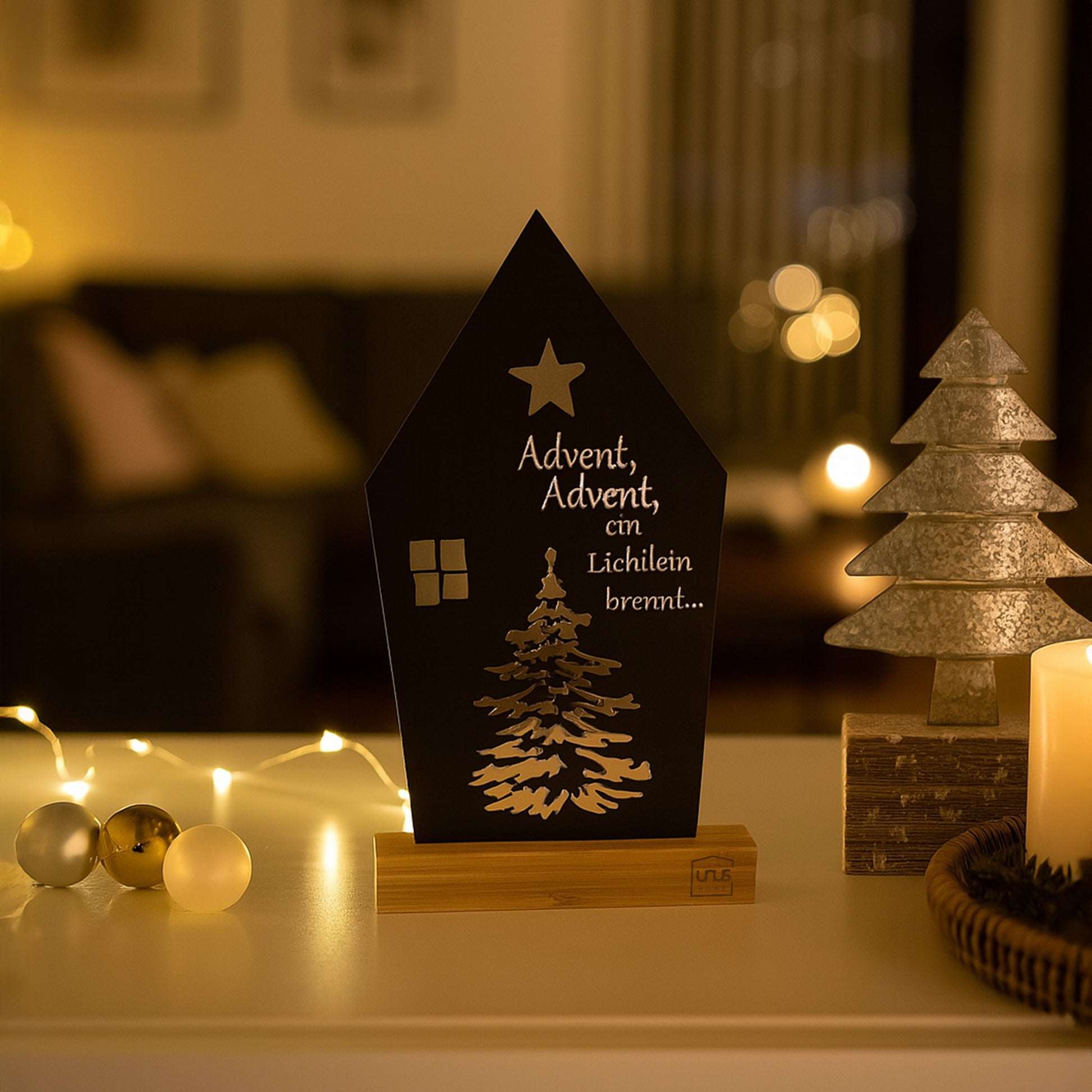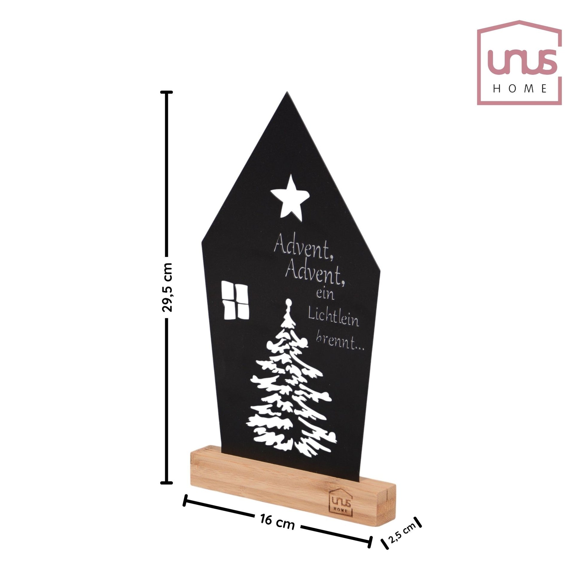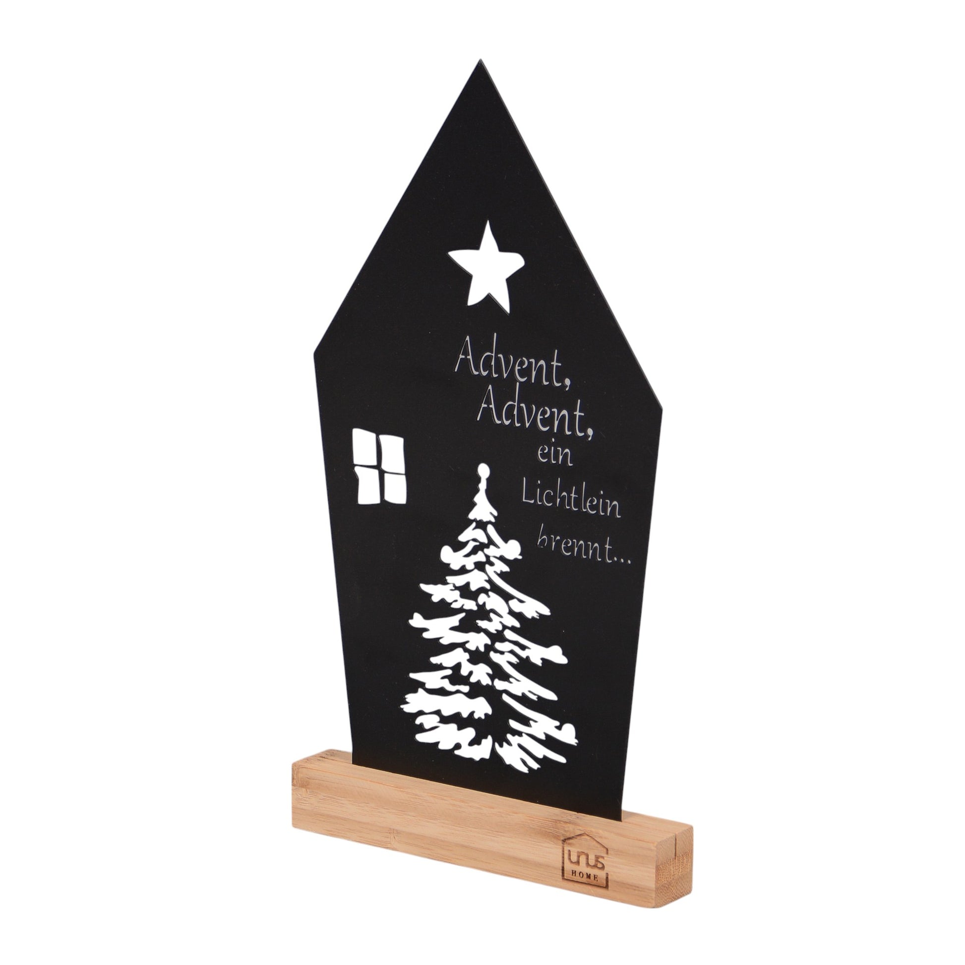 Mit dem „Advent, Advent“ holen Sie sich die besinnliche Vorweihnachtszeit in Ihr Zuhause. In Form eines Hauses gestaltet, kombiniert das Design einen klassischen Spruch mit einem stilisierten Fenster, einem Baum und einem Stern – schlicht und ausdrucksstark zugleich.