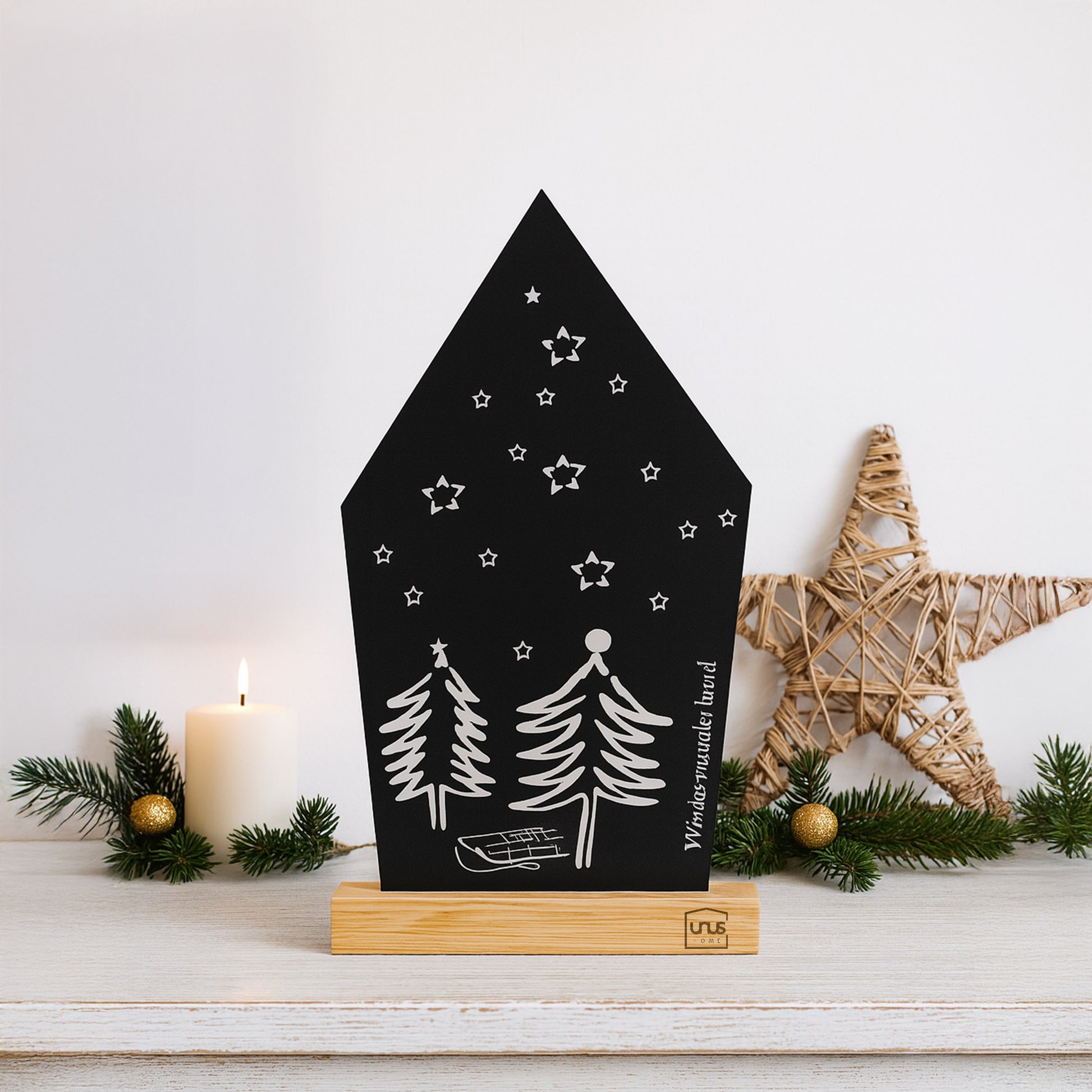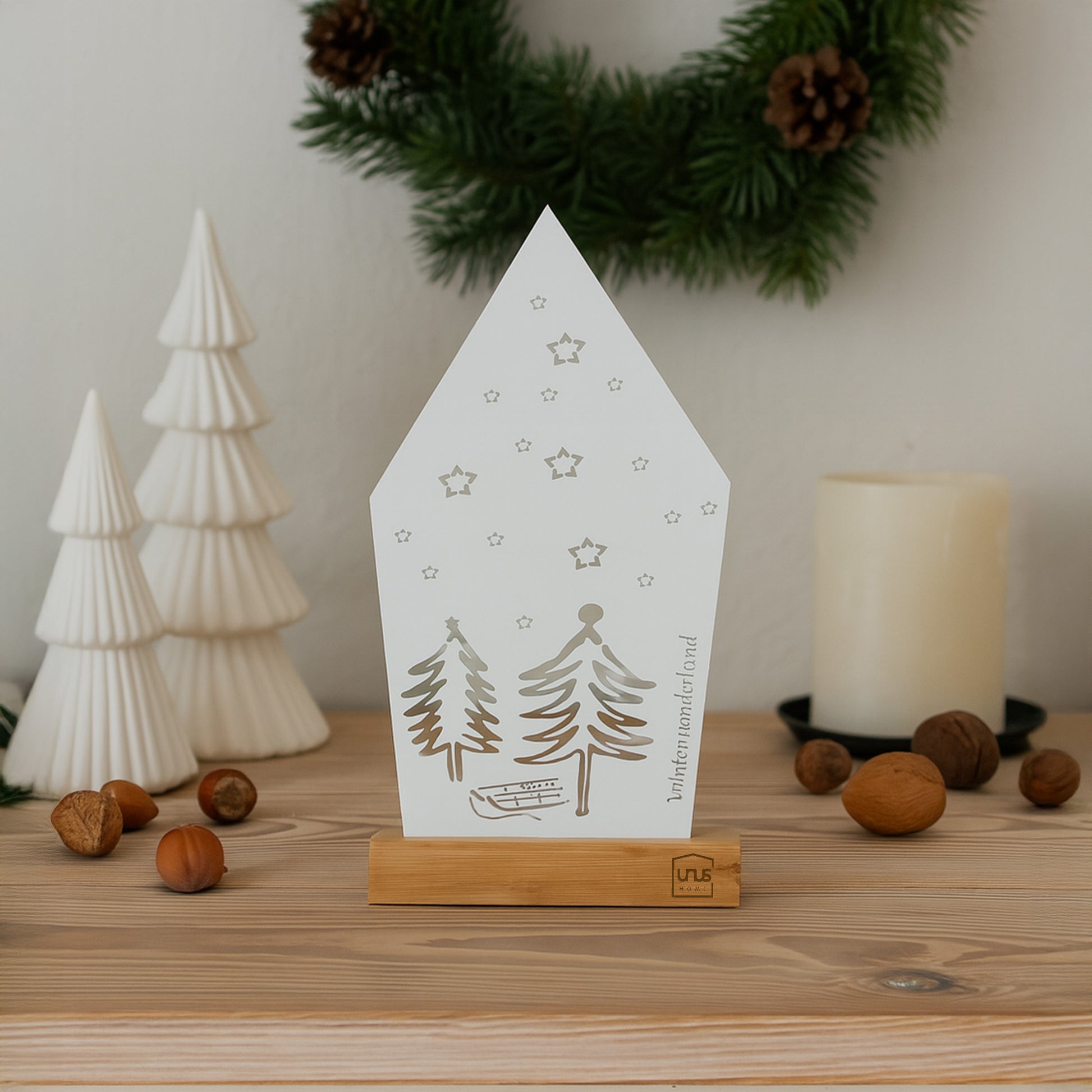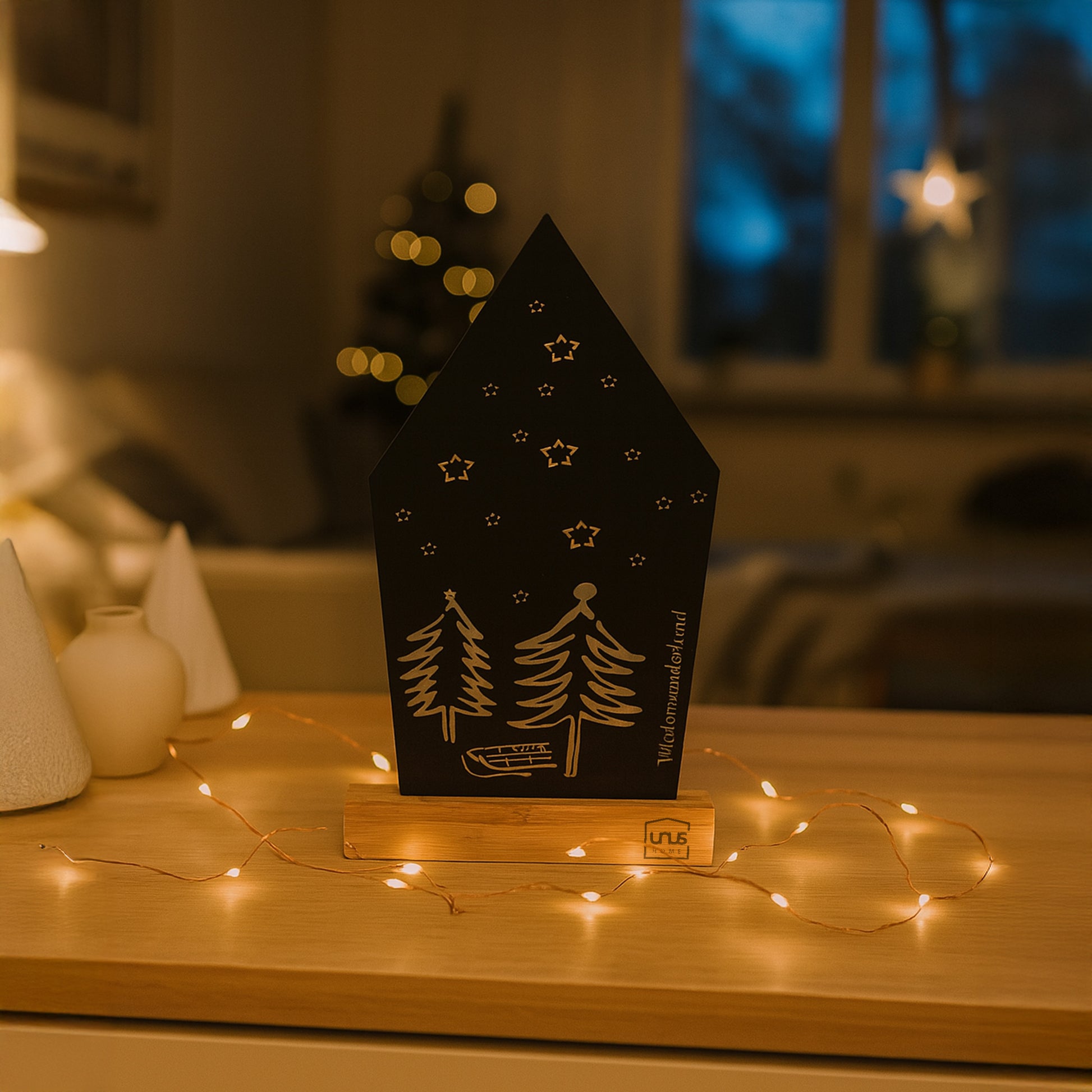 Der Aufsteller „Winterwonderland“ bringt winterliche Magie in Ihr Zuhause. In Hausform gestaltet, zeigt er zwei stilisierte Tannenbäume, einen Schlitten und einen funkelnden Sternenhimmel – eine ruhige Szene, die sofort Gemütlichkeit ausstrahlt.