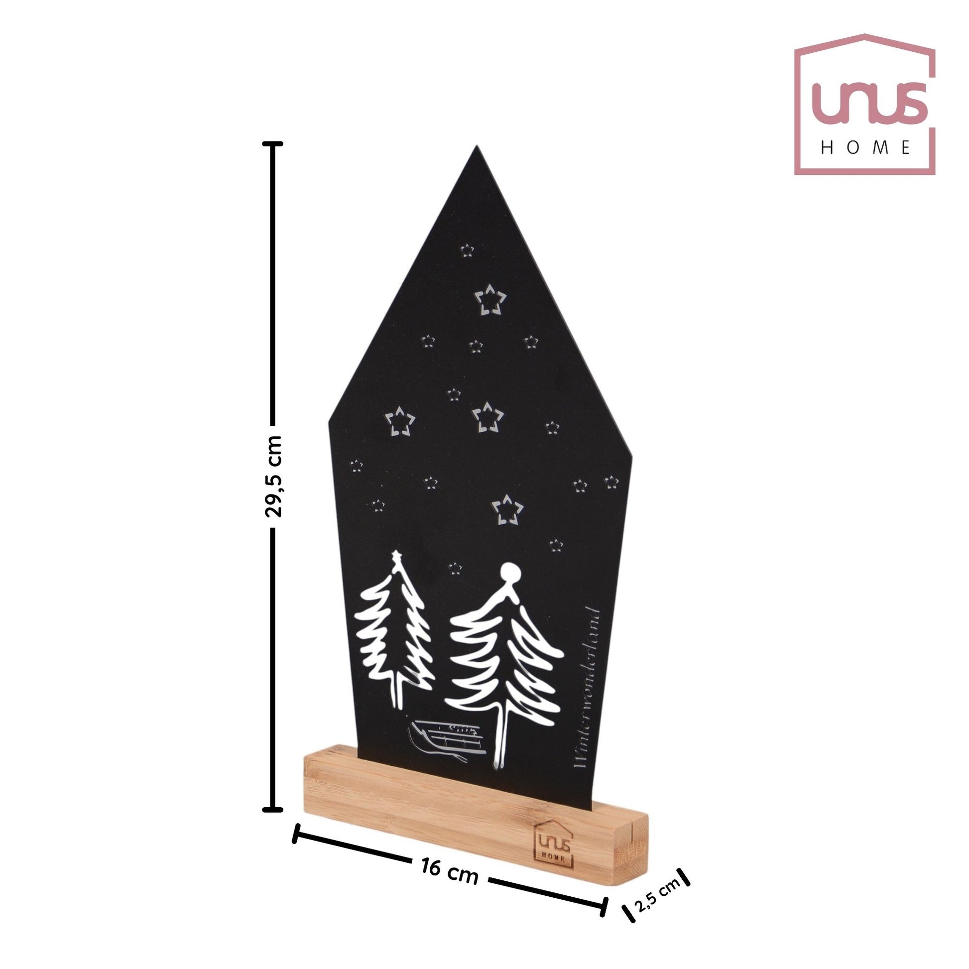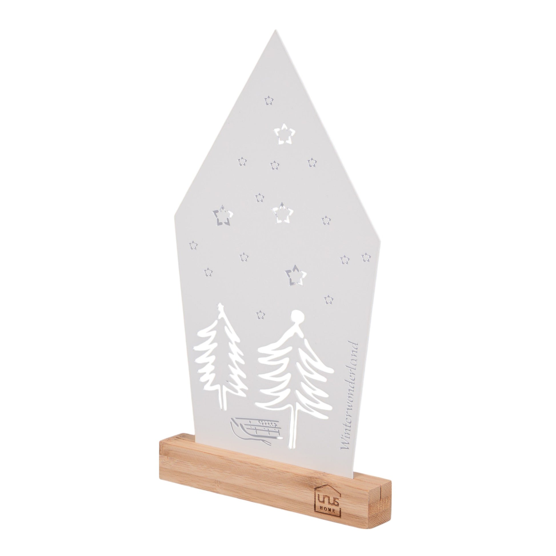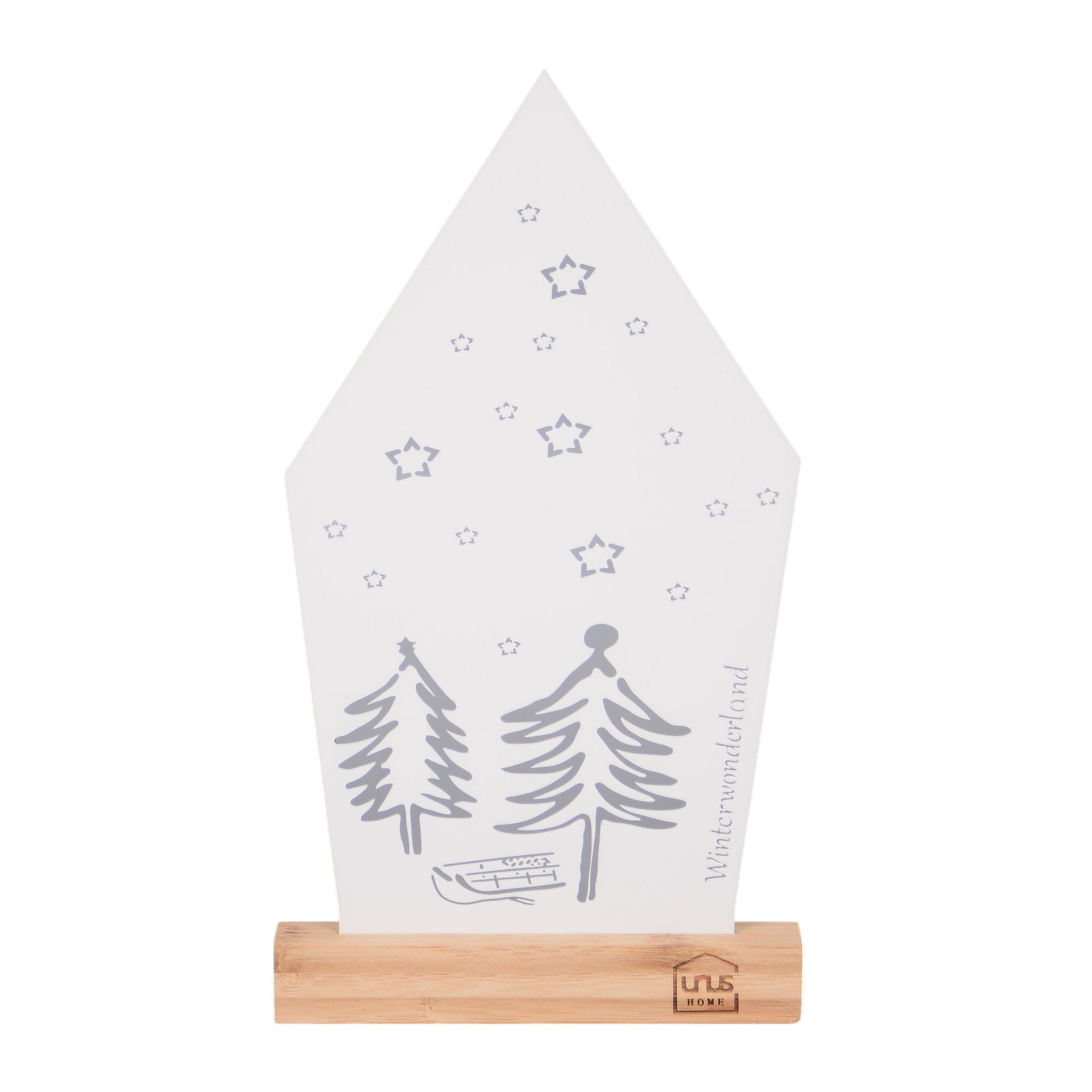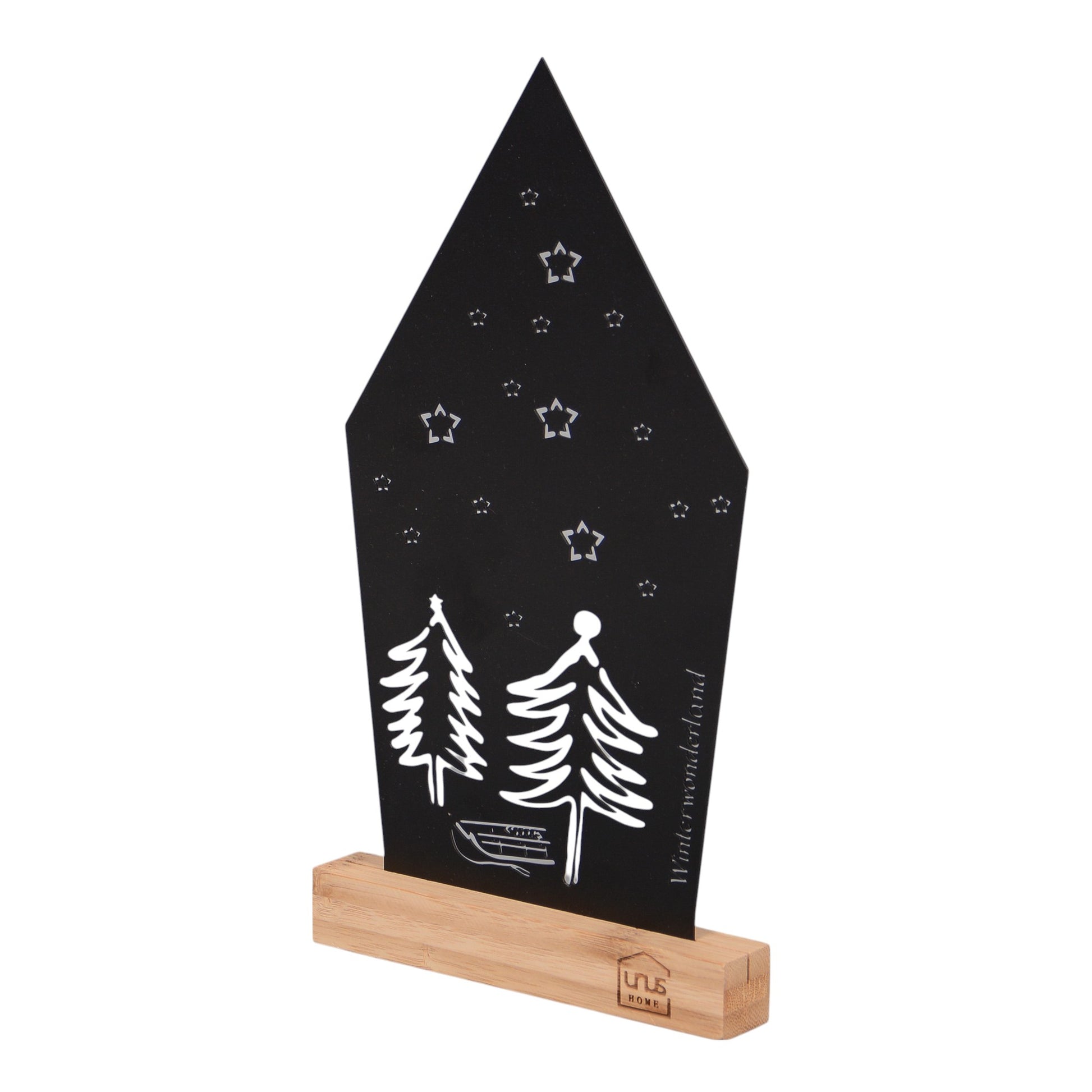 Der Aufsteller „Winterwonderland“ bringt winterliche Magie in Ihr Zuhause. In Hausform gestaltet, zeigt er zwei stilisierte Tannenbäume, einen Schlitten und einen funkelnden Sternenhimmel – eine ruhige Szene, die sofort Gemütlichkeit ausstrahlt.