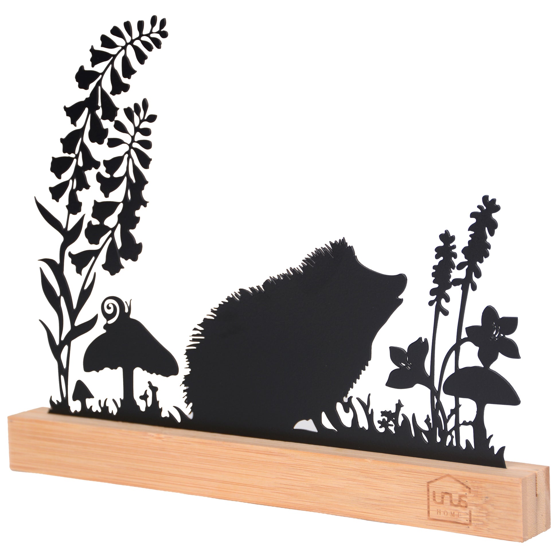 Ein Hauch von Natur für die Herbstdekoration: Diese bezaubernde Igel-Silhouette besteht aus schwarzem Metall und zeigt einen kunstvoll gestalteten Igel, umgeben von filigranen Wildblumen. Der dekorative Aufsteller ist auf einem Bambus-Sockel montiert und bringt eine herbstliche Atmosphäre in jeden Raum.