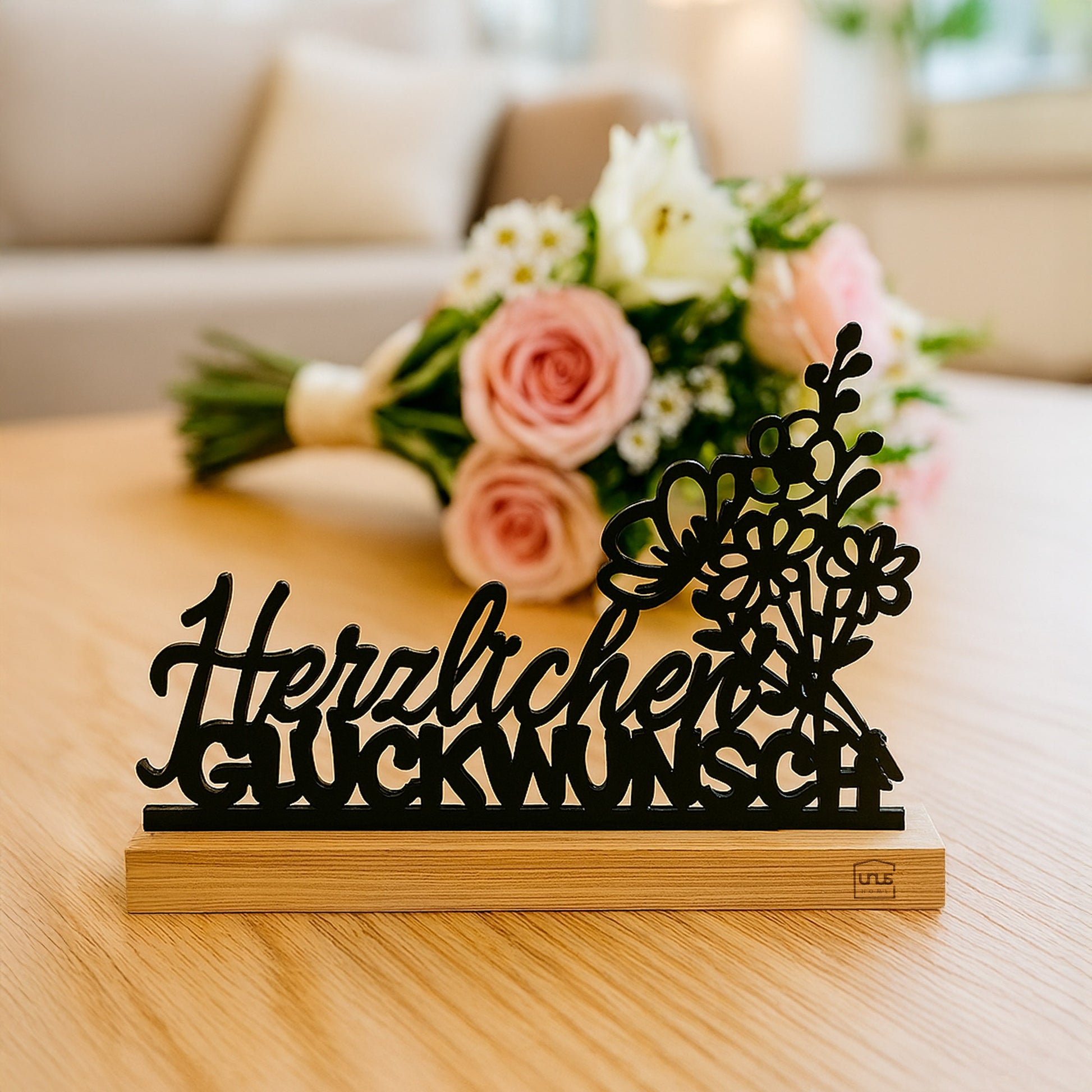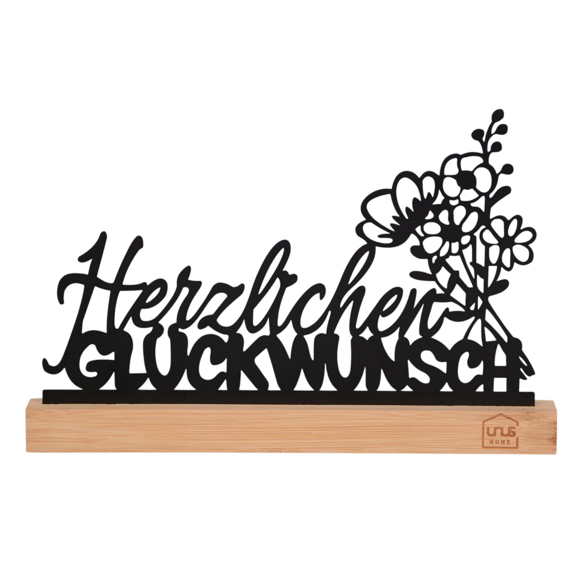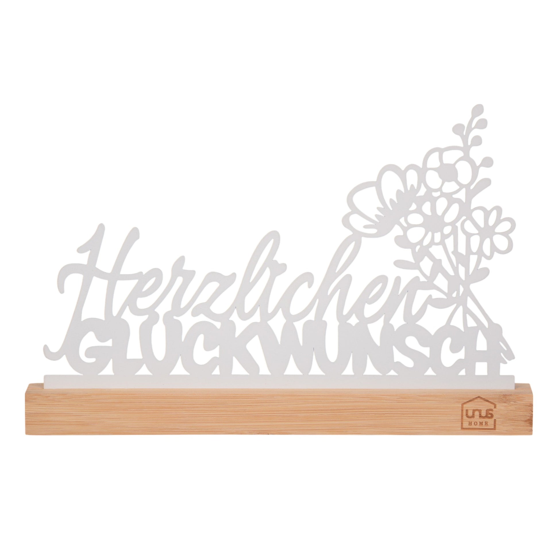 Der Aufsteller Herzlichen Glückwunsch vereint stilvolles Design mit liebevoller Botschaft. Gefertigt aus schwarzem oder weißem Metall und kombiniert mit einem natürlichen Bambus-Sockel, ist er die perfekte Dekoration für festliche Anlässe wie Geburtstage, Jubiläen oder Hochzeiten.