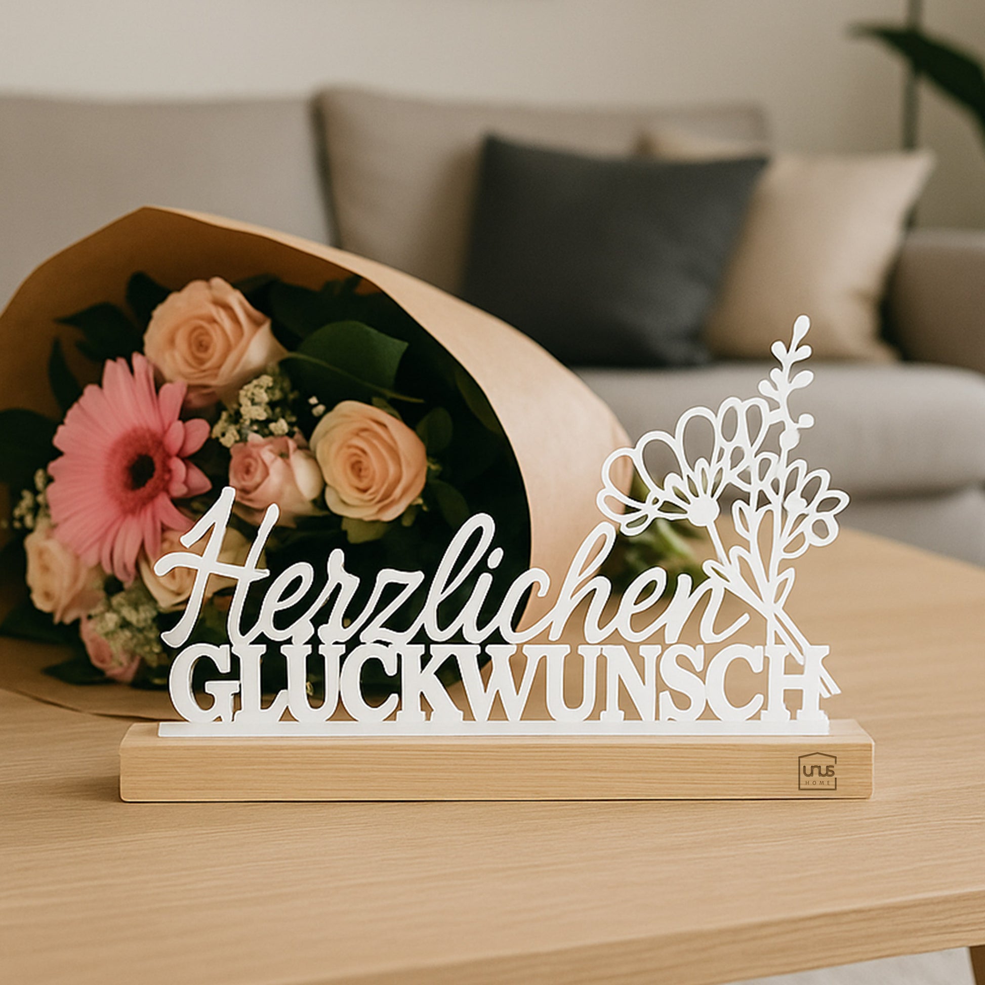 Verschenken Sie Freude – mit dem UNUS® Aufsteller Herzlichen Glückwunsch, der jedem Raum eine besondere Note verleiht.
