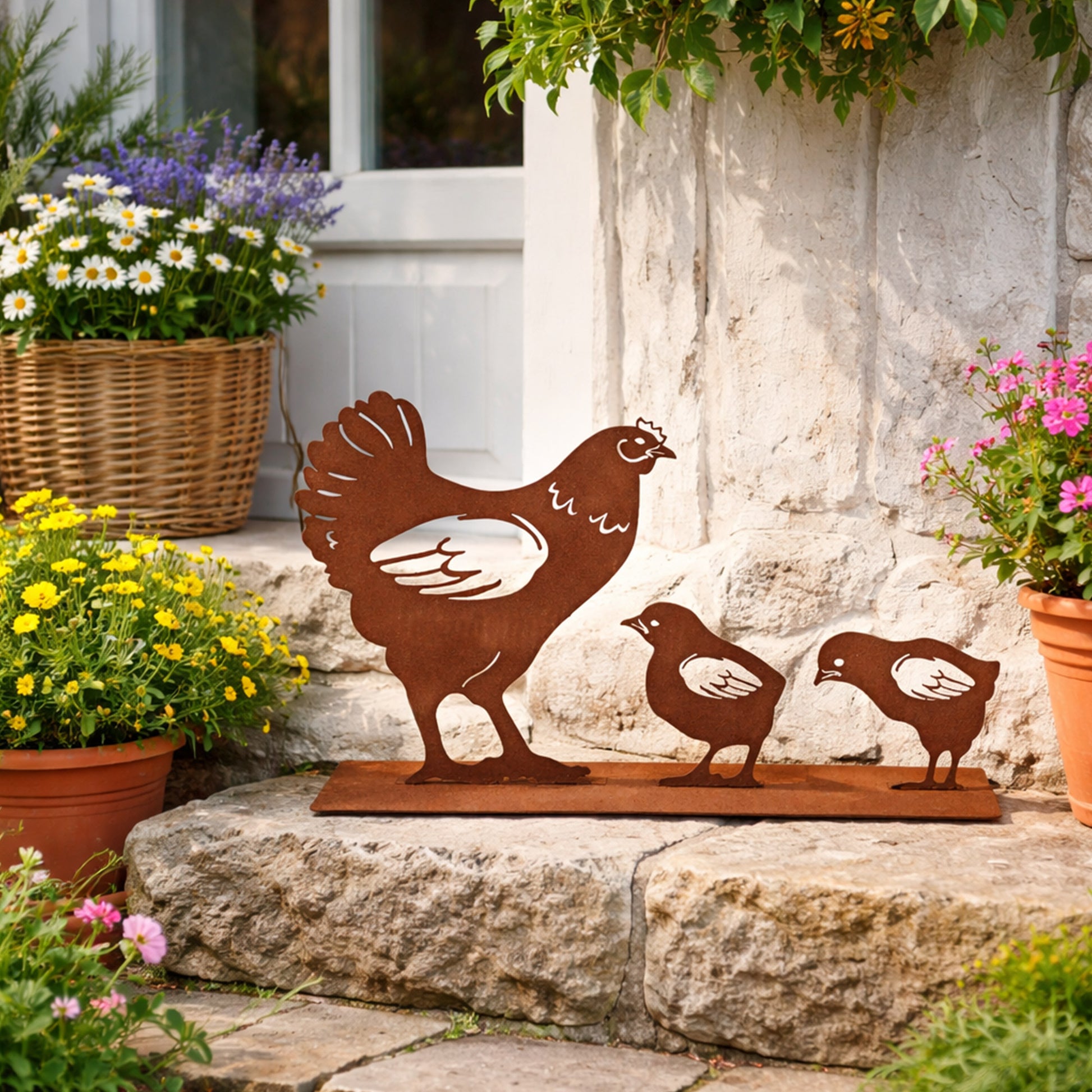 Ob im Beet, vor dem Hauseingang oder als Blickfang auf der Terrasse: Die Hühnerfamilie fügt sich harmonisch in jedes Gartenambiente ein und sorgt für eine liebevolle, natürliche Atmosphäre.