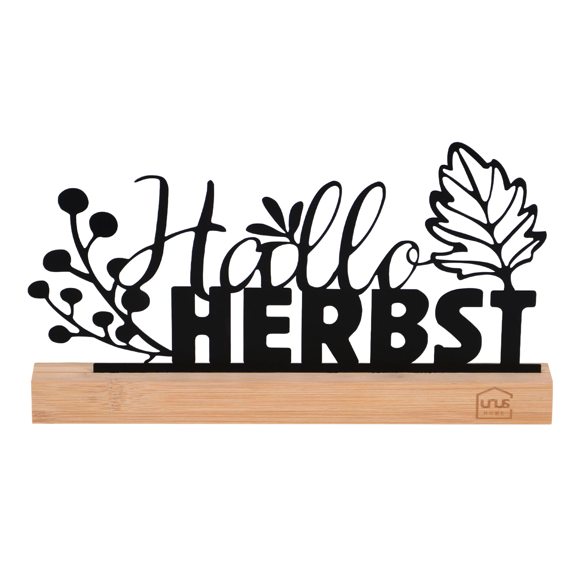Dekorativer Aufsteller Hallo Herbst aus Metall – mit Bambus-Sockel für Ihr Zuhause