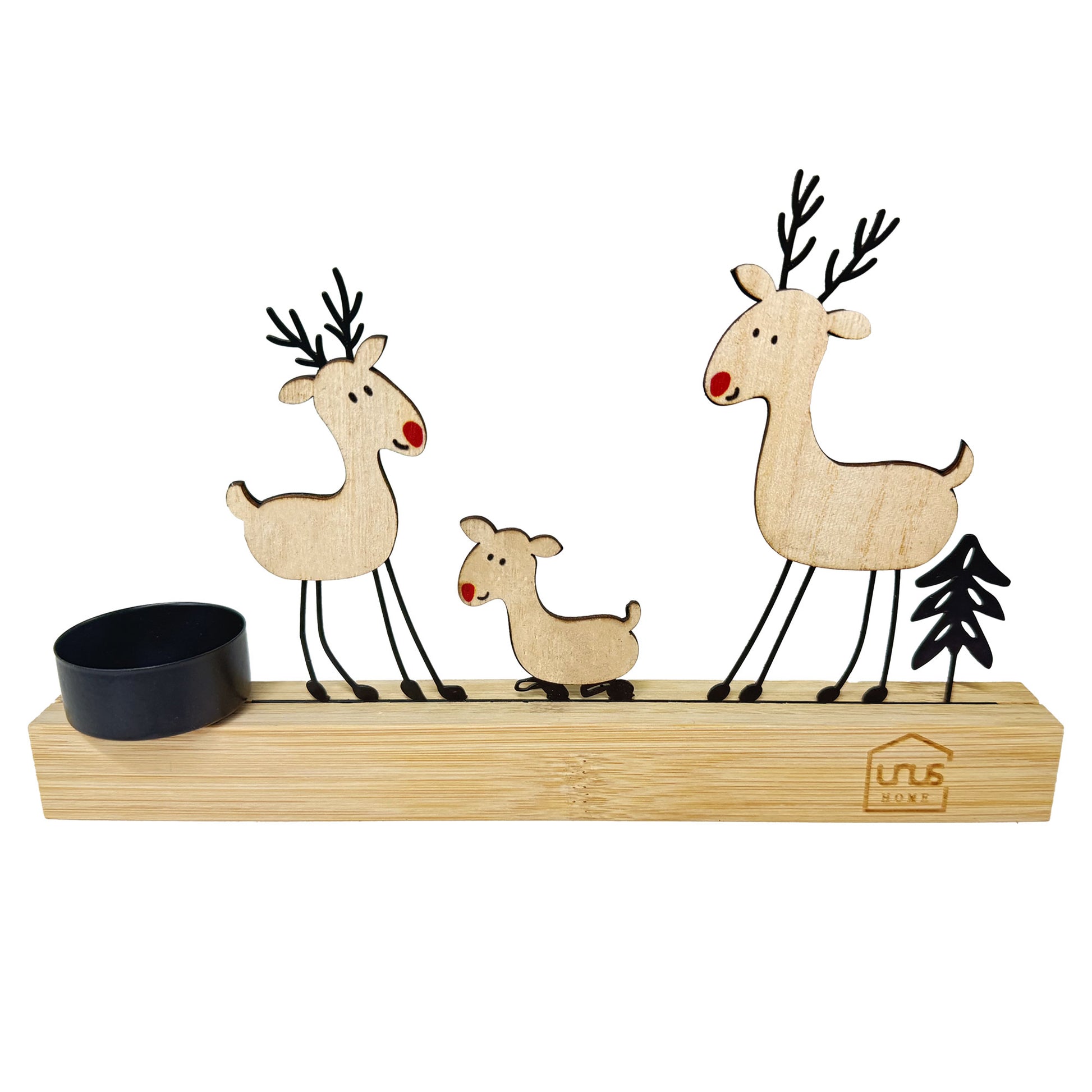 Der charmante UNUS® Aufsteller zeigt eine liebevoll gestaltete Rehfamilie mit Tannenbaum und integriertem Kerzenhalter. Die Kombination aus hellem Holz und feinem schwarzen Metall sorgt für eine harmonische, natürliche Optik, die perfekt zur Winter- und Adventszeit passt.