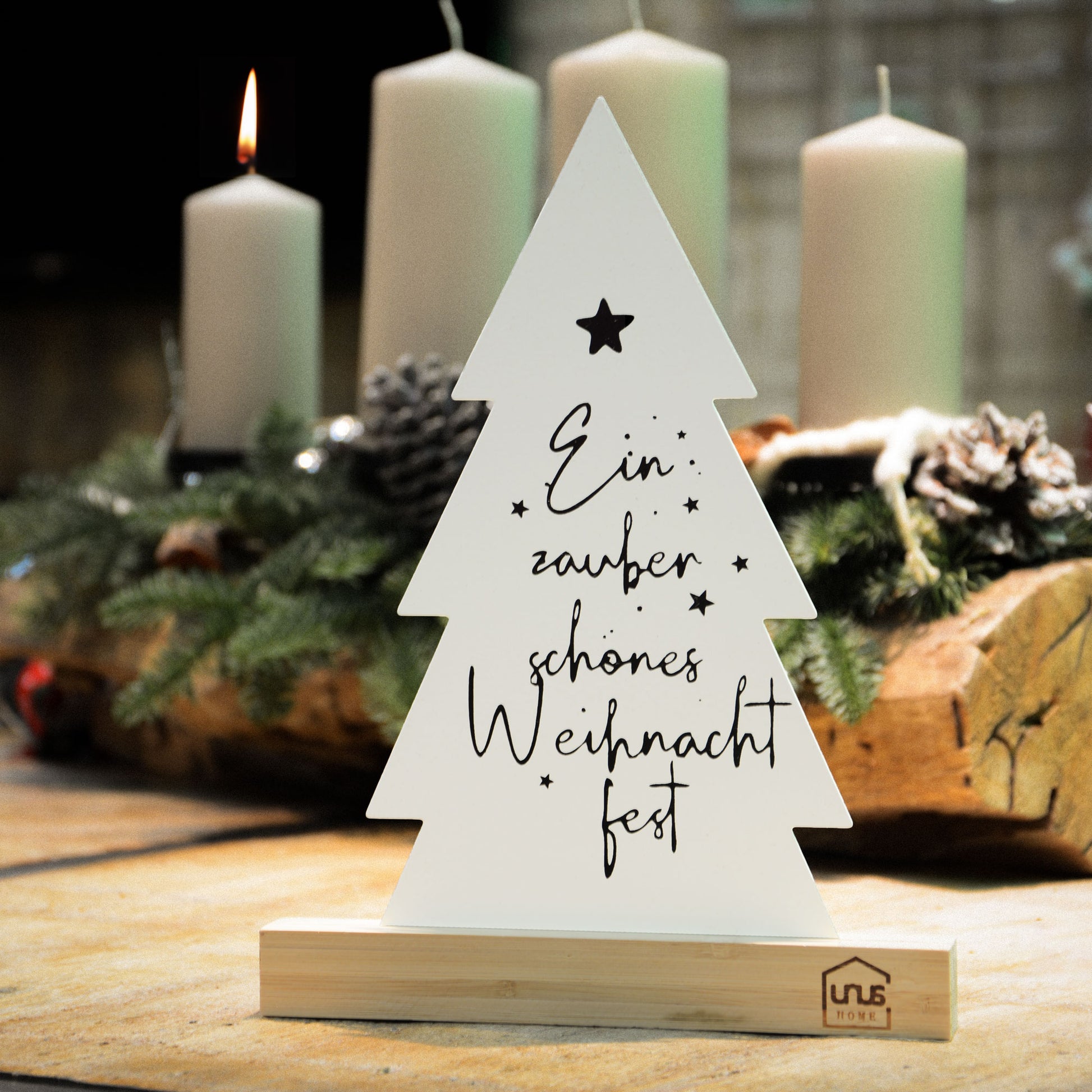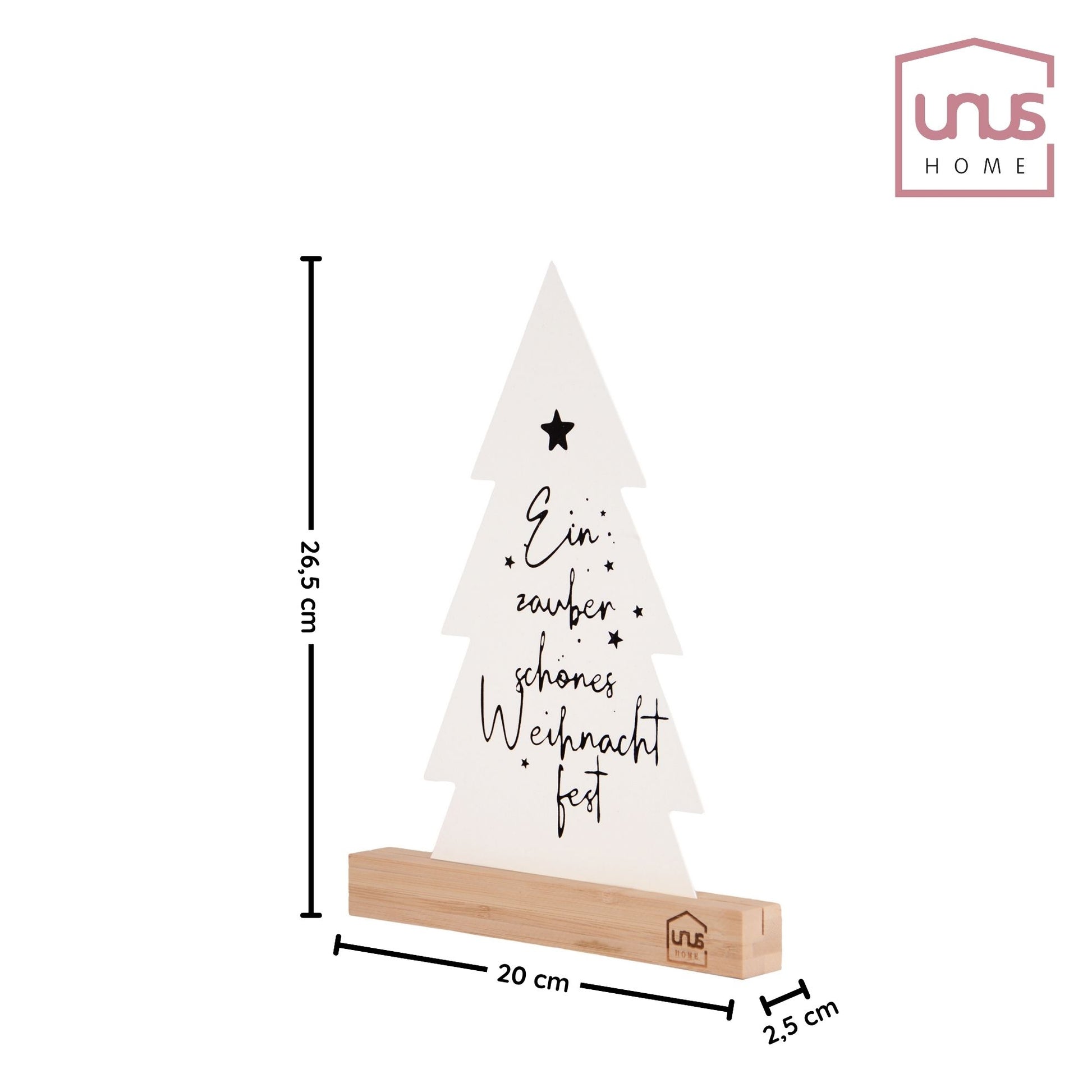Schaffen Sie eine besinnliche Weihnachtsstimmung mit diesem eleganten Tannenbaum-Aufsteller von UNUS. Der stilvolle Aufsteller besteht aus einer Kombination von nachhaltigem Bambus und langlebigem Metall in Weiß, verziert mit dem festlichen Spruch: Ein zauber schönes Weihnachtsfest. Die schlichte, moderne Optik macht ihn zu einem echten Hingucker in jedem Zuhause.
