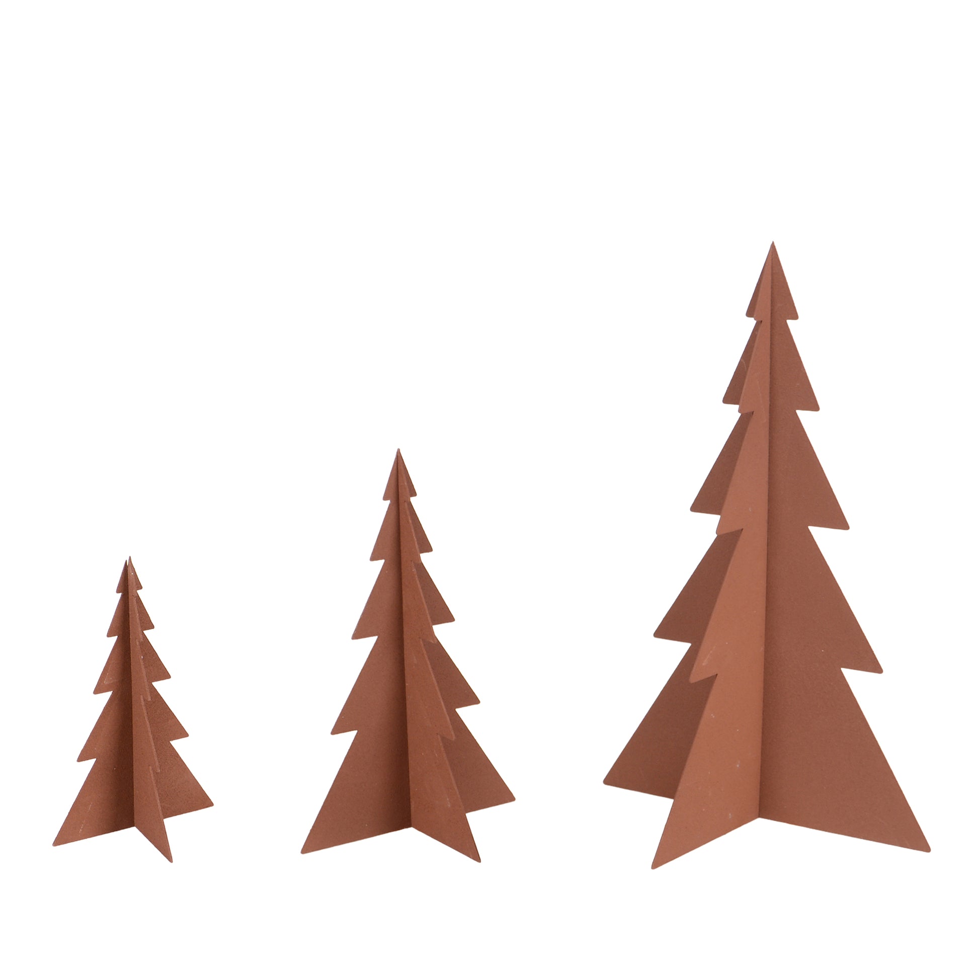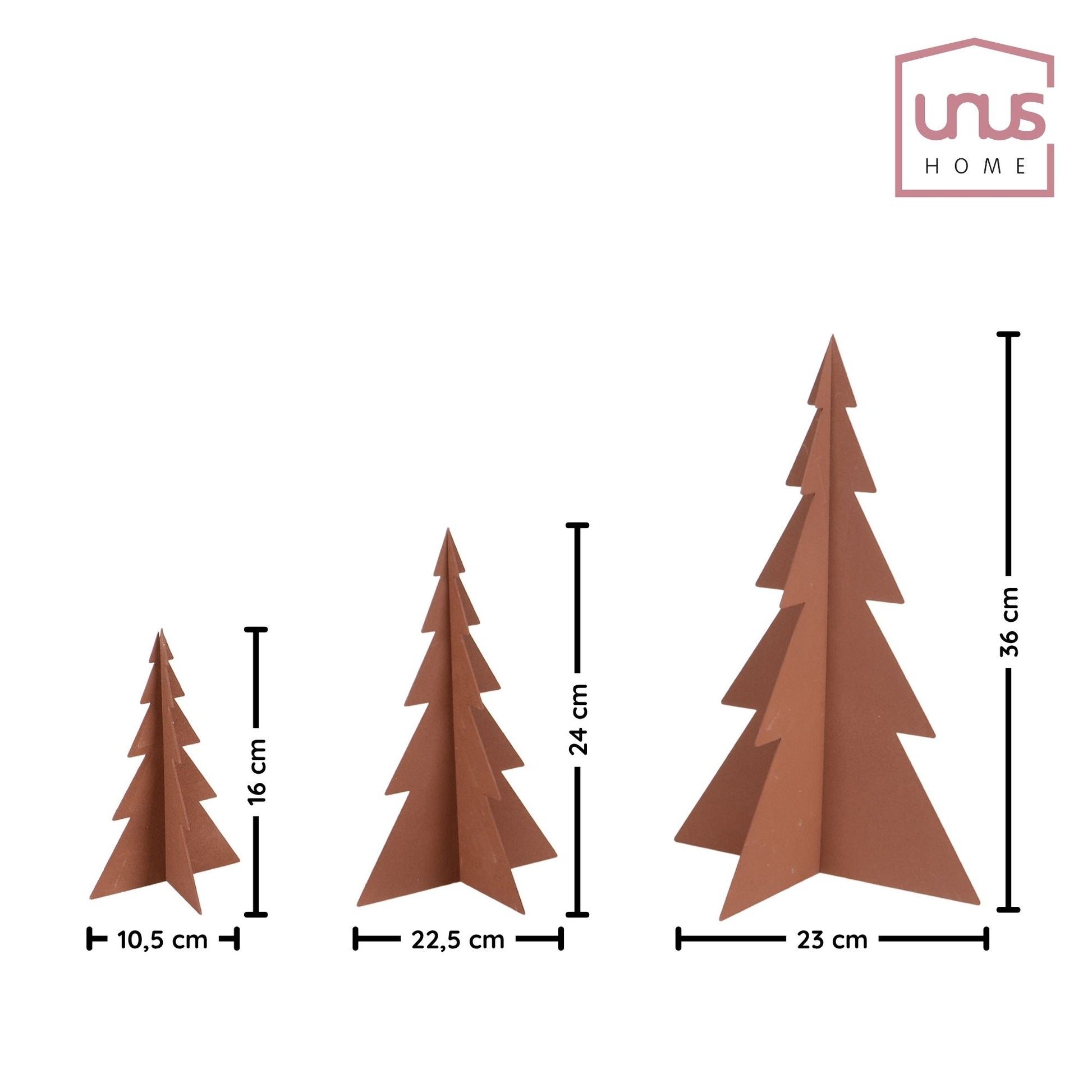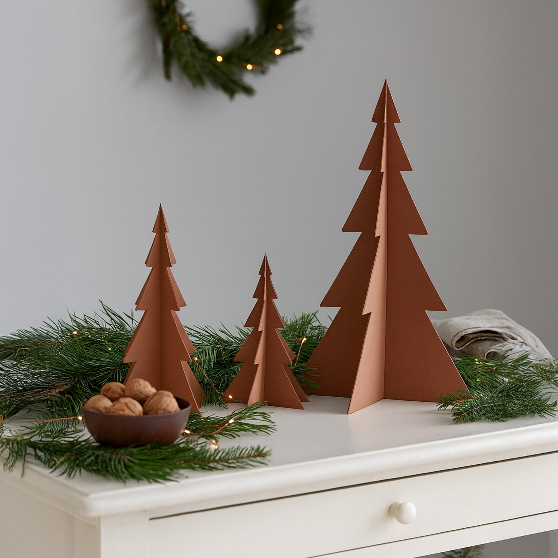 Mit dem Tannenbaum-Aufsteller 3er Set in Rostoptik holen Sie sich eine warme, winterliche Atmosphäre ins Haus. Die klaren Silhouetten der Bäume und die edle Rostfarbe schaffen ein natürliches, harmonisches Gesamtbild – perfekt für die Advents- und Winterzeit.