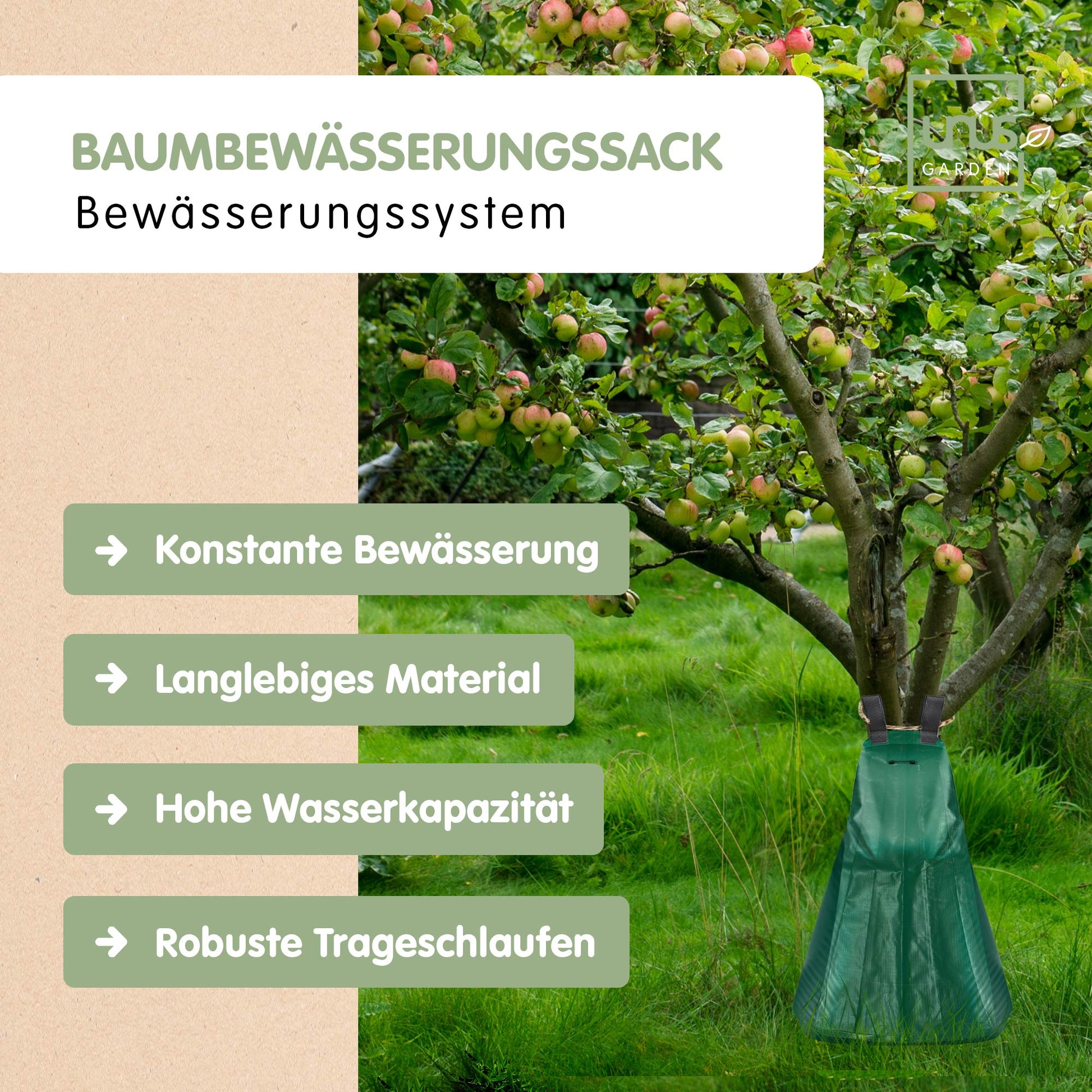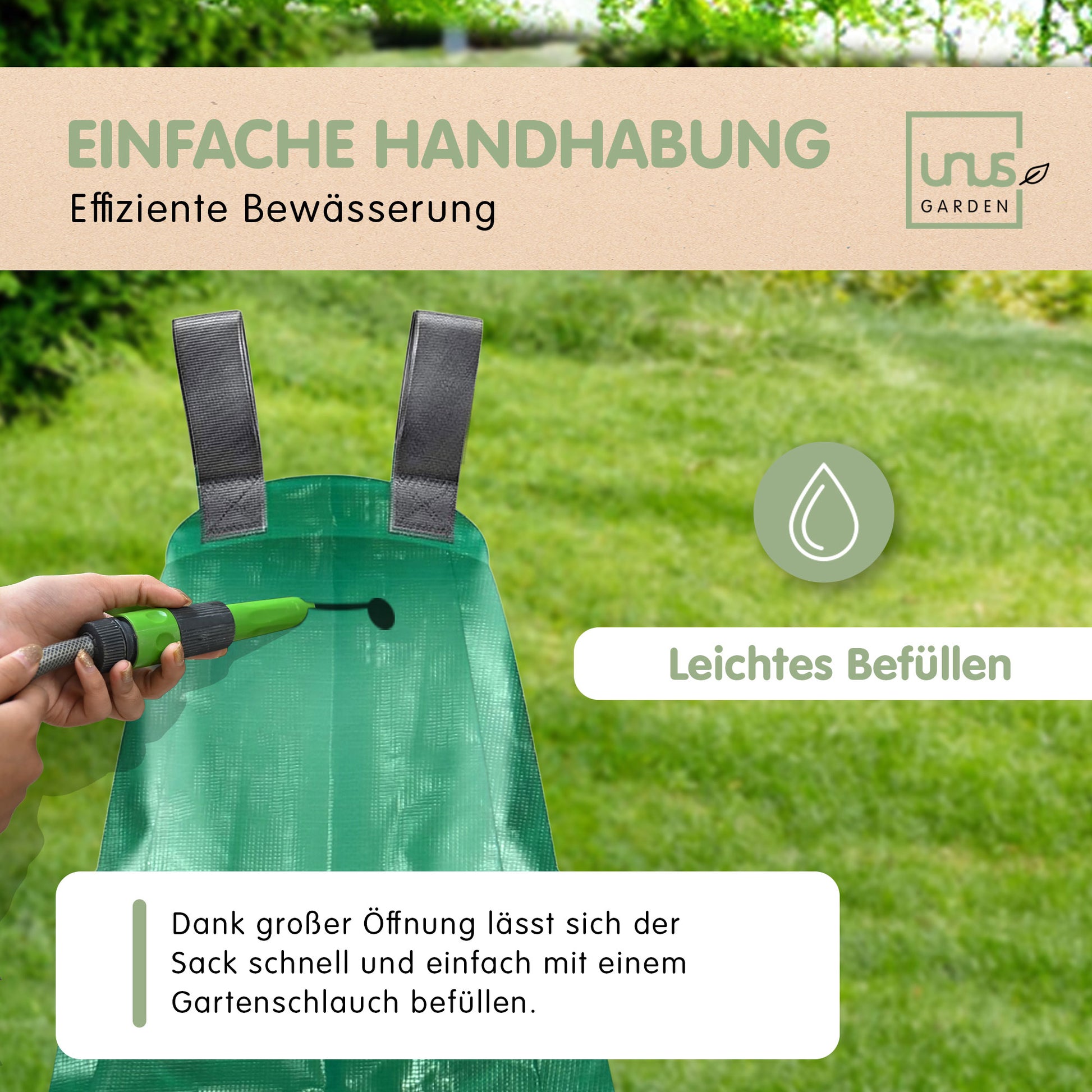 Die Anwendung ist einfach: Sack um den Stamm legen, Reißverschluss schließen und mit einem Gartenschlauch befüllen. Das Wasser sickert langsam in die Erde und erreicht tief die Wurzeln. Für dickere Stämme lassen sich mehrere Säcke miteinander verbinden, um auch große Bäume effektiv zu versorgen.
