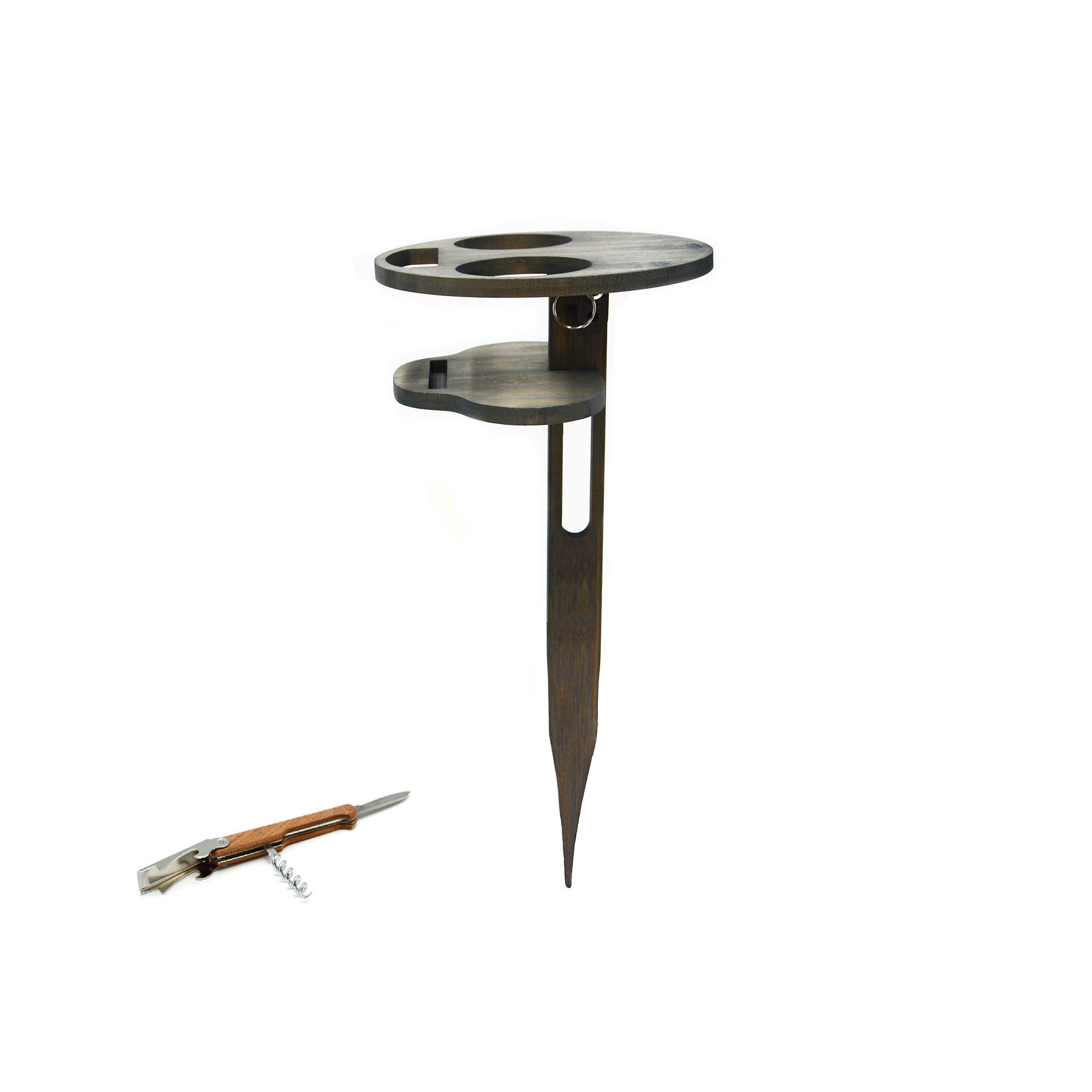 Der tragbare Biertisch bietet Platz für zwei Flaschen Bier und ein Smartphone. Die Tischplatte ist klappbar und wird mit dem beiliegenden Splint fixiert. Zudem liegt ein Taschenmesser mit Korkenzieher, Flaschenöffner und Messer bei.