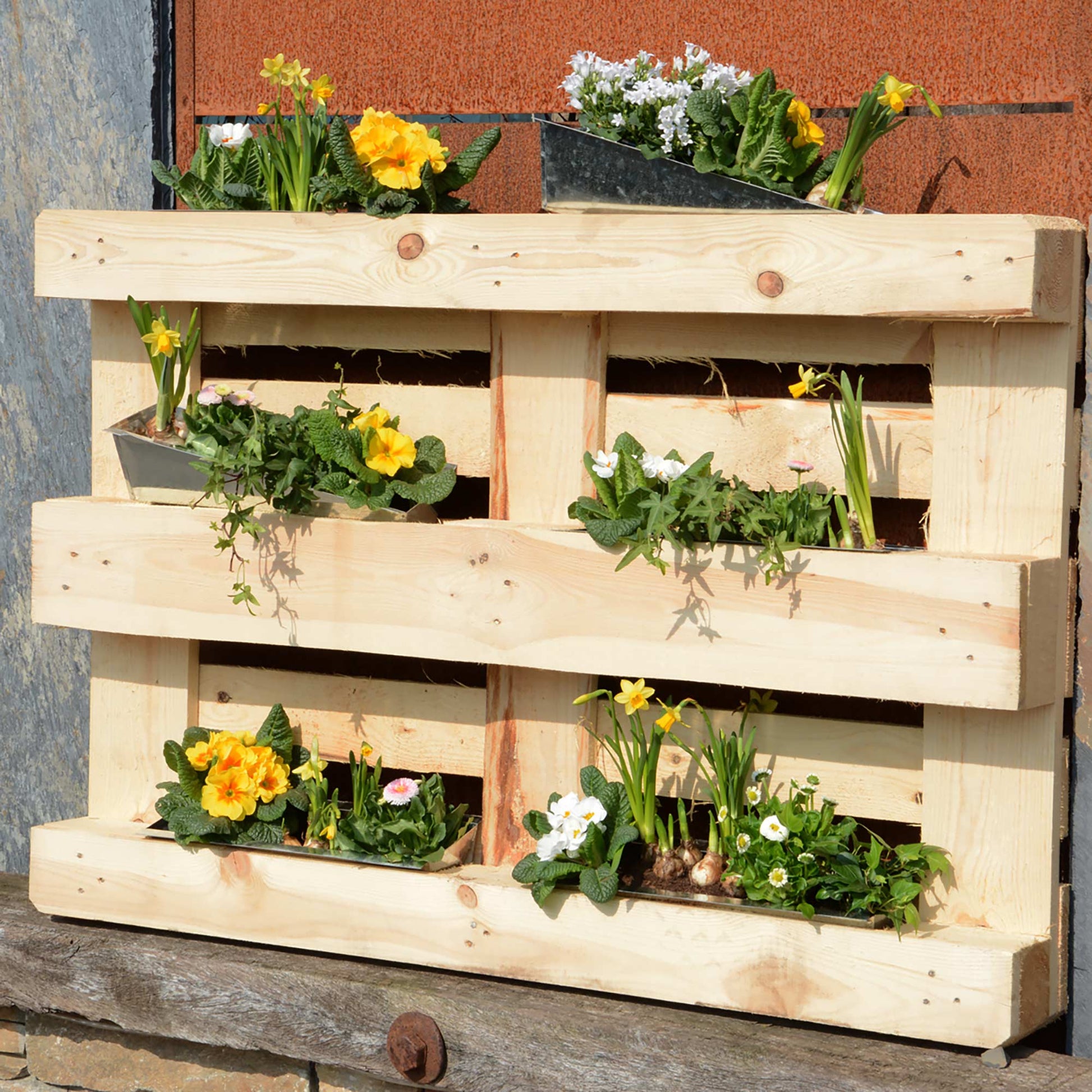 Dieser Blumenkasten aus Zink macht aus einer ausgedienten Europalette ein stylisches Pflanzregal. So haben Sie Platz für viele Pflanzen auf kleinstem Raum. Geeignet für Blumen, Kräuter und Früchte wie z.B. Erdbeeren.