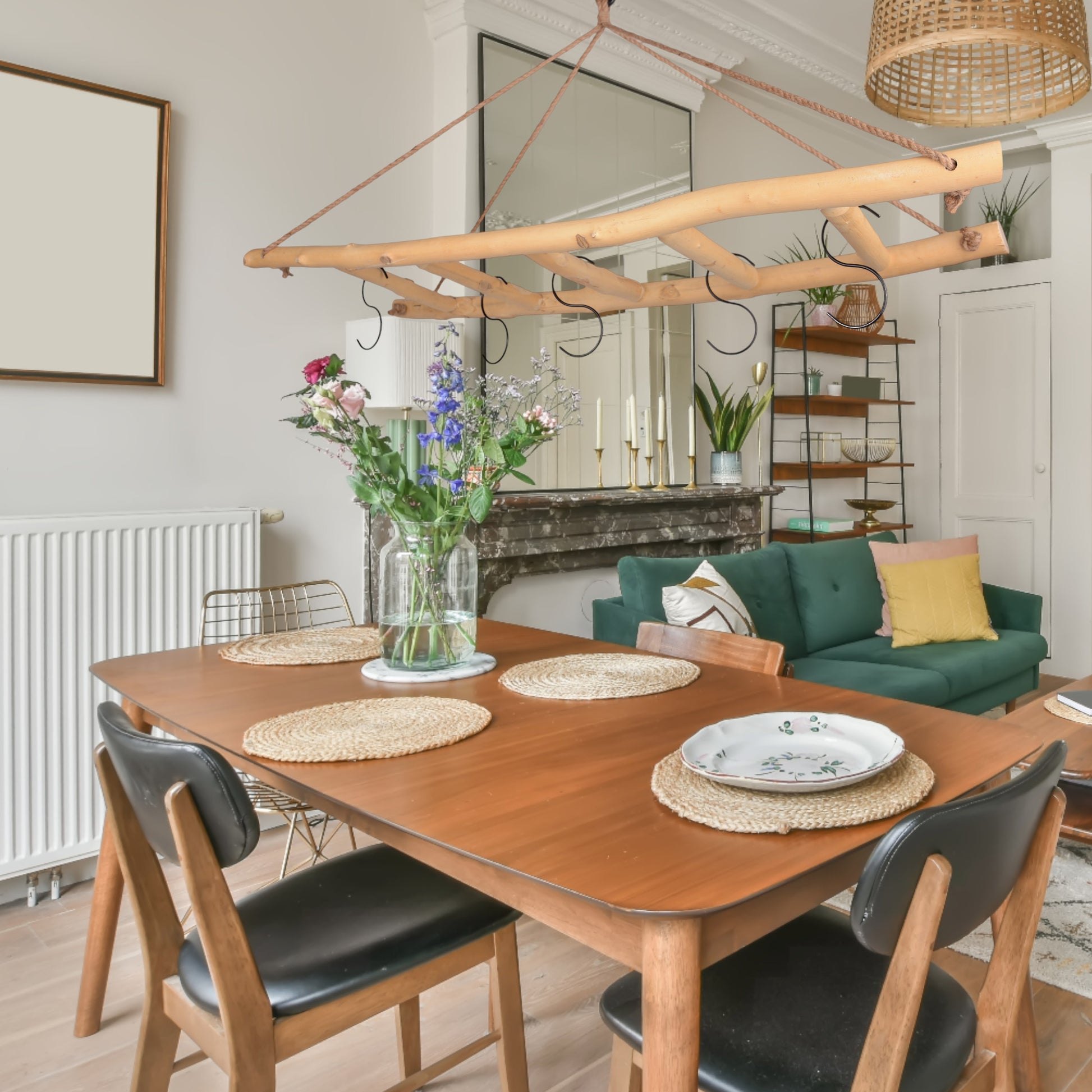 Ob in der Küche für Töpfe und Pfannen oder im Wohnzimmer als dekorativer Hängeraum, die Leiter bietet zahlreiche Anwendungsmöglichkeiten für stilvolle Dekorationen und praktische Aufbewahrung.