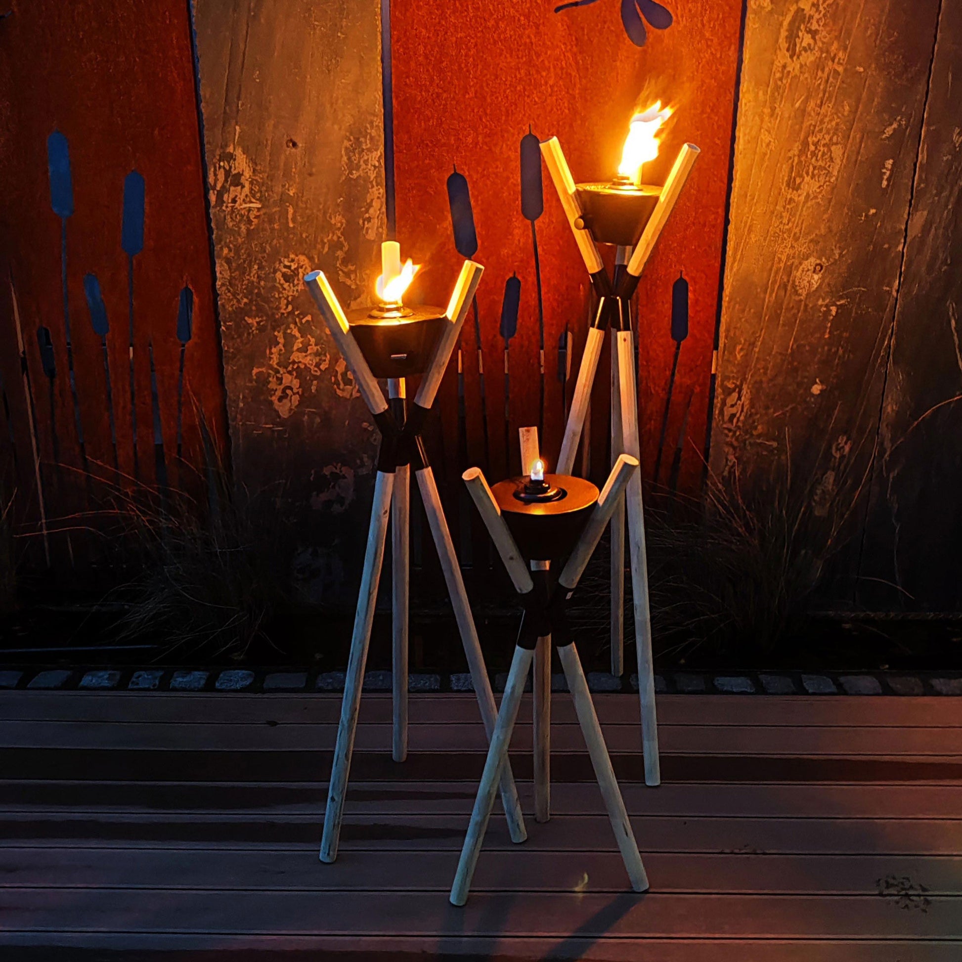 Erhältlich in drei verschiedenen Größen bieten diese Gartenfackeln aus Holz die perfekte Lösung für jeden Garten. Dank des großzügigen Öltanks bieten unsere Fackeln eine lange Brenndauer von mehreren Stunden und sind somit der ideal für nächtelange Gartenpartys. Genießen Sie laue Sommerabende im warmen Schein der Gartenfackel oder verwandeln Sie sie tagsüber in eine blühende Oase, indem Sie Ihre Lieblingsblumen in der Fackel als Blumentopf zur Geltung bringen.