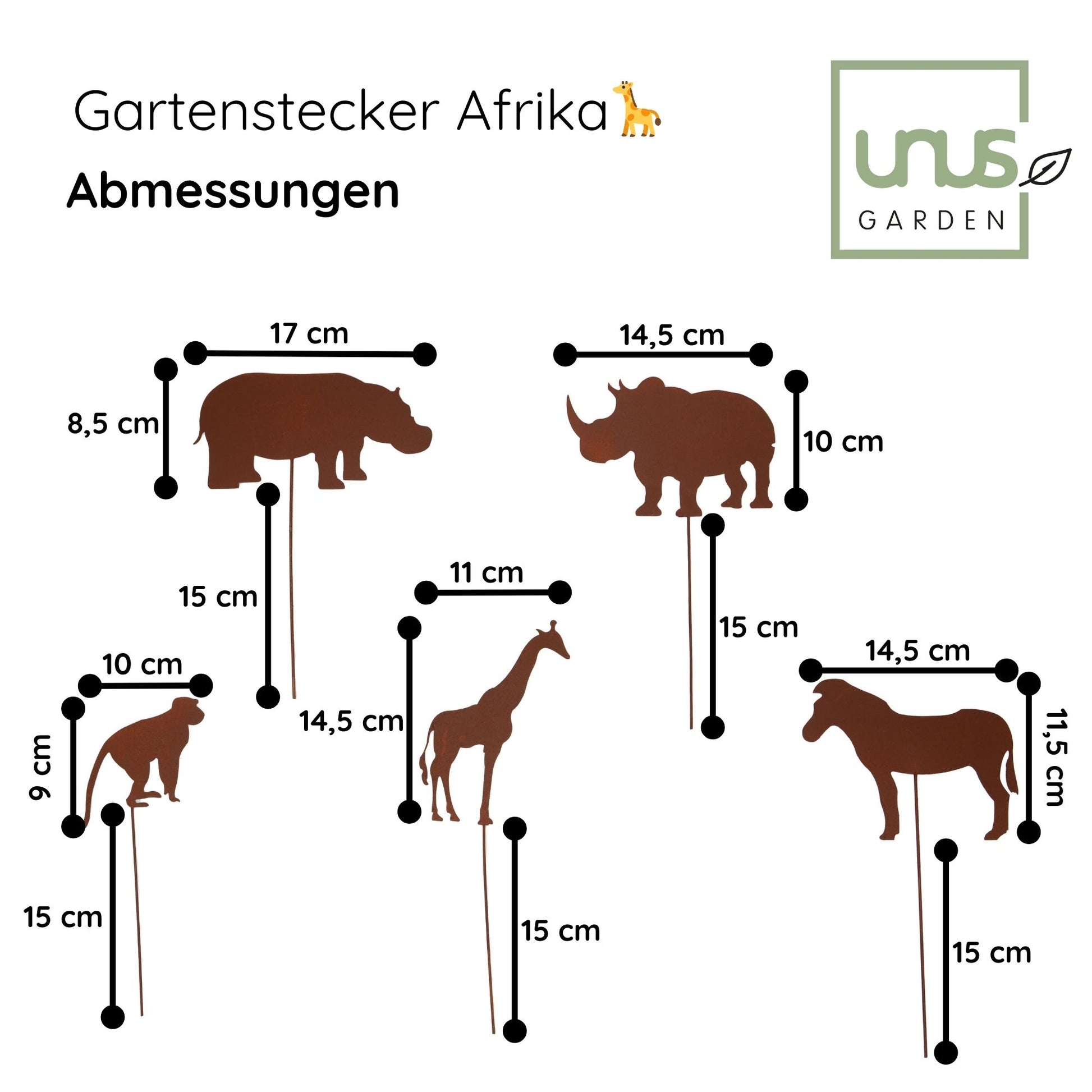 Verleihen Sie Ihrem Garten, Terrasse oder Ihrem Balkon eine Safari-Note und genießen Sie die Vielfalt und Eleganz der afrikanischen Tierwelt mit unserem 5er Set Roststecker.
