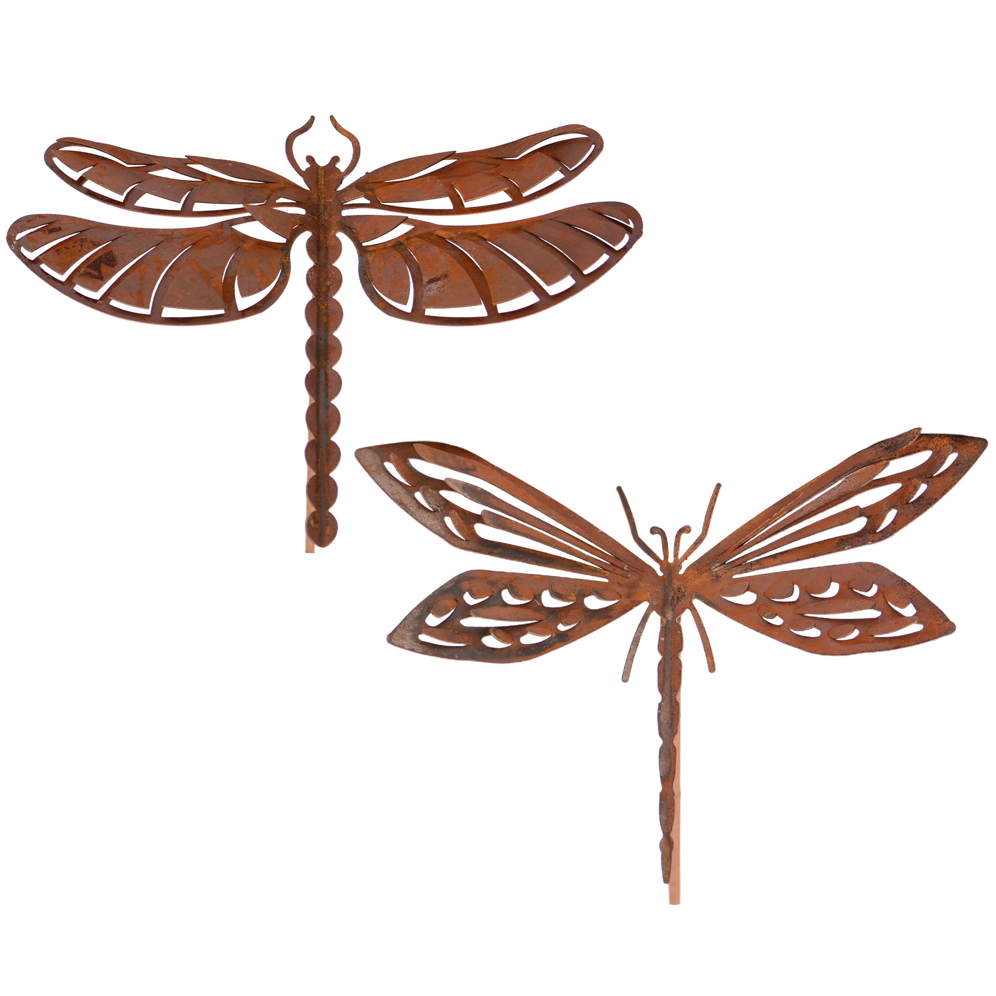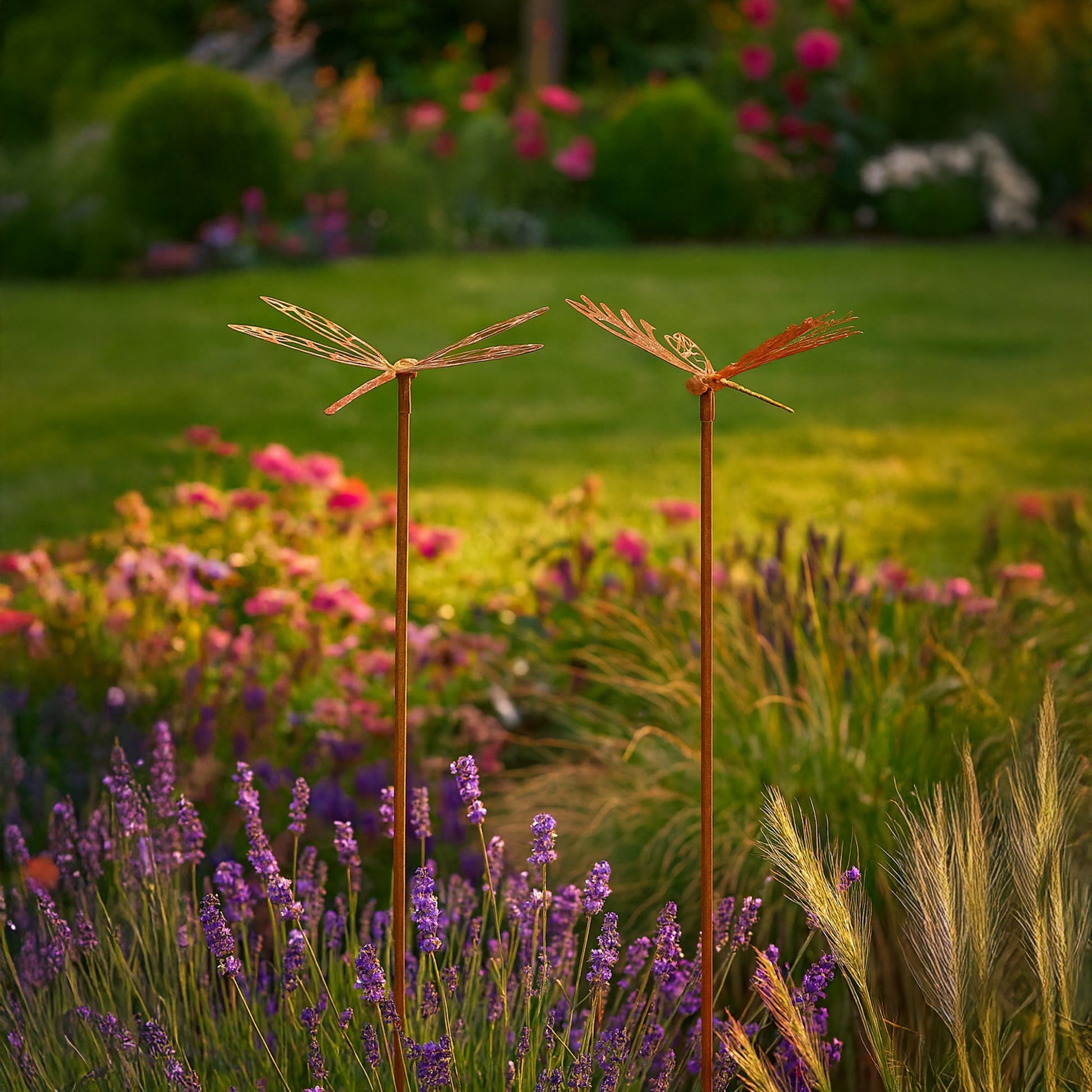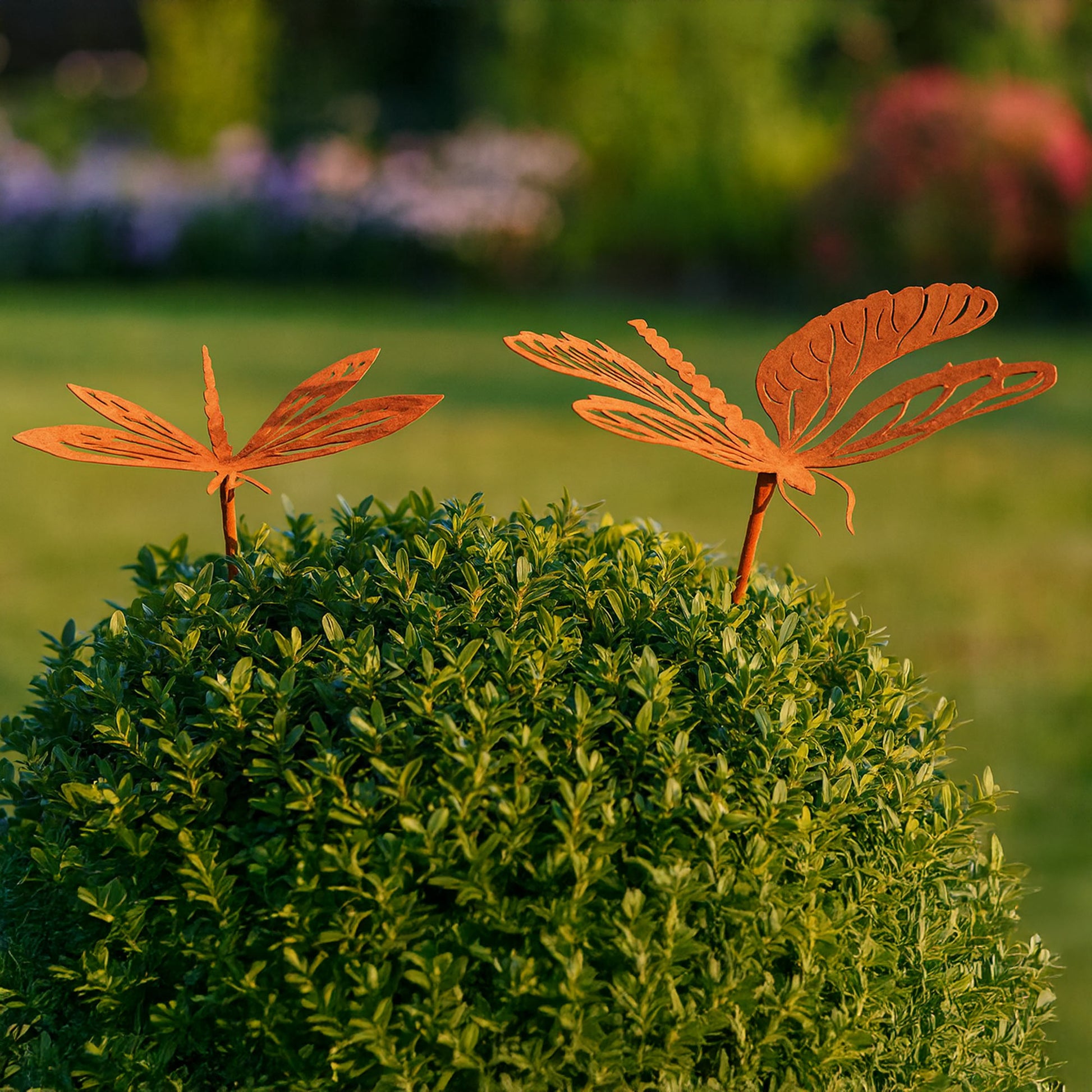 Die beiden Libellen sind unterschiedlich breit und dadurch ideal kombinierbar. Durch die hohe Gesamthöhe von jeweils ca. 96 cm setzen sie stilvolle Akzente, ohne aufdringlich zu wirken. Die Rostpatina entwickelt sich mit der Zeit weiter und verleiht jeder Figur einen individuellen, natürlichen Charakter.