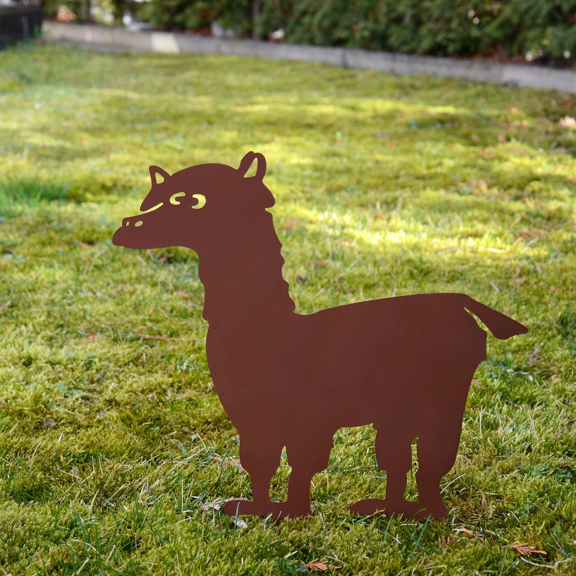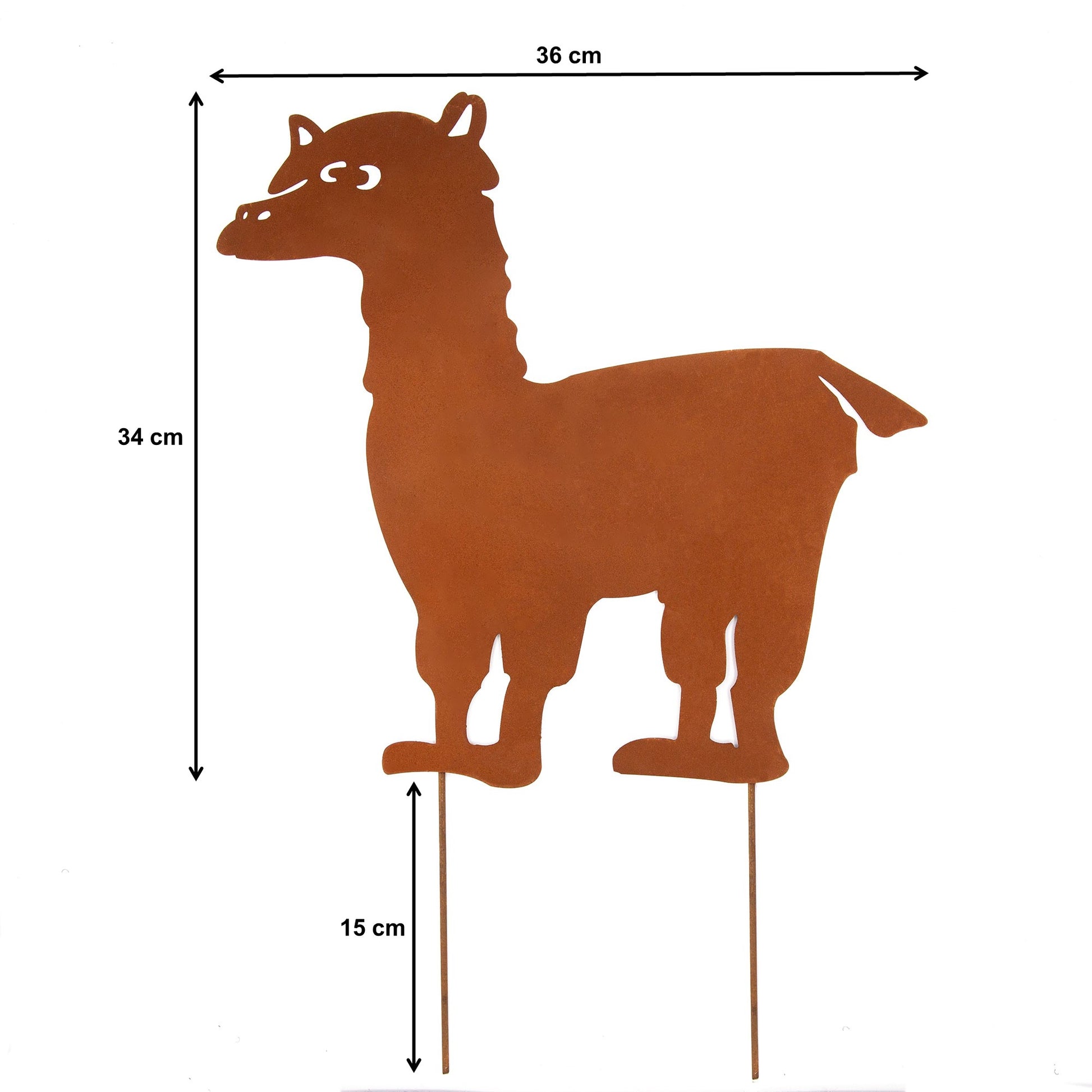 Das Alpaka besteht aus robustem und hochwertigen Metall mit einer einzigartigen Rostoptik. Der Roststecker ist witterungsfest und frostfest. Sie können ihn das ganze Jahr über draußen stehen lassen. Der Gartenstecker eignet sich auch hervorragend als außergewöhnliches und kreatives Geschenk für Gartenfreunde und Dekofans! Der Pflanzenstecker wird mit zwei separaten Stäben geliefert und lässt sich ganz bequem und unkompliziert aufstellen. Das Alpaka wird zum Hingucker in Ihrem Garten und zieht die Blicke Ihrer Nachbarn auf sich.