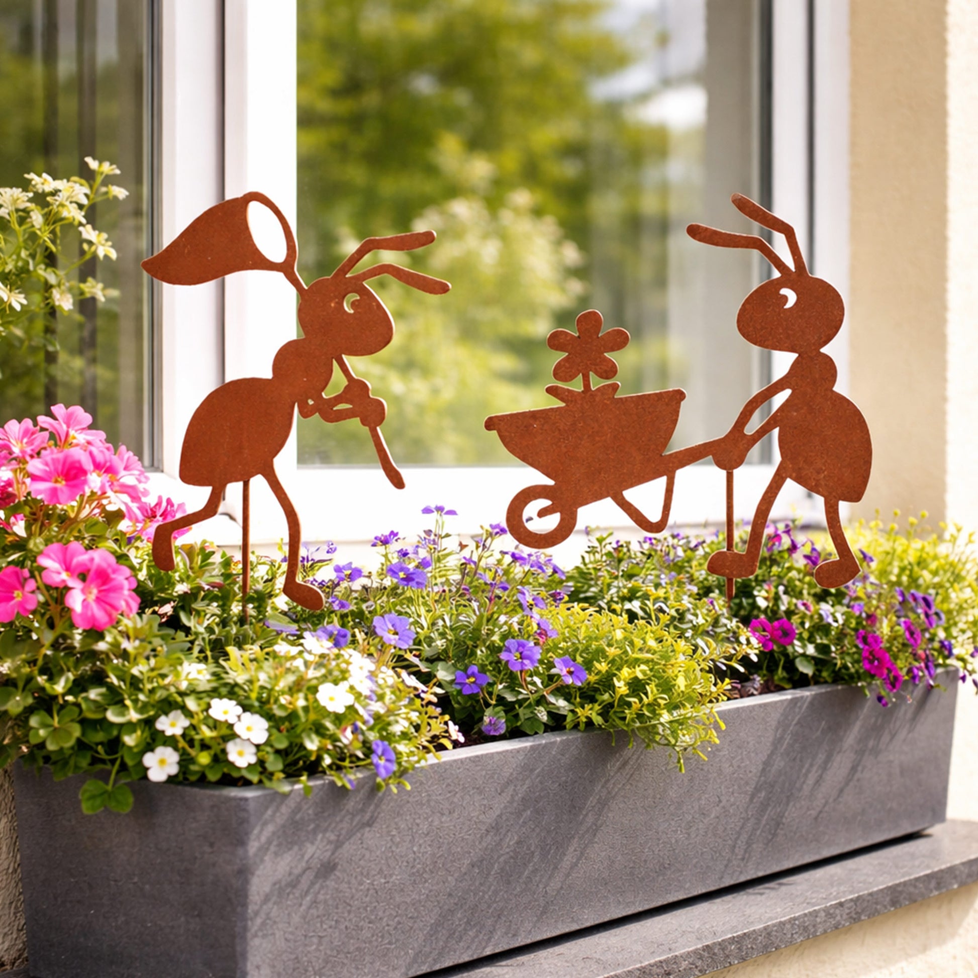 Dank der langen Steckstäbe können die Figuren mühelos in Erde, Rasen oder Pflanzgefäße gesteckt werden. Das robuste Metall ist wetterfest und eignet sich ideal für eine ganzjährige Nutzung im Außenbereich.