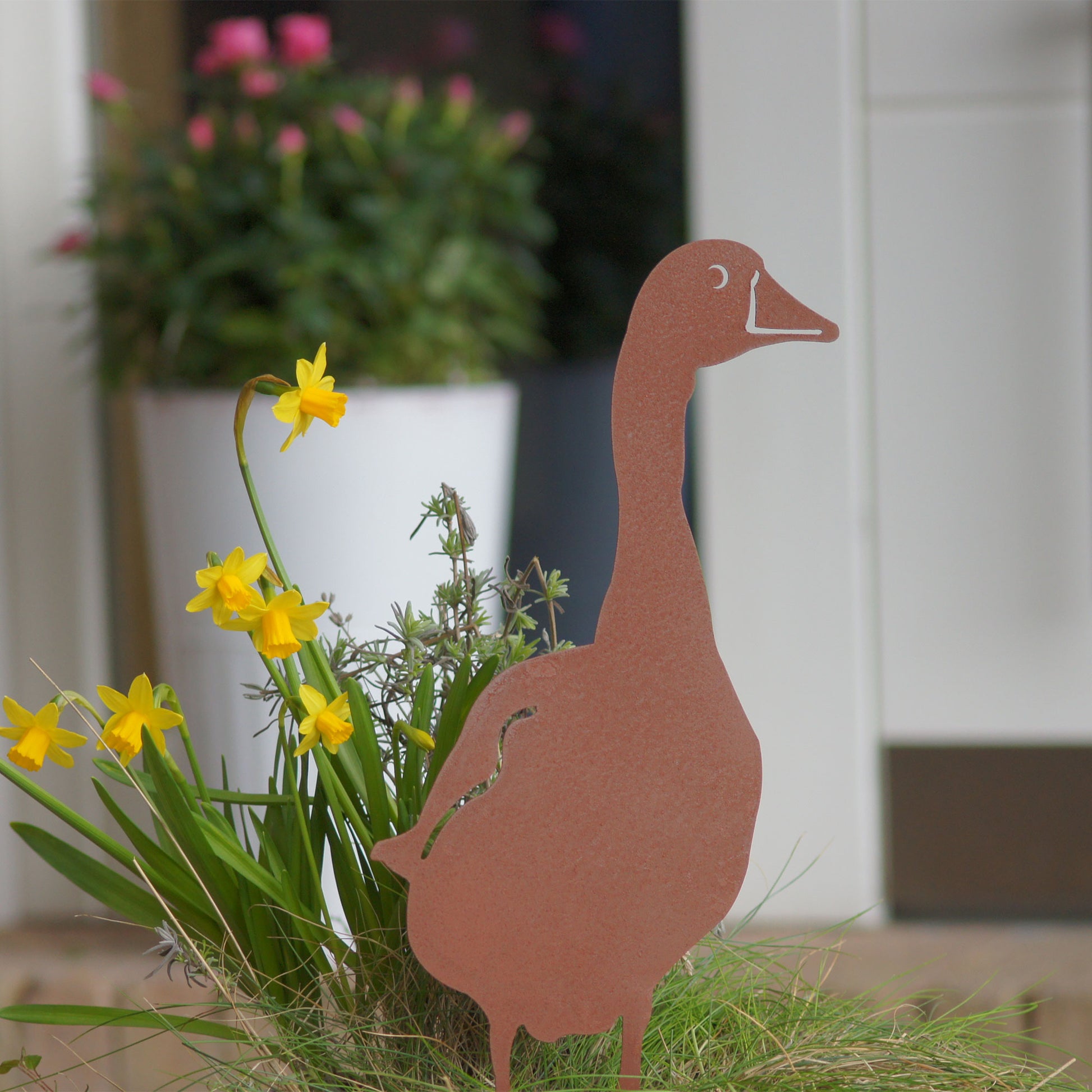 Die Gänse bestehen aus robustem und hochwertigen Metall mit einer einzigartigen Rostoptik. Die Roststecker können sowohl drinnen als auch draußen dekoriert werden. Die Gartenstecker eignen sich auch hervorragend als außergewöhnliches und kreatives Geschenk für Gartenfreunde und Dekofans! Die Pflanzenstecker werden mit separaten Stäben geliefert und lassen sich ganz bequem und unkompliziert aufstellen. Die Gartenstecker werden zum Hingucker in Ihrem Garten und ziehen die Blicke Ihrer Nachbarn auf sich.