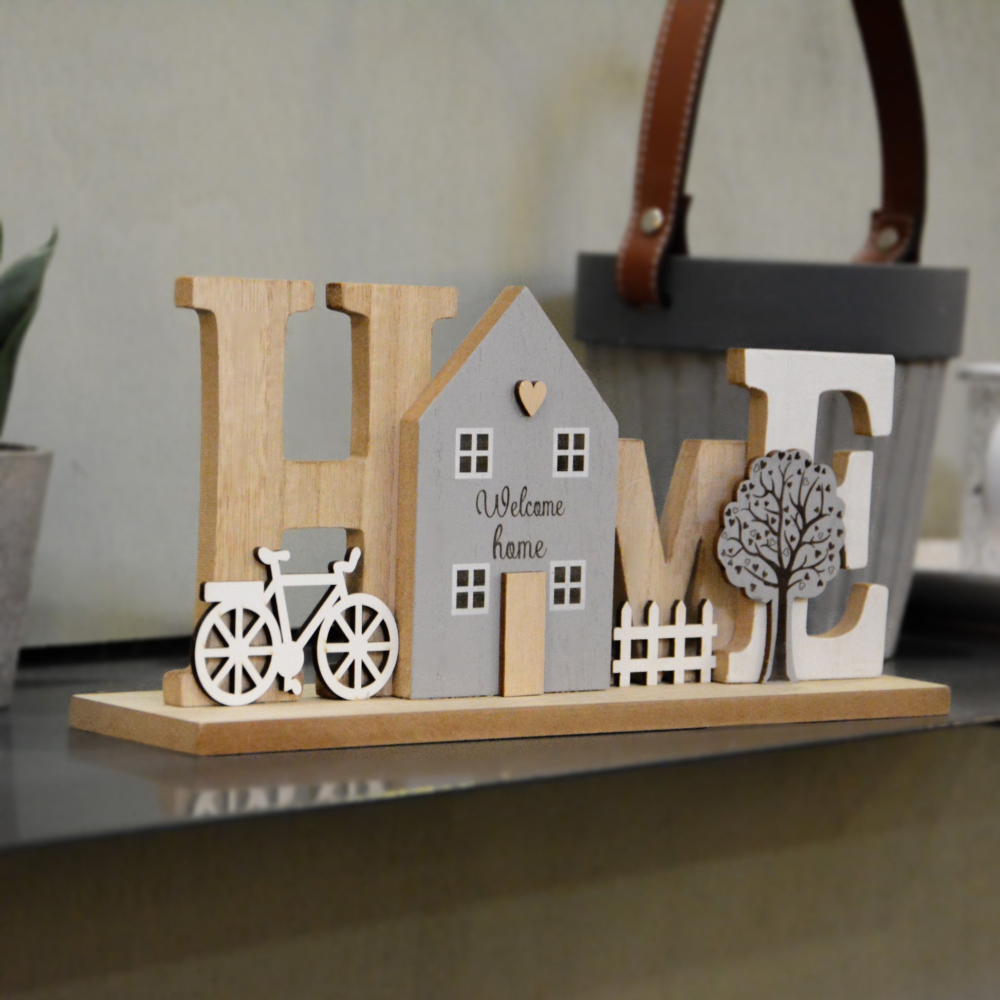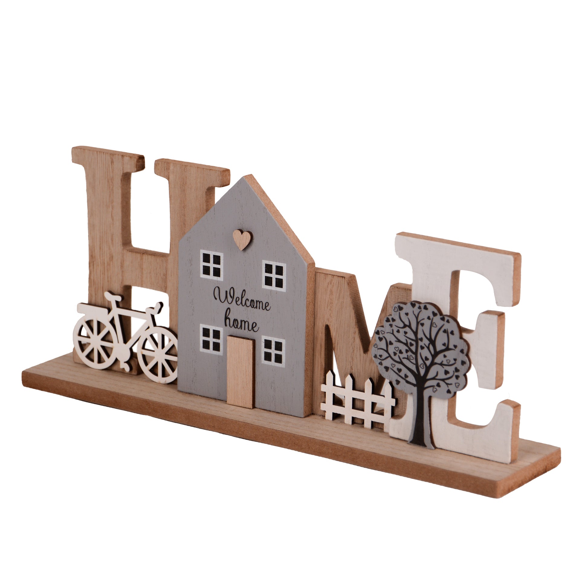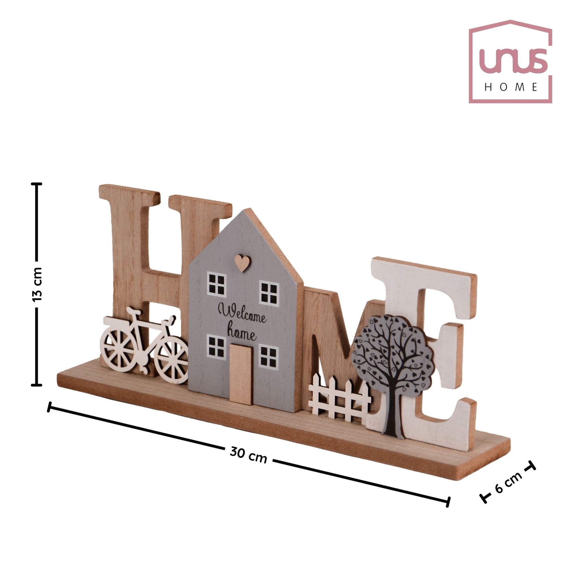 - Liebevolles Design: Schriftzug HOME mit Haus, Baum und Fahrrad-Dekor für ein einladendes Ambiente.