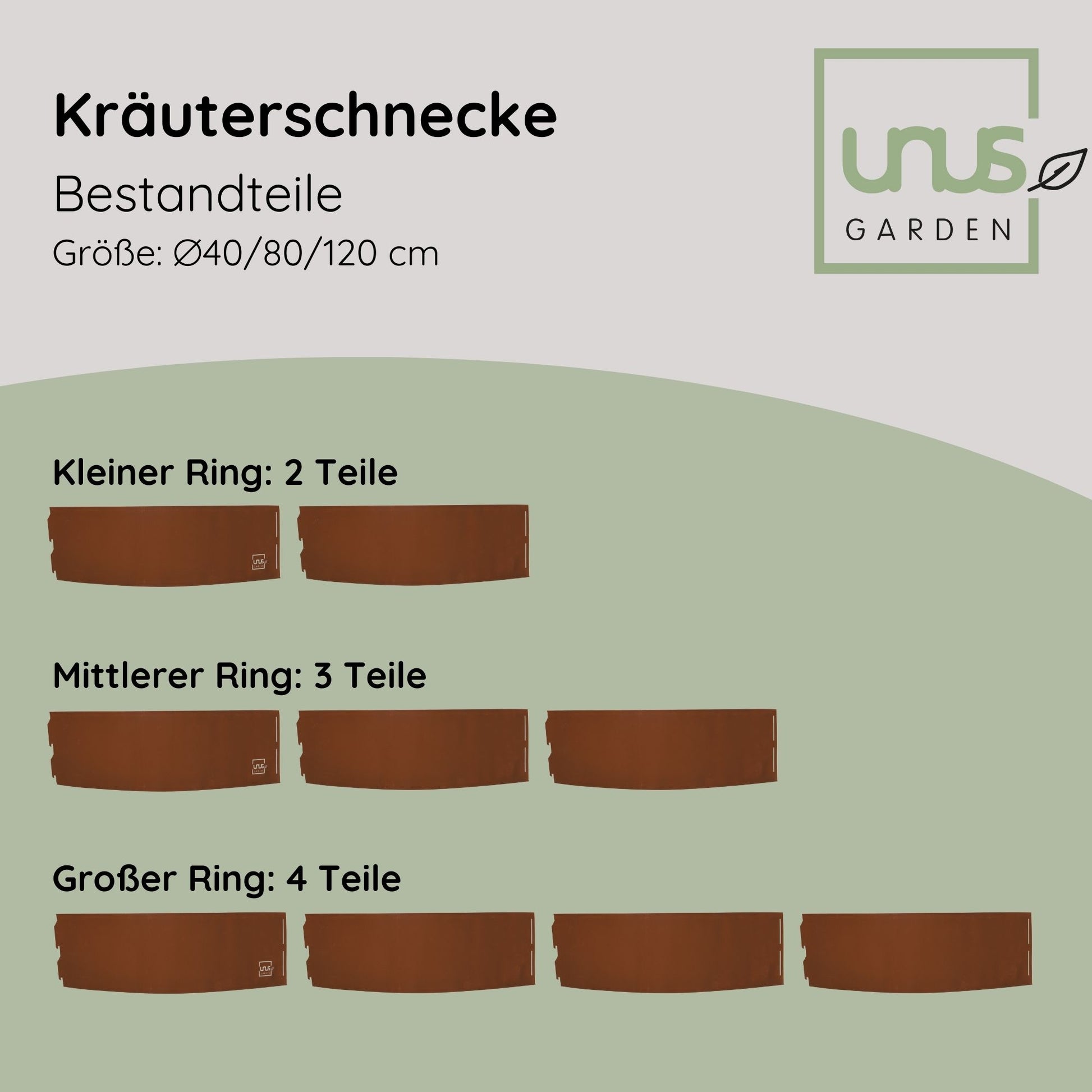 Die Einzelteile unserer Kräuterschnecke werden geliefert und lassen sich mühelos zusammenfügen, indem die Metallplatten zu einem Ring ineinander gesteckt werden. Anschließend werden die einzelnen Ringe mit Erde befüllt und übereinander platziert.Wichtig dabei ist, dass alle Verbindungen von Außen ineinander zu stecken, damit die gewünschte Rundung entstehen kann