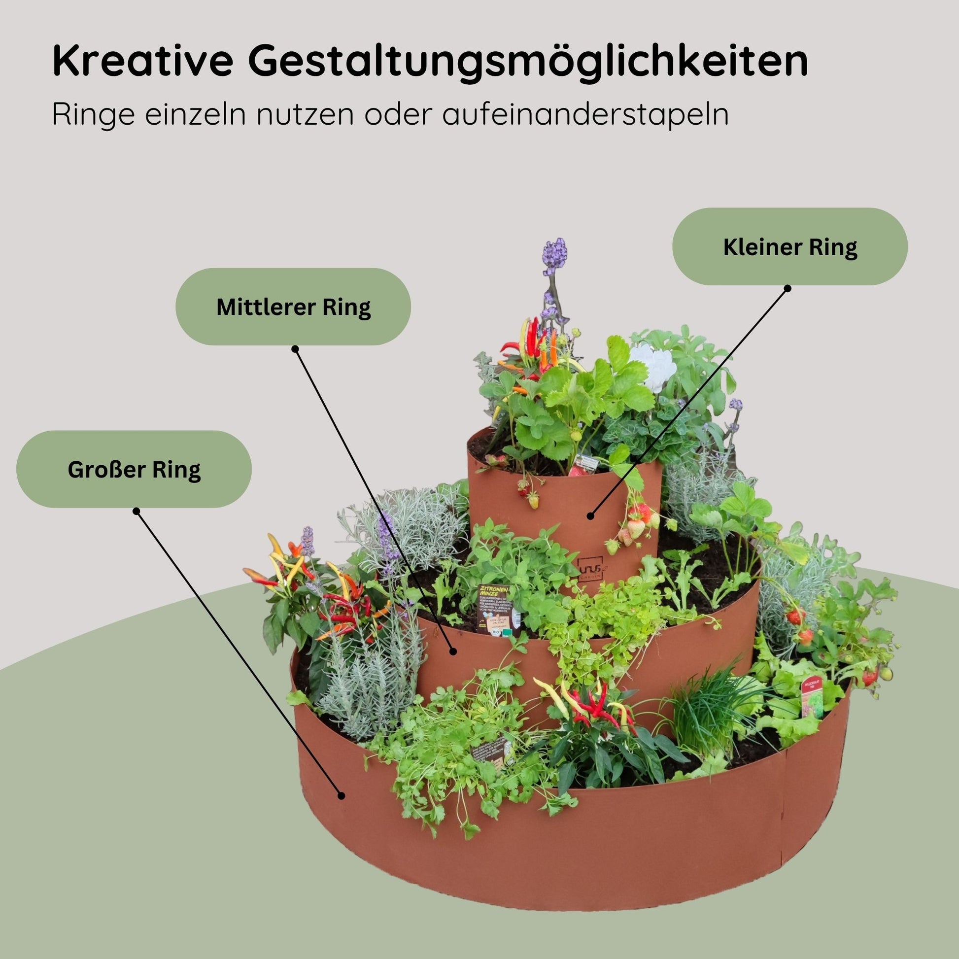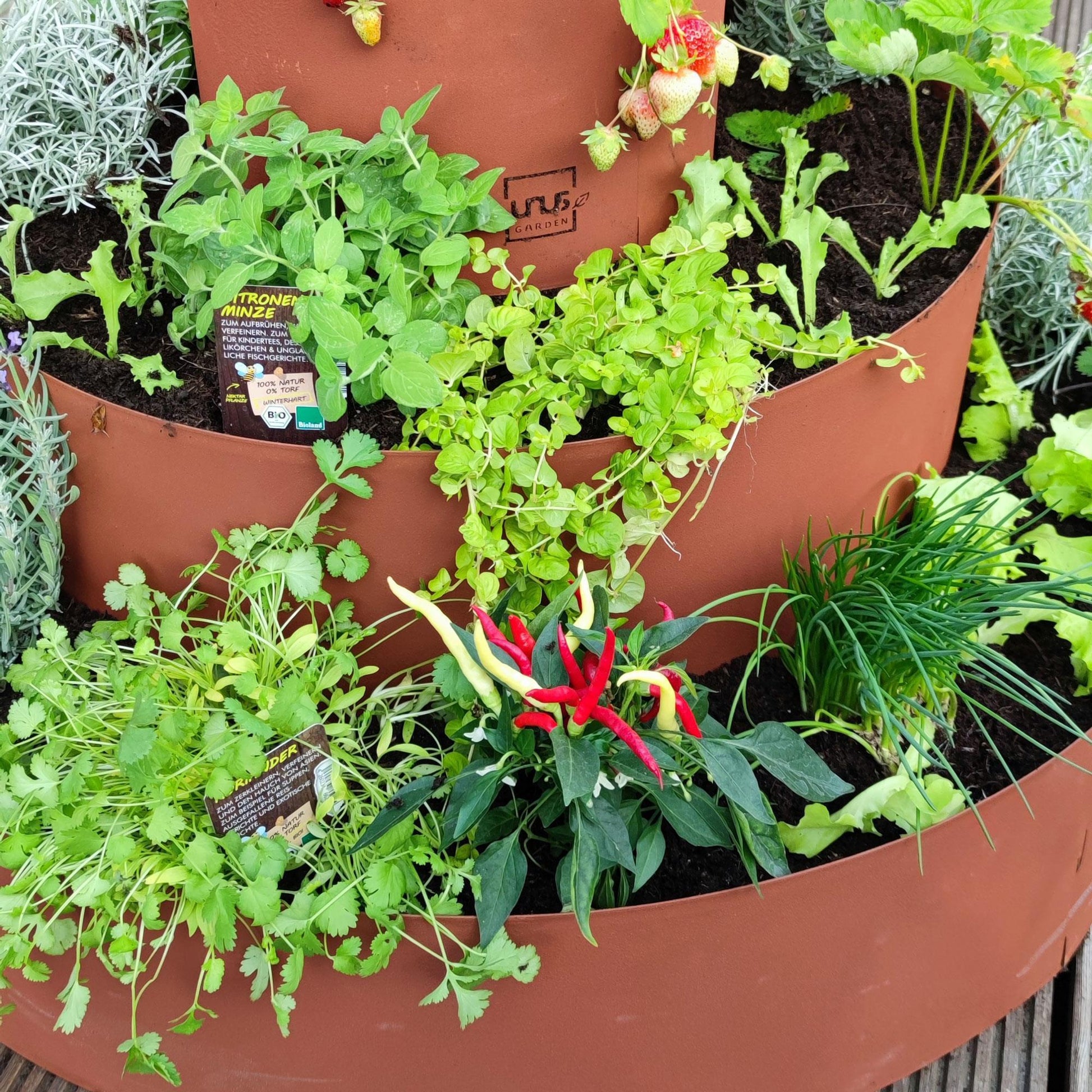 Die drei Ebenen mit Durchmessern bieten Raum für eine Fülle von Kräutern mit unterschiedlichen Wachstumsansprüchen, sowie für farbenfrohe Blumen. Bringen Sie Basilikum, Thymian, Oregano, wunderschöne Blüten oder erfrischende Beeren in Ihre eigene Kräuteroase.