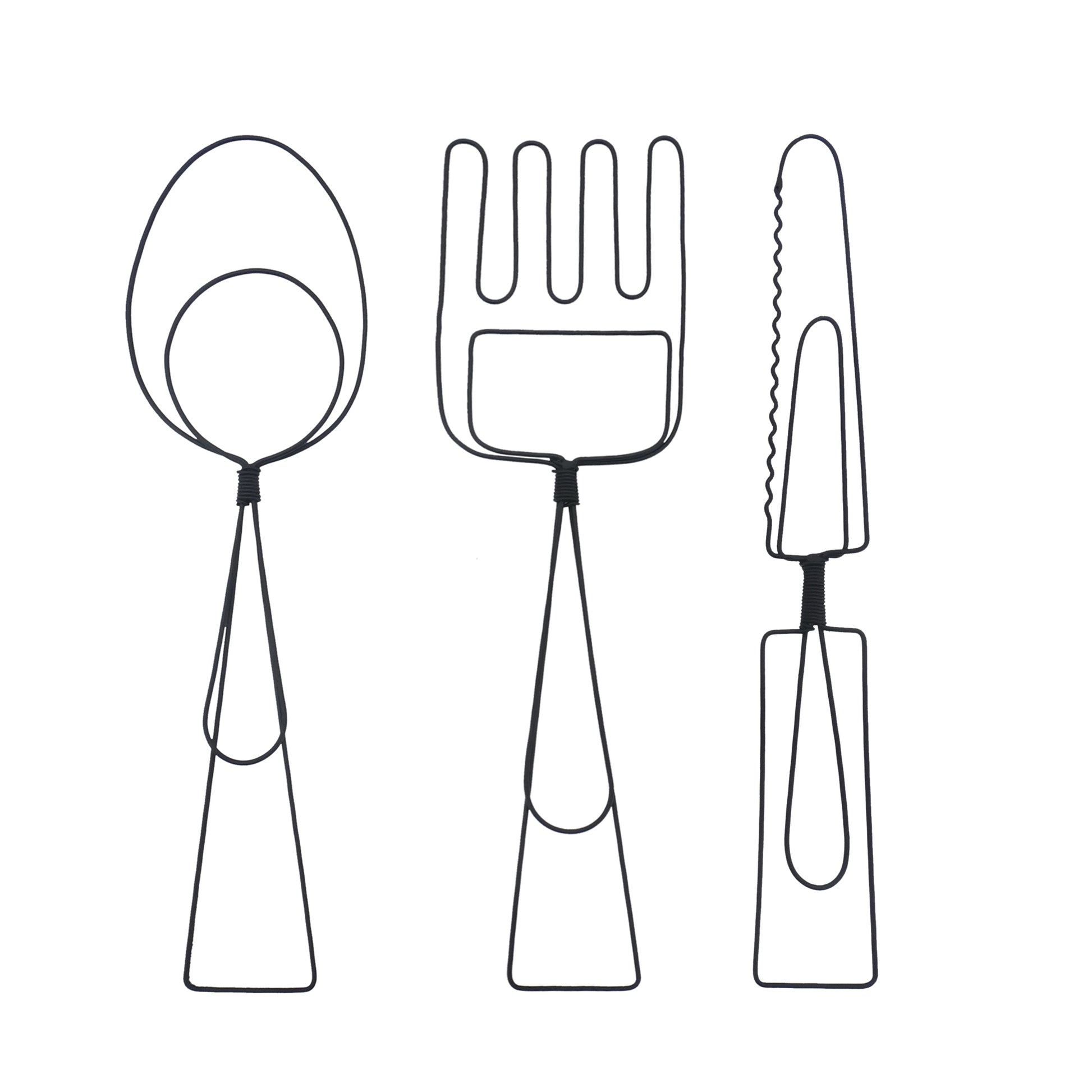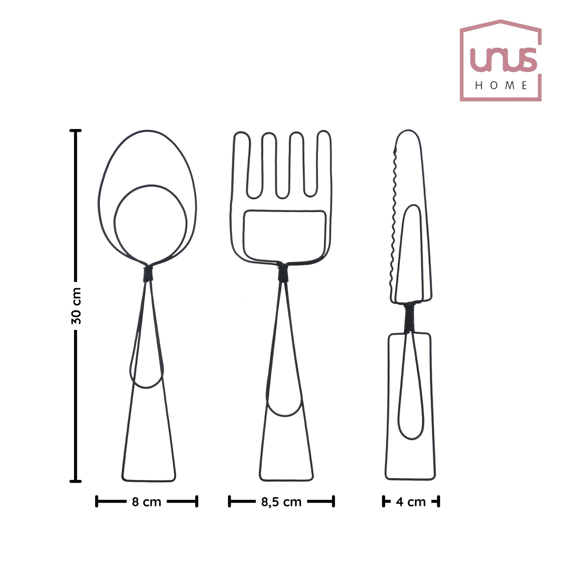 Das UNUS® Wandbild-Set im Mini-Format besteht aus Messer, Gabel und Löffel – modern und reduziert interpretiert mit klaren Linien aus stabilem Metalldraht. Jedes Teil ist ca. 30 cm hoch: der Löffel misst ca. 30 x 8 cm, die Gabel ca. 30 x 8,5 cm und das Messer ca. 30 x 4 cm. Perfekt für kleine Wandflächen, als Ergänzung zu größeren Dekoobjekten oder als liebevolles Geschenk für Kochbegeisterte.