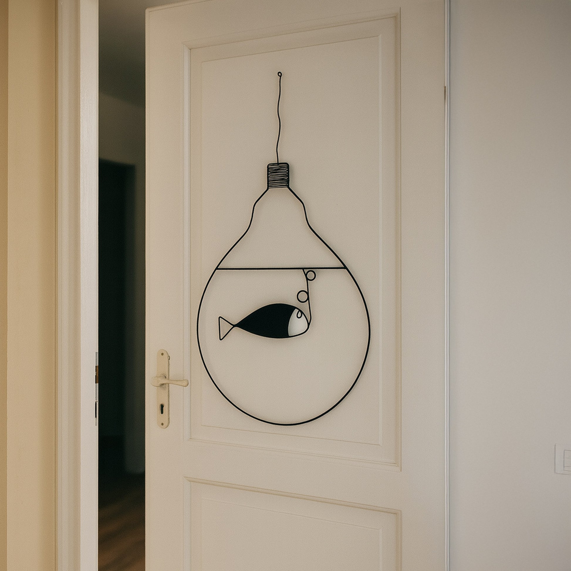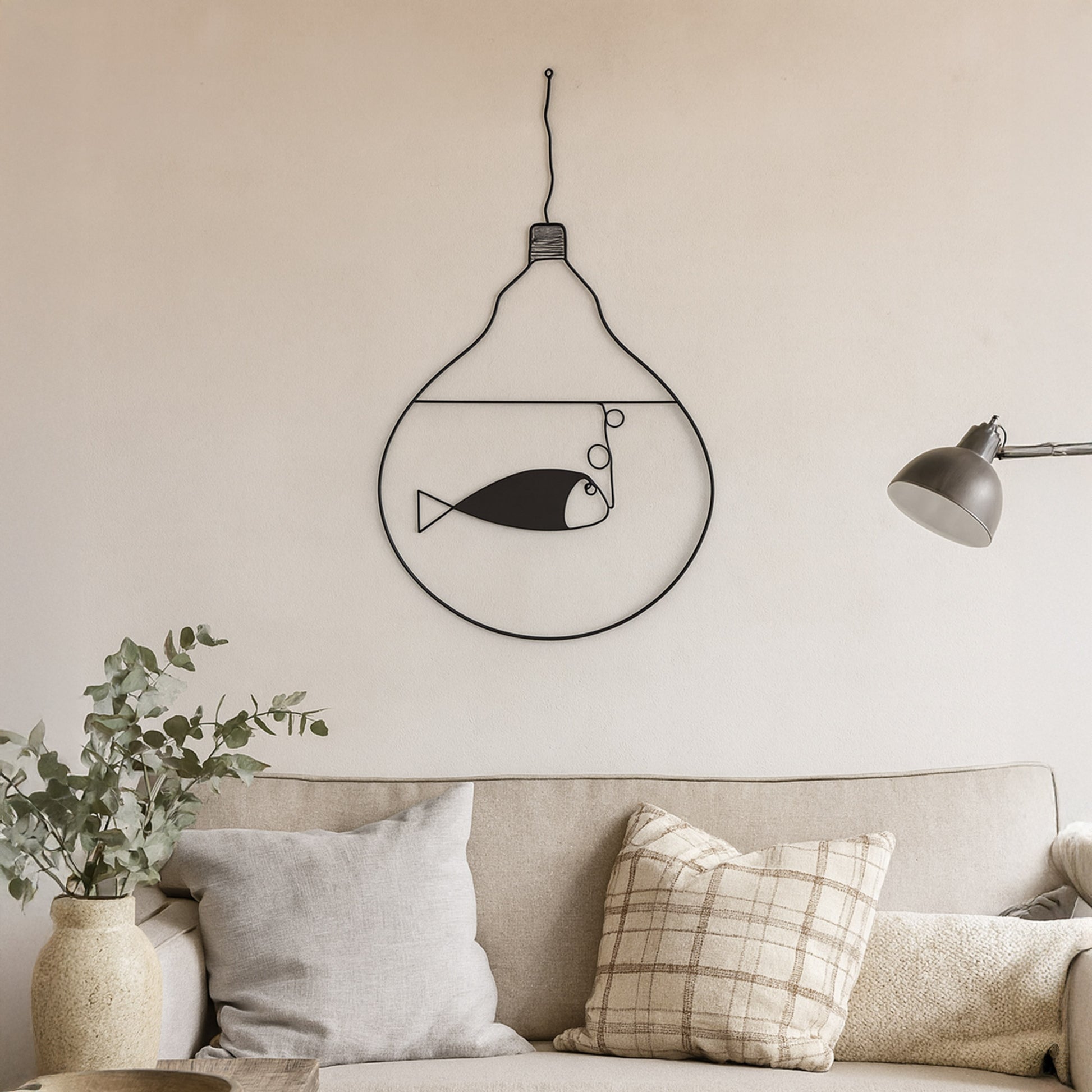 - Wanddeko aus schwarzem Metalldraht in Form einer Glühbirne mit Fisch
