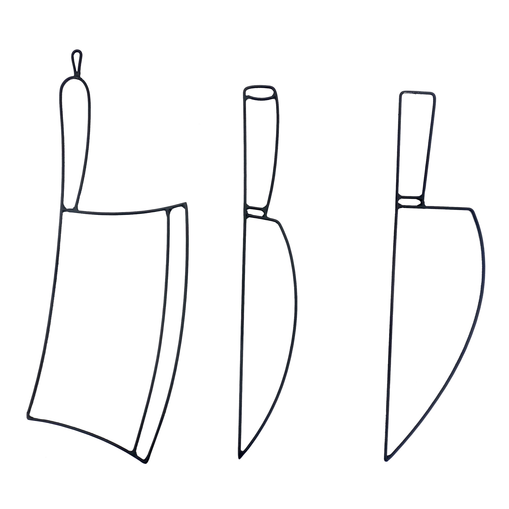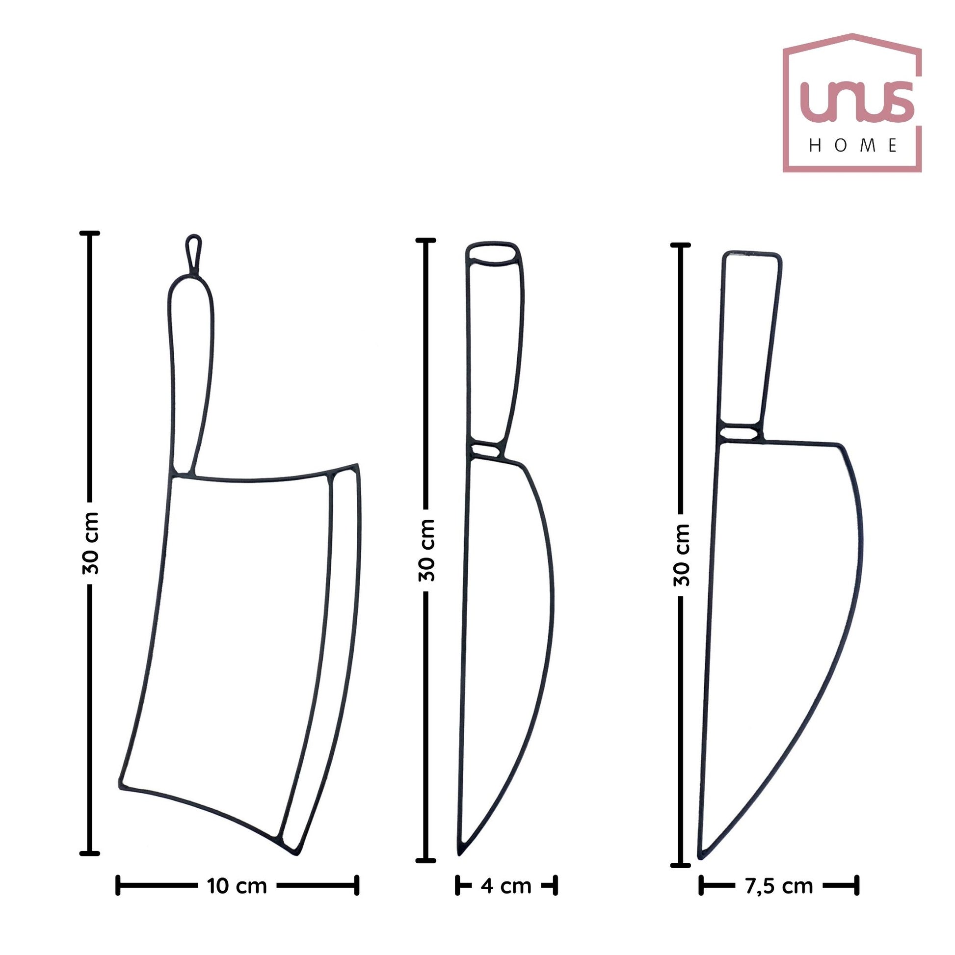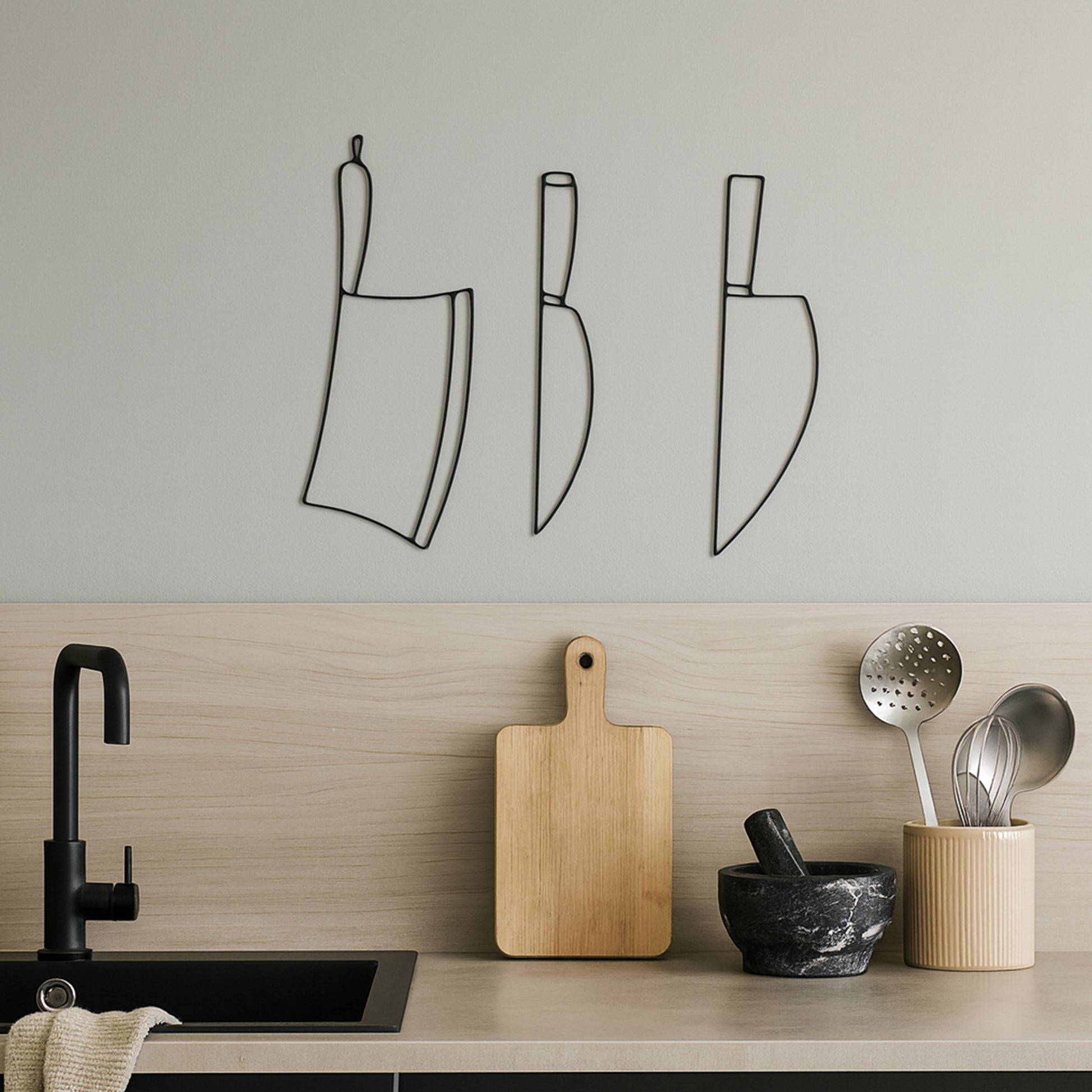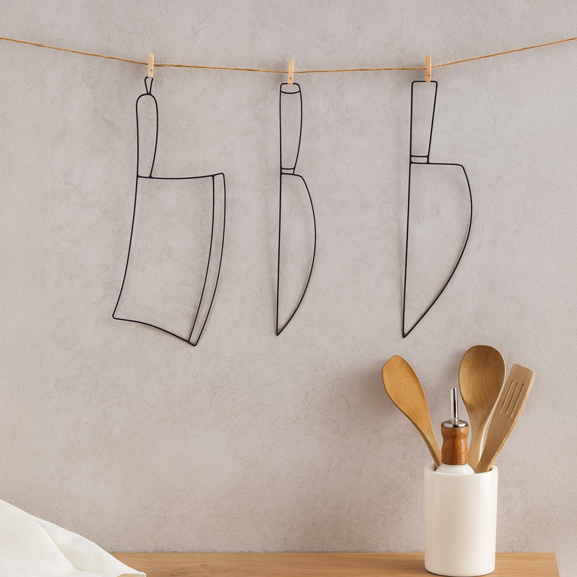 Die drei stilisierten Messerformen – Hackmesser, Filetiermesser und Kochmesser – wurden aus stabilem Metalldraht geformt und bringen eine dekorative, zugleich reduzierte Ästhetik an die Wand. Mit einer Höhe von ca. 30 cm wirken die Messer als harmonisches Set. Das Hackmesser misst ca. 30 x 10 cm, das Filetiermesser ca. 30 x 4 cm und das Kochmesser ca. 30 x 7,5 cm. Ob einzeln platziert oder gemeinsam arrangiert: Dieses Set sorgt für eine stilvolle Atmosphäre, in der Kochen zur Leidenschaft wird.