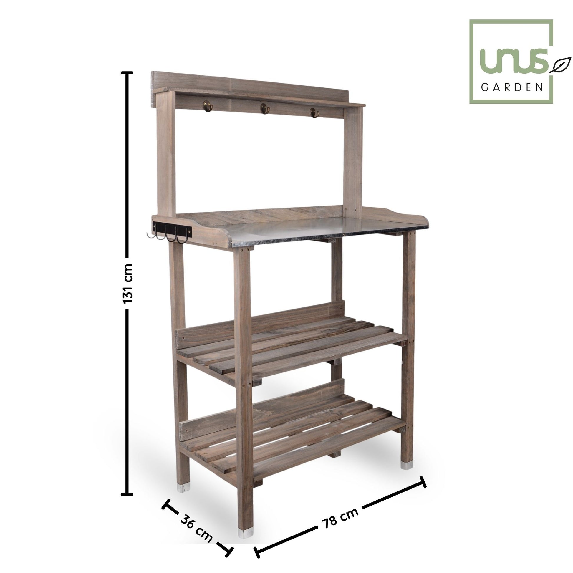 Holz Pflanztisch / Gärtnertisch / Pflanzregal 78 cm x 36 cm x 131 cm – mit Gerätehaken und 2 Böden