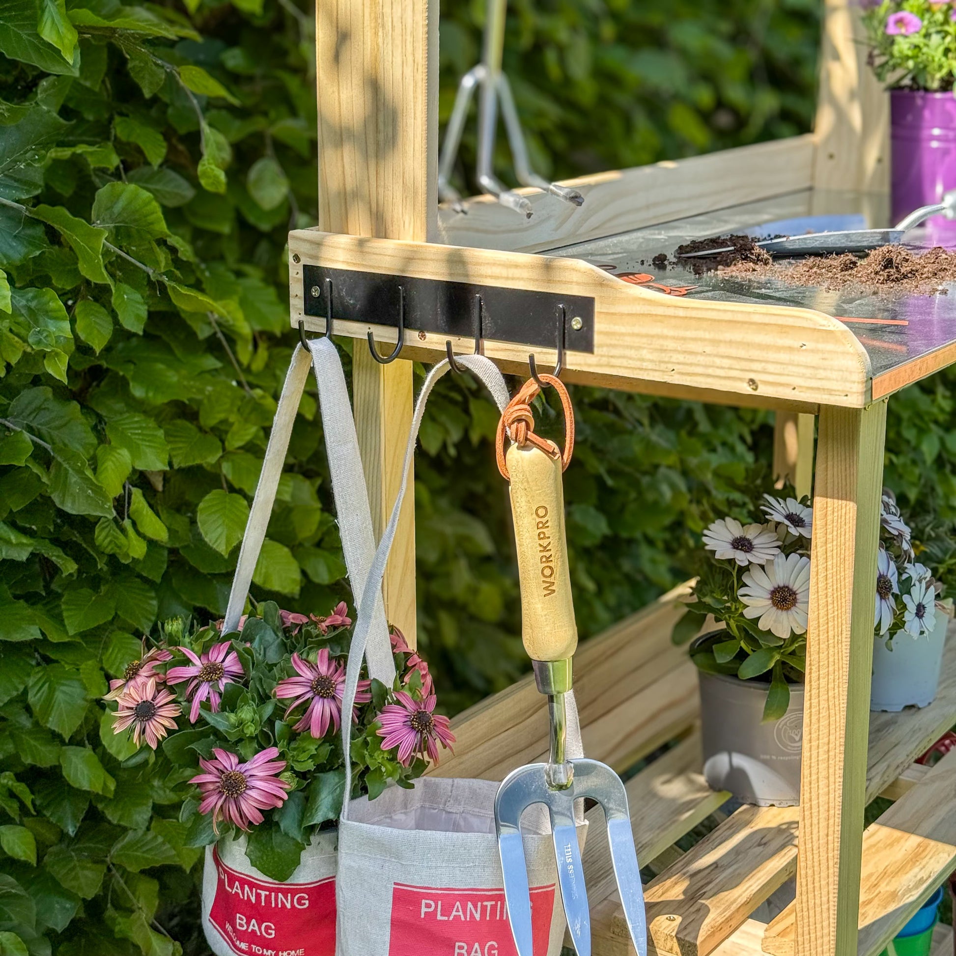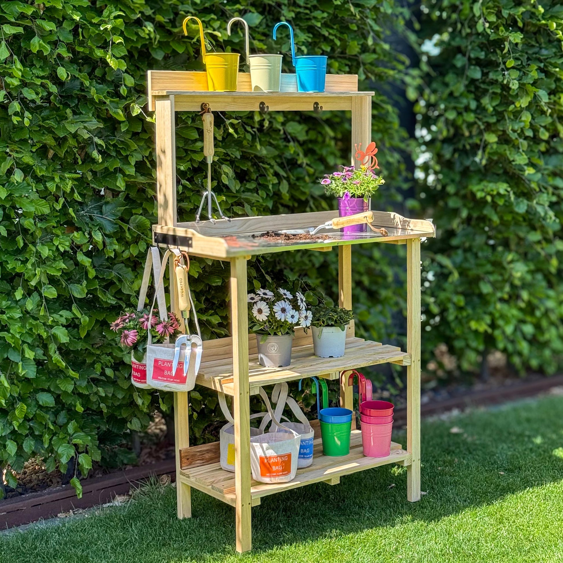 Dieser Pflanztisch aus Holz in stabiler Ausführung darf in keinem Garten fehlen. Mit diesem universellen Gärtnertisch arbeiten Sie in optimaler Höhe mit Ihren Pflanzen. Das schont den Rücken und beugt Ermüdung vor. Dank der Gerätehaken und den 2 Böden erhalten Sie einen praktischen Helfer mit genügend Platz für allerlei Werkzeug und Utensilien.