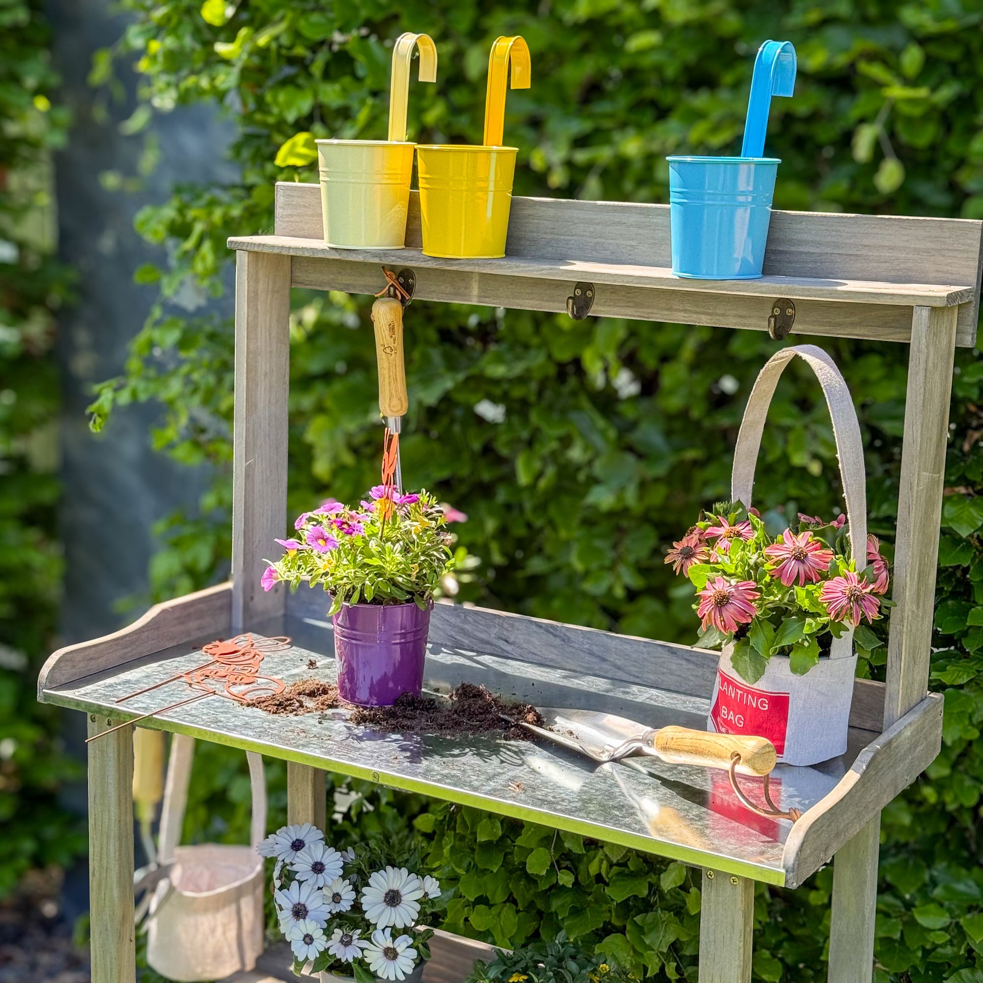 Der Pflanztisch wird ohne Zubehör (z. B. Schaufeln) und Dekoration (z. B. Blumenerde, Pflanzen) geliefert.