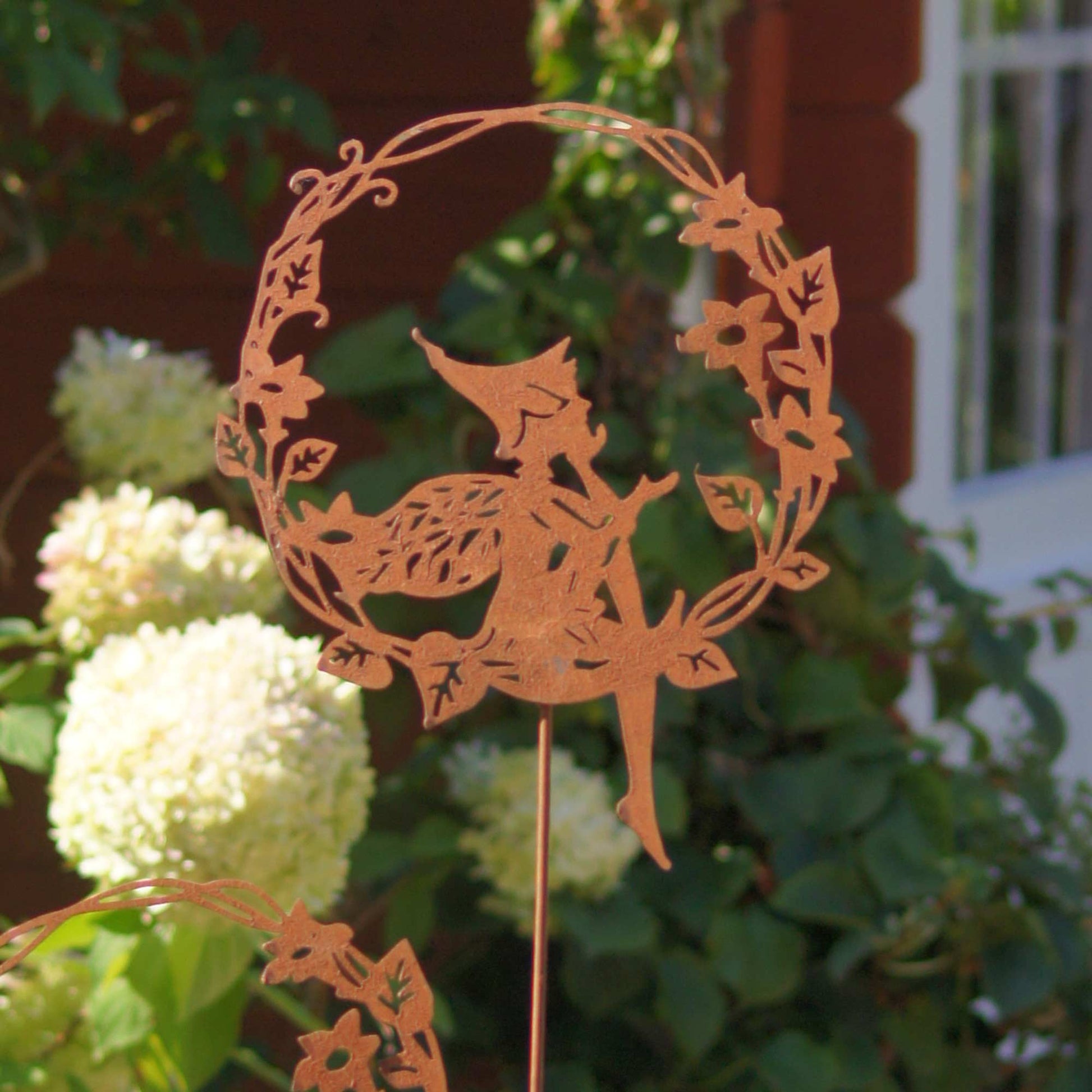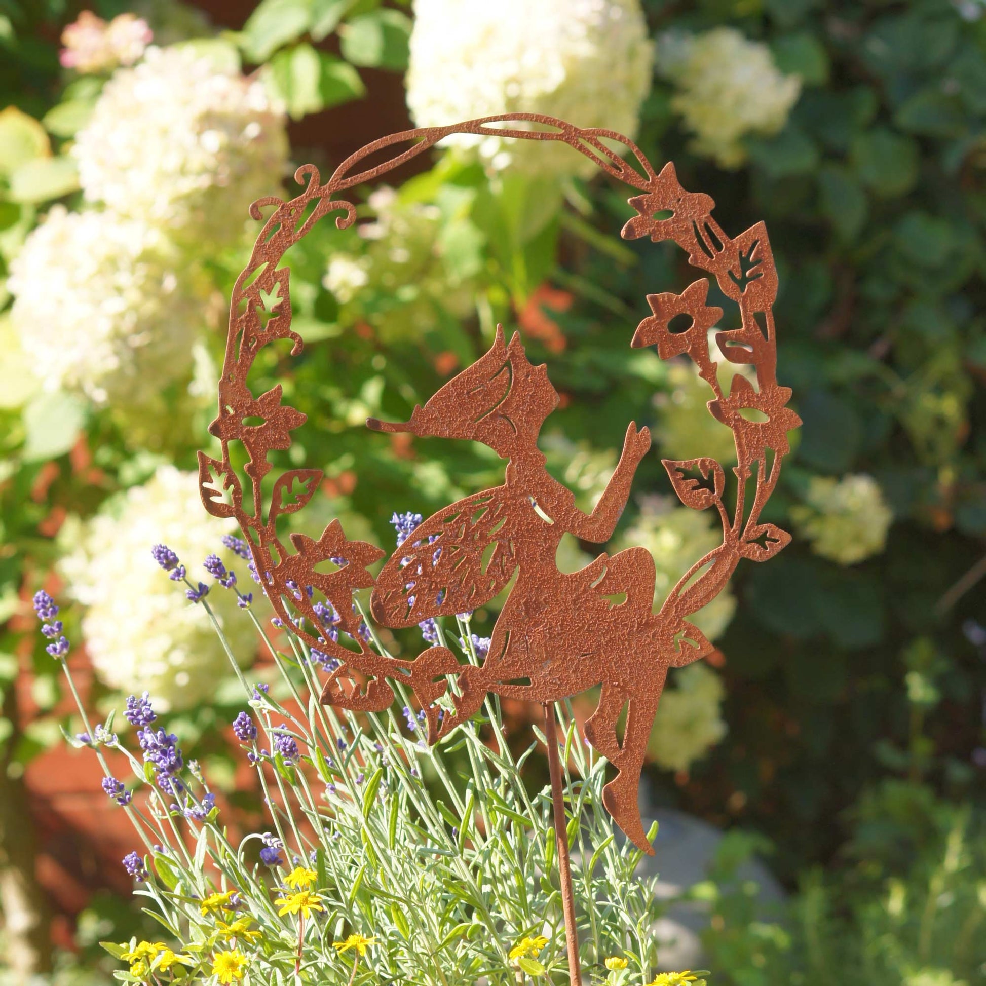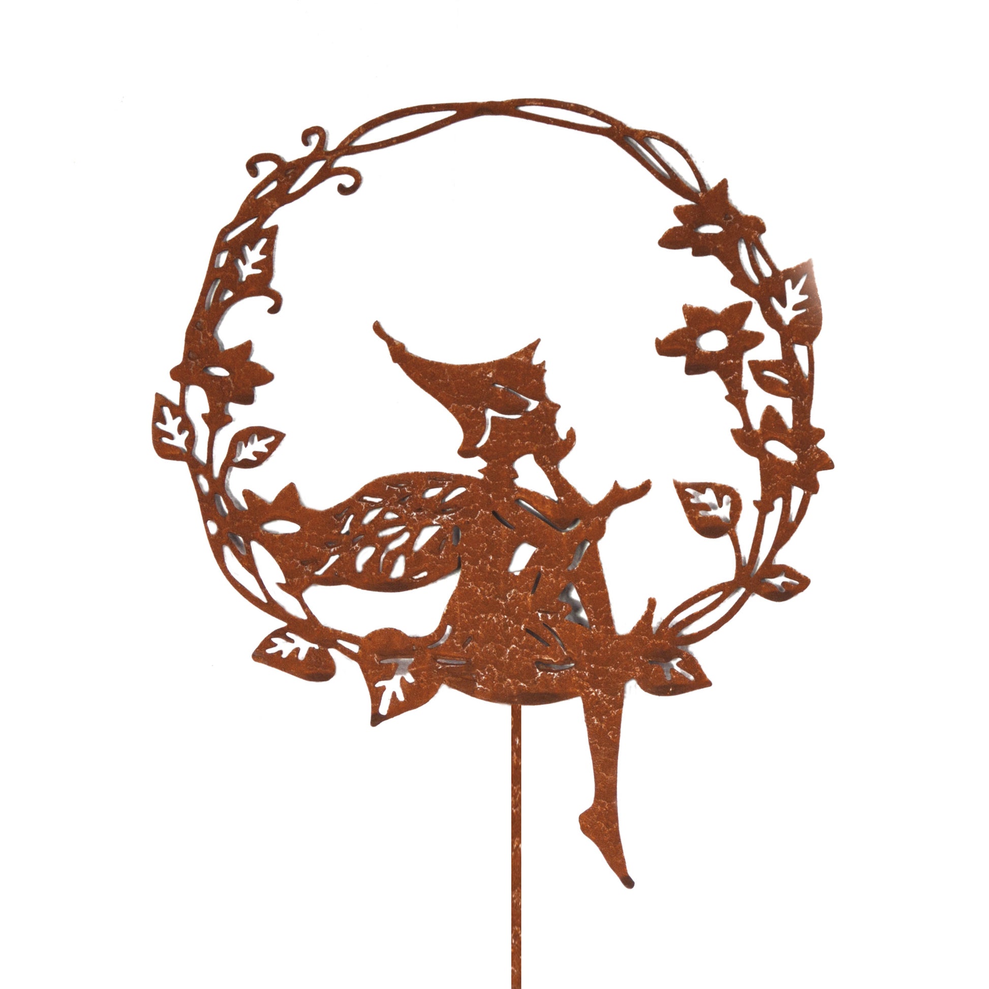 Die Gartenstecker bestehen aus robustem und hochwertigen Metall mit einer einzigartigen Rostoptik. Die Roststecker sind witterungsfest und frostfest. Sie können sie das ganze Jahr über draußen stehen lassen. Die rostigen Figuren eignen sich auch hervorragend als außergewöhnliches und kreatives Geschenk für Gartenfreunde und Dekofans! Die Pflanzenstecker werden mit Standstab geliefert und lassen sich ganz bequem und unkompliziert aufstellen. Die Roststecker mit dem Motiv einer Elfe verleihen Ihrem Garten oder Blumenbeet einen märchenhaften Charme und ziehen die Blicke Ihrer Nachbarn auf sich. Lassen sie sich von der schönen Elfe verzaubern!