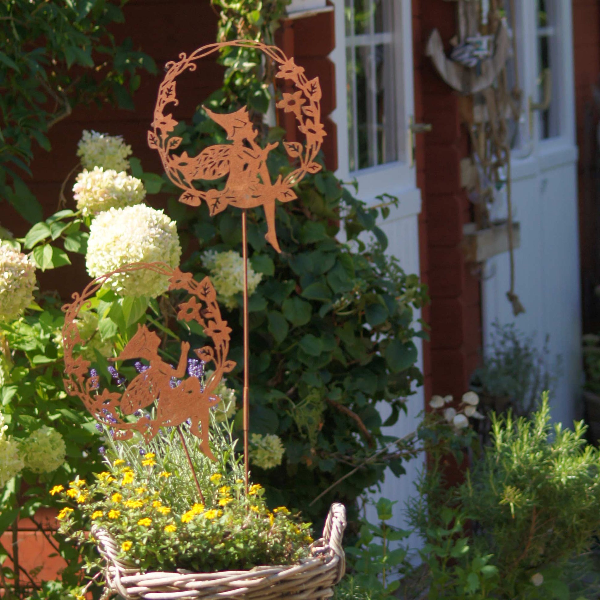 Der Sommer steht vor der Tür und die warmen Tage im Garten, auf dem Balkon oder der Terrasse können kommen! Machen Sie Ihren Garten oder Ihre Blumentöpfe mit unserem dekorativen Gartenstecker aus Edelrost noch schöner. Die wunderschönen Pflanzenstecker mit Elfe lassen sich in fast jeder Umgebung integrieren. Sie sind vor allem als hübsche Dekoration für Ihren Garten geeignet, machen sich aber auch gut auf der Terrasse, dem Balkon oder im Wohnzimmer. Die kunstvoll gezeichneten, feinen Formen bringen das gewisse Etwas in Ihren Garten oder in Ihr Blumenbeet. Die Handhabung der Stecker ist kinderleicht. Einfach die Roststecker in die Erde drücken und schon ist Ihr Garten oder Ihr Balkon dekoriert.