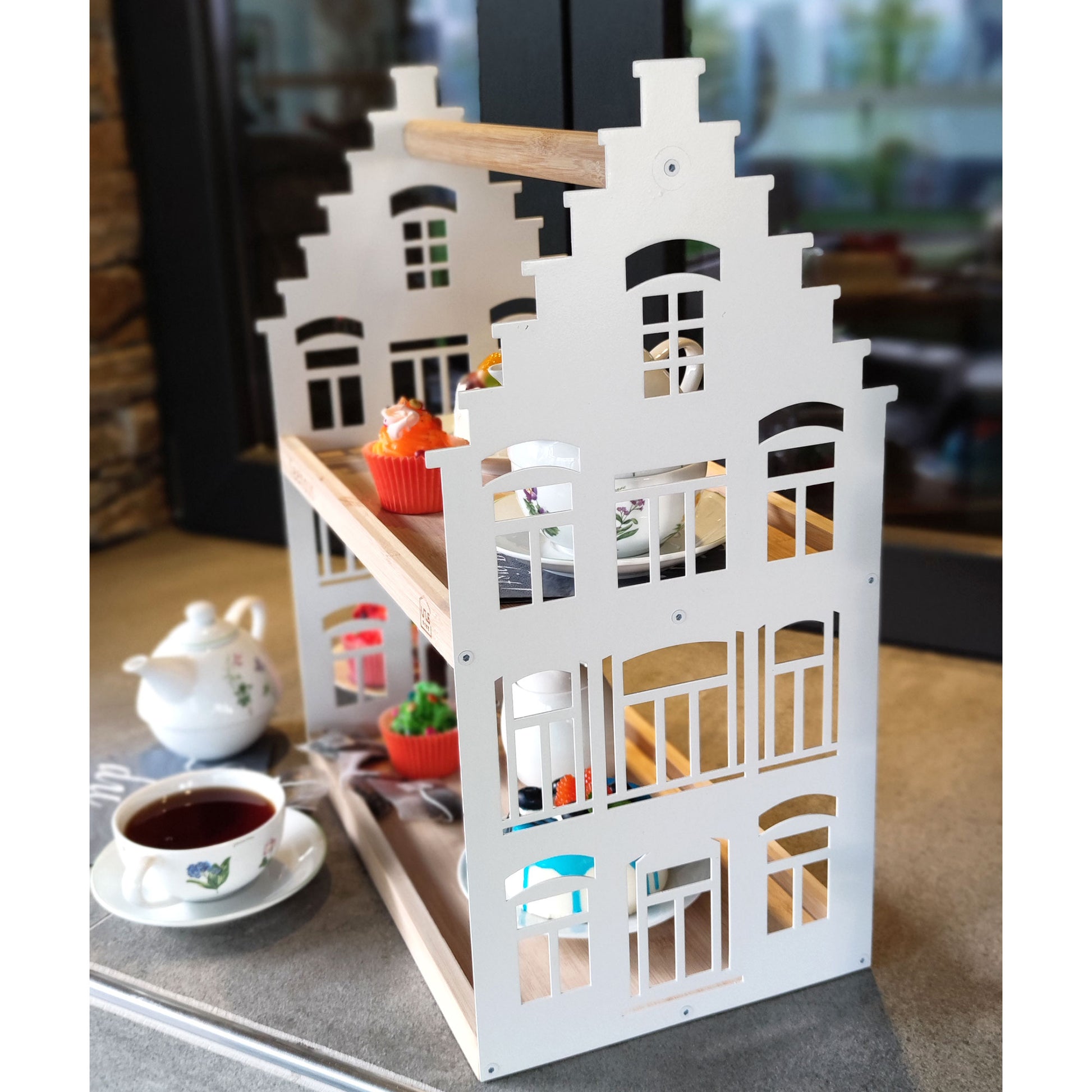 Die Etagere verfügt über zwei Ebenen, auf denen Sie Ihre Teekanne und Teetassen stilvoll präsentieren können. Der Griff aus robustem Holz ermöglicht es Ihnen zudem, die Etagere bequem zu tragen und zu verschieben.