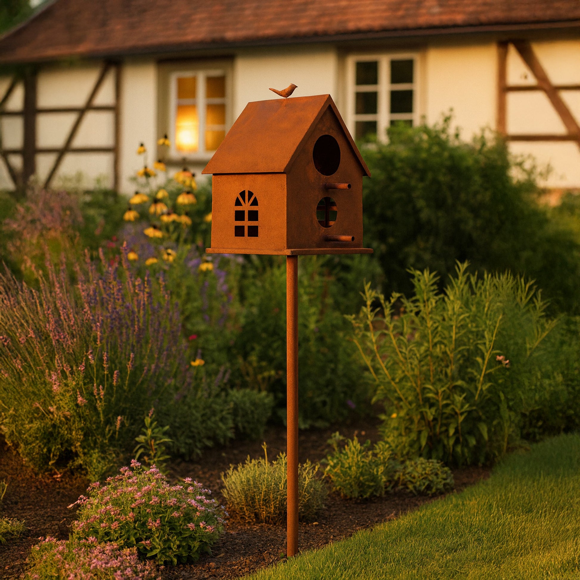 UNUS® Vogelhaus mit Stab in edlem Rostmetall– dekorative Gartenkunst mit Charme