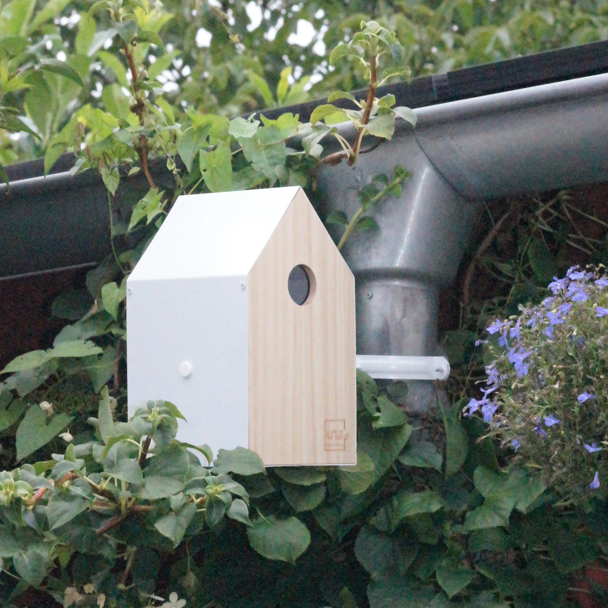 Vogelhaus aus Holz und Metall mit vielseitigen Befestigungsmöglichkeiten für unten oder seitlich weiß oder grau