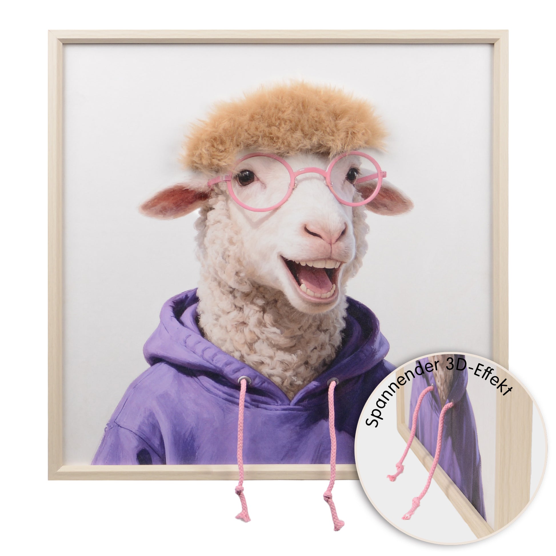 Wall Art 3D Hairfusion Schaf mit lila Hoodie und Brille in pink 60x60
