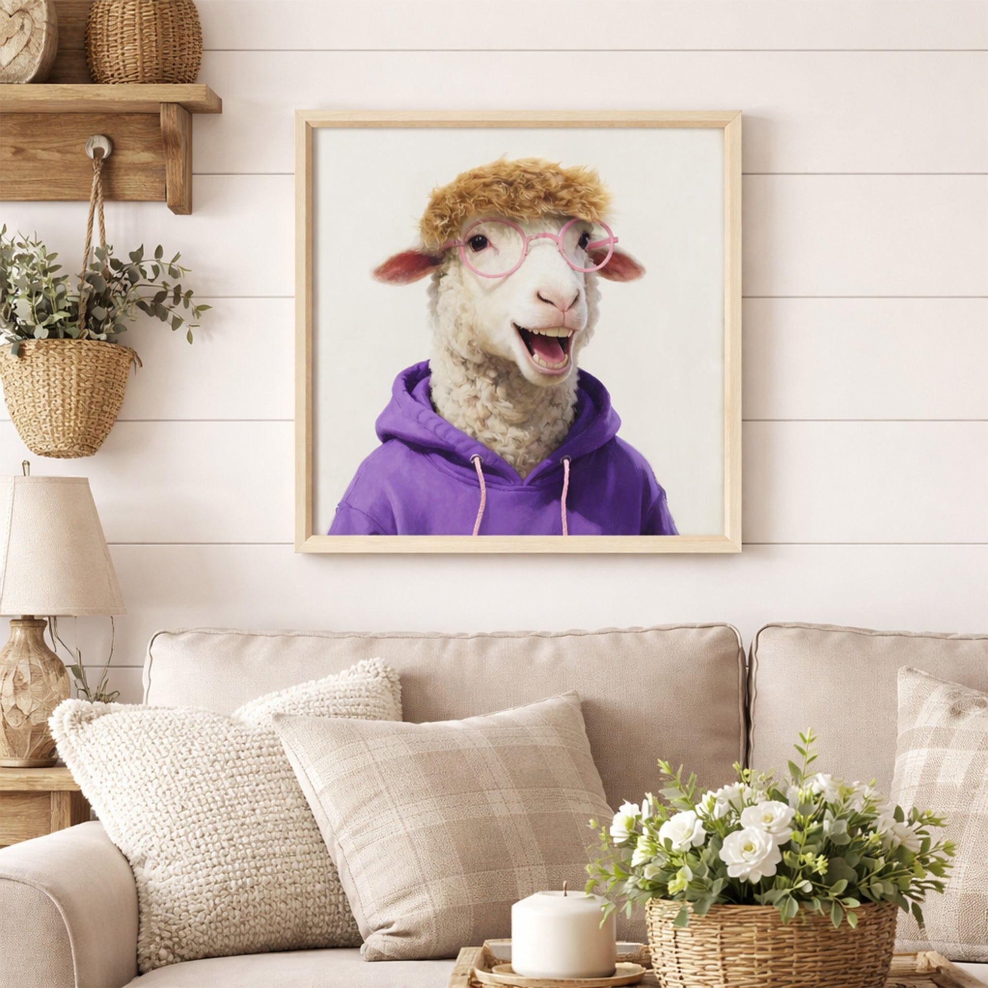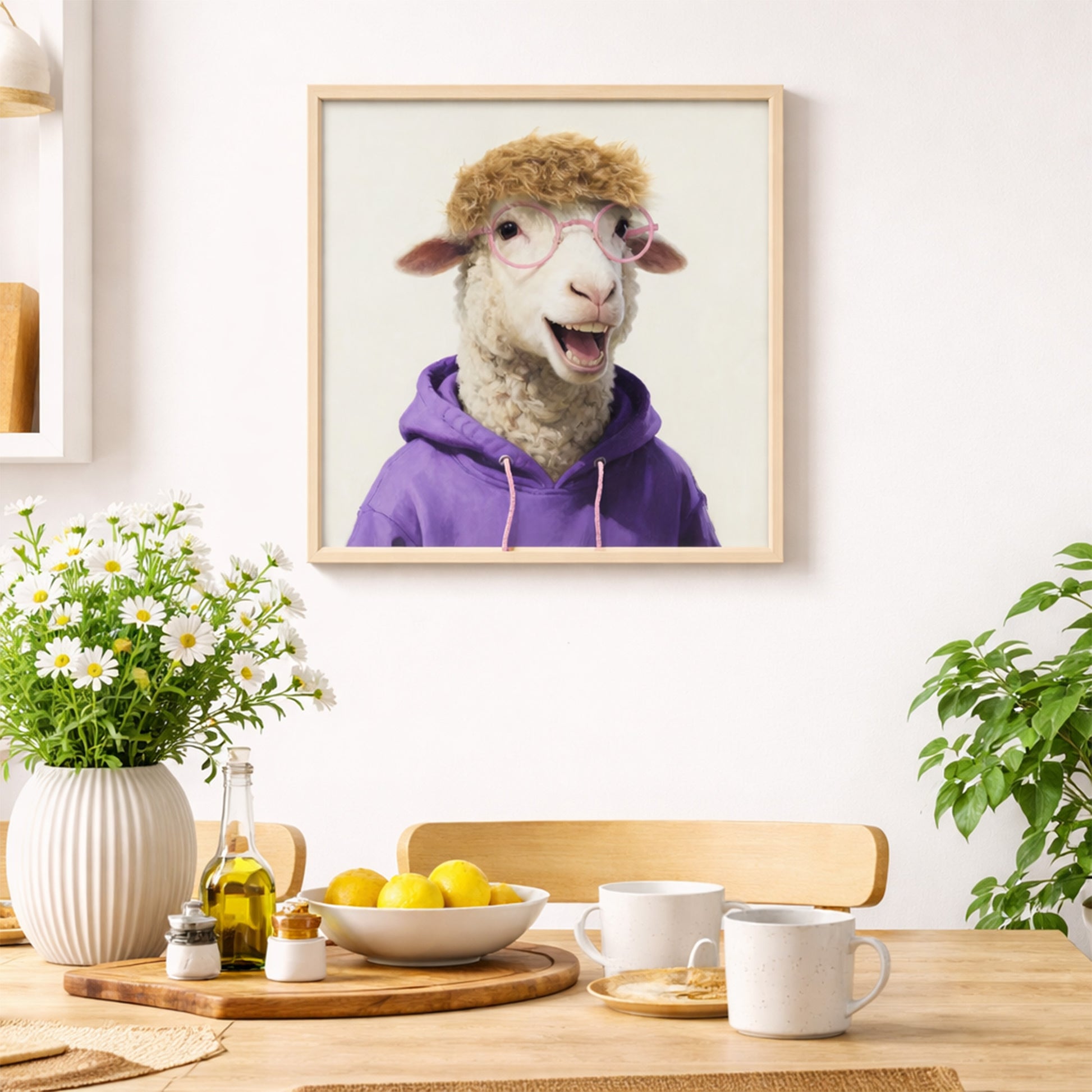 Dieses besondere UNUS Hairfusion Wandbild zeigt ein Schaf in moderner Darstellung mit Hoodie. Die Kombination aus humorvollem Tiermotiv und zeitgemäßem Design macht das Bild zu einem außergewöhnlichen Blickfang für moderne Wohnräume.